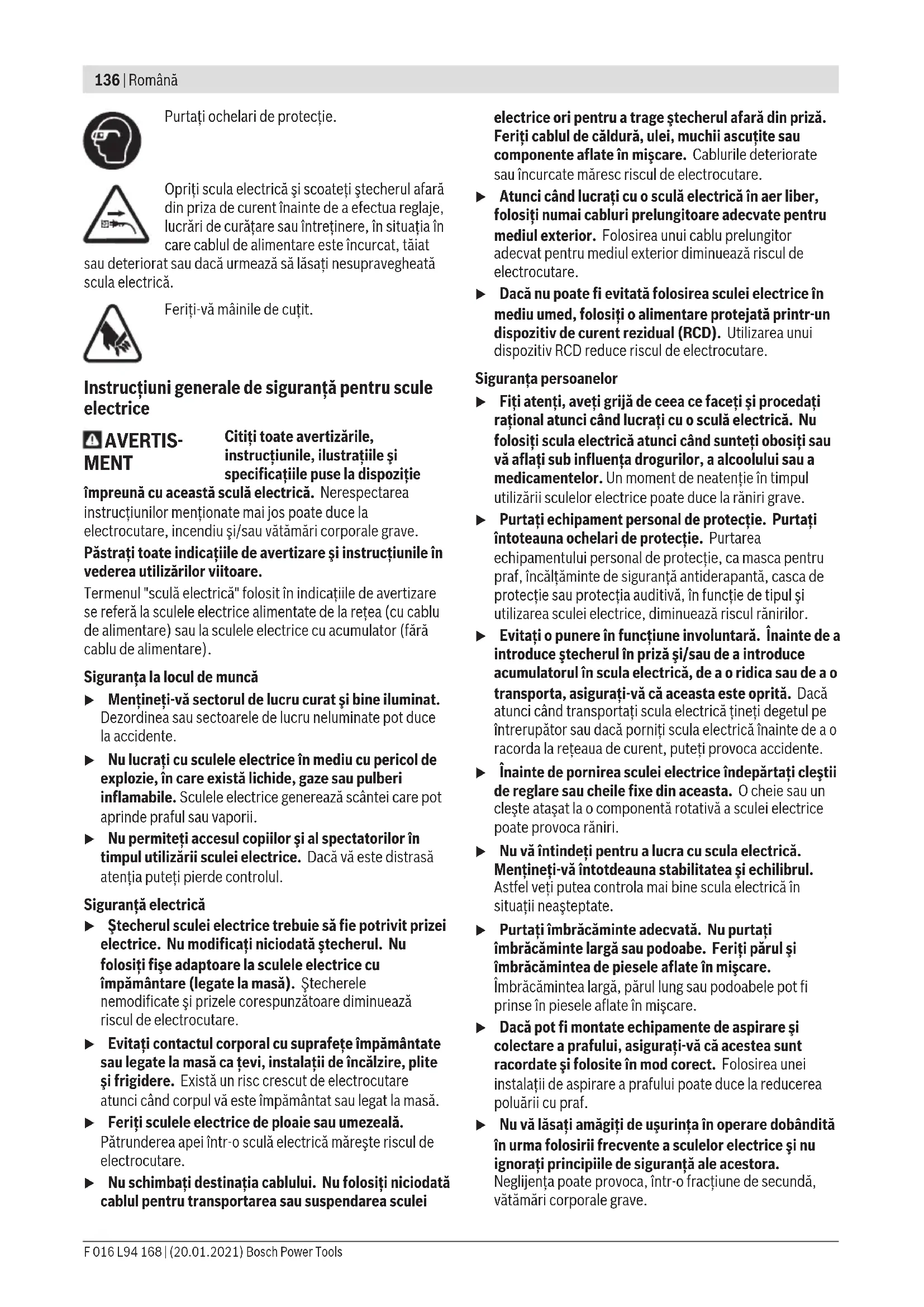 – электр құралына артық жүктеме түскеннен орын алған ақаулар. (Құралға артық жүктеме түсудің шартсыз белгілеріне мыналар жатады: құбылу түсінің пайда болуы немесе электр құралы бөліктері мен түйіндерінің деформациясы немесе қорытылуы, жоғары температура әсерінен электр қозғалтқышындағы сымдар оқшаулағышының қараюы немесе көмірленуі.) Кәдеге жарату Бақ электр бұйымдарын, қосымша бөлшектер мен қорапшаларды қоршаған ортаға зиян келдірмейтіндей түрде кәдеге жарату қажет. Бақ электр бұйымдарын тұрмыстық үй қалдықтар контейнеріне салмаңыз! Тек қана ЕО елдері үшін: Электр және электрондық ескі құралдар бойынша Еуропа Одағының 2012/19/EU директивасы мен оның мемлекеттік заңдарға енгізіліп пайдалануына сай, қолдану үшін жарамсыз болып қалған электр құралдары іріктеліп жиналып, қоршаған ортаға зиян келдірмейтін түрде кәдеге жаратылуы тиіс. Română Instrucţiuni de siguranţă Explicarea simbolurilor Citiţi instrucţiunile de folosire. A nu se folosi pe timp de ploaie. Bosch Power Tools F 016 L94 168 | (20.01.2021)136 | Română Purtați ochelari de protecție. Opriţi scula electrică şi scoateţi ştecherul afară din priza de curent înainte de a efectua reglaje, lucrări de curăţare sau întreţinere, în situaţia în care cablul de alimentare este încurcat, tăiat sau deteriorat sau dacă urmează să lăsaţi nesupravegheată scula electrică. Feriți-vă mâinile de cuțit. Instrucţiuni generale de siguranţă pentru scule electrice AVERTIS- MENT Citiţi toate avertizările, instrucţiunile, ilustraţiile şi specificaţiile puse la dispoziţie împreună cu această sculă electrică. Nerespectarea instrucţiunilor menţionate mai jos poate duce la electrocutare, incendiu şi/sau vătămări corporale grave. Păstraţi toate indicaţiile de avertizare şi instrucţiunile în vederea utilizărilor viitoare. Termenul "sculă electrică" folosit în indicaţiile de avertizare se referă la sculele electrice alimentate de la reţea (cu cablu de alimentare) sau la sculele electrice cu acumulator (fără cablu de alimentare). Siguranţa la locul de muncă u Menţineţi‑vă sectorul de lucru curat şi bine iluminat. Dezordinea sau sectoarele de lucru neluminate pot duce la accidente. u Nu lucraţi cu sculele electrice în mediu cu pericol de explozie, în care există lichide, gaze sau pulberi inflamabile. Sculele electrice generează scântei care pot aprinde praful sau vaporii. u Nu permiteţi accesul copiilor şi al spectatorilor în timpul utilizării sculei electrice. Dacă vă este distrasă atenţia puteţi pierde controlul. Siguranţă electrică u Ştecherul sculei electrice trebuie să fie potrivit prizei electrice. Nu modificaţi niciodată ştecherul. Nu folosiţi fişe adaptoare la sculele electrice cu împământare (legate la masă). Ştecherele nemodificate şi prizele corespunzătoare diminuează riscul de electrocutare. u Evitaţi contactul corporal cu suprafeţe împământate sau legate la masă ca ţevi, instalaţii de încălzire, plite şi frigidere. Există un risc crescut de electrocutare atunci când corpul vă este împământat sau legat la masă. u Feriţi sculele electrice de ploaie sau umezeală. Pătrunderea apei într‑o sculă electrică măreşte riscul de electrocutare. u Nu schimbaţi destinaţia cablului. Nu folosiţi niciodată cablul pentru transportarea sau suspendarea sculei electrice ori pentru a trage ştecherul afară din priză. Feriţi cablul de căldură, ulei, muchii ascuţite sau componente aflate în mişcare. Cablurile deteriorate sau încurcate măresc riscul de electrocutare. u Atunci când lucraţi cu o sculă electrică în aer liber, folosiţi numai cabluri prelungitoare adecvate pentru mediul exterior. Folosirea unui cablu prelungitor adecvat pentru mediul exterior diminuează riscul de electrocutare. u Dacă nu poate fi evitată folosirea sculei electrice în mediu umed, folosiţi o alimentare protejată printr-un dispozitiv de curent rezidual (RCD). Utilizarea unui dispozitiv RCD reduce riscul de electrocutare. Siguranţa persoanelor u Fiţi atenţi, aveţi grijă de ceea ce faceţi şi procedaţi raţional atunci când lucraţi cu o sculă electrică. Nu folosiţi scula electrică atunci când sunteţi obosiţi sau vă aflaţi sub influenţa drogurilor, a alcoolului sau a medicamentelor. Un moment de neatenţie în timpul utilizării sculelor electrice poate duce la răniri grave. u Purtaţi echipament personal de protecţie. Purtaţi întoteauna ochelari de protecţie. Purtarea echipamentului personal de protecţie, ca masca pentru praf, încălţăminte de siguranţă antiderapantă, casca de protecţie sau protecţia auditivă, în funcţie de tipul şi utilizarea sculei electrice, diminuează riscul rănirilor. u Evitaţi o punere în funcţiune involuntară. Înainte de a introduce ştecherul în priză şi/sau de a introduce acumulatorul în scula electrică, de a o ridica sau de a o transporta, asiguraţi‑vă că aceasta este oprită. Dacă atunci când transportaţi scula electrică ţineţi degetul pe întrerupător sau dacă porniţi scula electrică înainte de a o racorda la reţeaua de curent, puteţi provoca accidente. u Înainte de pornirea sculei electrice îndepărtaţi cleştii de reglare sau cheile fixe 