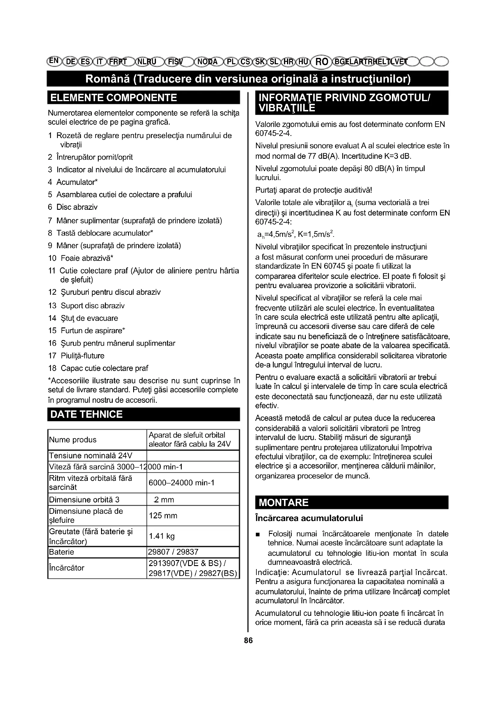BG EL AR TR HE LT LV ET ELEMENTE COMPONENTE Numerotarea elementelor componente se referă la schiţa sculei electrice de pe pagina gracă. 1 Rozetă de reglare pentru preselecţia numărului de vibraţii 2 Întrerupător pornit/oprit 3 Indicator al nivelului de încărcare al acumulatorului 4 Acumulator* 5 Asamblarea cutiei de colectare a prafului 6 Disc abraziv 7 Mâner suplimentar (suprafaţă de prindere izolată) 8 Tastă deblocare acumulator* 9 Mâner (suprafaţă de prindere izolată) 10 Foaie abrazivă* 11 Cutie colectare praf (Ajutor de aliniere pentru hârtia de şlefuit) 12 Şuruburi pentru discul abraziv 13 Suport disc abraziv 14 Ştuţ de evacuare 15 Furtun de aspirare* 16 Şurub pentru mânerul suplimentar 17 Piuliţă-uture 18 Capac cutie colectare praf *Accesoriile ilustrate sau descrise nu sunt cuprinse în setul de livrare standard. Puteţi găsi accesoriile complete în programul nostru de accesorii. DATE TEHNICE Nume produs Aparat de slefuit orbital aleator fără cablu la 24V Tensiune nominală 24V Viteză fără sarcină 3000–12000 min-1 Ritm viteză orbitală fără sarcinăt 6000–24000 min-1 Dimensiune orbită 3