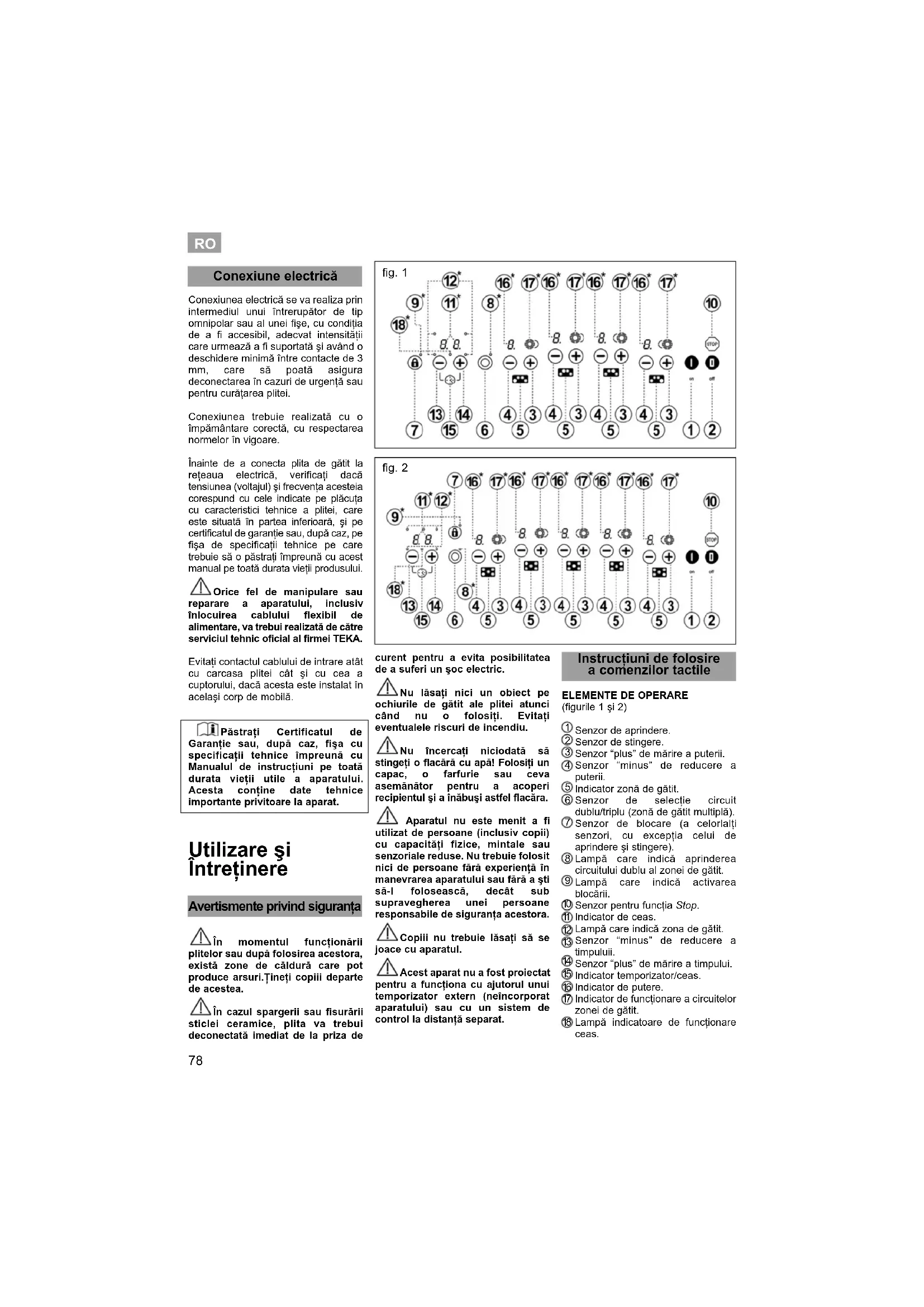 SK78 Conexiune electrică Conexiunea electrică se va realiza prin intermediul unui întrerupător de tip omnipolar sau al unei fişe, cu condiţia de a fi accesibil, adecvat intensităţii care urmează a fi suportată şi având o deschidere minimă între contacte de 3 mm, care să poată asigura deconectarea în cazuri de urgenţă sau pentru curăţarea plitei. Conexiunea trebuie realizată cu o împământare corectă, cu respectarea normelor în vigoare. Înainte de a conecta plita de gătit la reţeaua electrică, verificaţi dacă tensiunea (voltajul) şi frecvenţa acesteia corespund cu cele indicate pe plăcuţa cu caracteristici tehnice a plitei, care este situată în partea inferioară, şi pe certificatul de garanţie sau, după caz, pe fişa de specificaţii tehnice pe care trebuie să o păstraţi împreună cu acest manual pe toată durata vieţii produsului. Orice fel de manipulare sau reparare a aparatului, inclusiv înlocuirea cablului flexibil de alimentare, va trebui realizată de către serviciul tehnic oficial al firmei TEKA. Evitaţi contactul cablului de intrare atât cu carcasa plitei cât şi cu cea a cuptorului, dacă acesta este instalat în acelaşi corp de mobilă. Păstraţi Certificatul de Garanţie sau, după caz, fişa cu specificaţii tehnice împreună cu Manualul de instrucţiuni pe toată durata vieţii utile a aparatului. Acesta conţine date tehnice importante privitoare la aparat. Utilizare şi Întreţinere Avertismente privind siguranţa În momentul funcţionării plitelor sau după folosirea acestora, există zone de căldură care pot produce arsuri.Ţineţi copiii departe de acestea. În cazul spargerii sau fisurării sticlei ceramice, plita va trebui deconectată imediat de la priza de curent pentru a evita posibilitatea de a suferi un şoc electric. Nu lăsaţi nici un obiect pe ochiurile de gătit ale plitei atunci când nu o folosiţi. Evitaţi eventualele riscuri de incendiu. Nu încercaţi niciodată să stingeţi o flacără cu apă! Folosiţi un capac, o farfurie sau ceva asemănător pentru a acoperi recipientul şi a înăbuşi astfel flacăra. Aparatul nu este menit a fi utilizat de persoane (inclusiv copii) cu capacităţi fizice, mintale sau senzoriale reduse. Nu trebuie folosit nici de persoane fără experienţă în manevrarea aparatului sau fără a şti să-l folosească, decât sub supravegherea unei persoane responsabile de siguranţa acestora. Copiii nu trebuie lăsaţi să se joace cu aparatul. Acest aparat nu a fost proiectat pentru a funcţiona cu ajutorul unui temporizator extern (neîncorporat aparatului) sau cu un sistem de control la distanţă separat. Instrucţiuni de folosire a comenzilor tactile