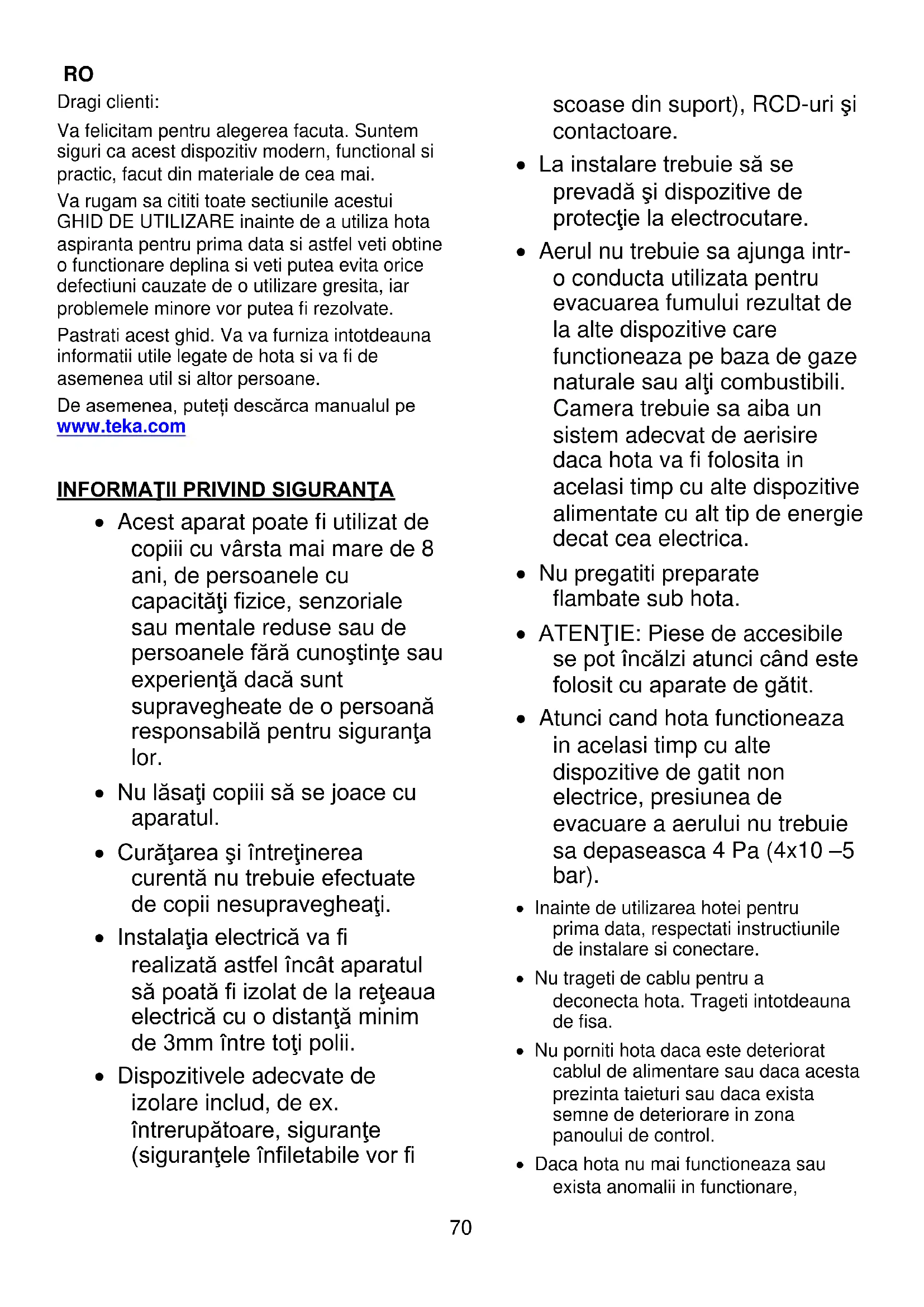 Dragi clienti: Va felicitam pentru alegerea facuta. Suntem siguri ca acest dispozitiv modern, functional si practic, facut din materiale de cea mai. Va rugam sa cititi toate sectiunile acestui GHID DE UTILIZARE inainte de a utiliza hota aspiranta pentru prima data si astfel veti obtine o functionare deplina si veti putea evita orice defectiuni cauzate de o utilizare gresita, iar problemele minore vor putea fi rezolvate. Pastrati acest ghid. Va va furniza intotdeauna informatii utile legate de hota si va fi de asemenea util si altor persoane. De asemenea, puteți descărca manualul pe www.teka.com
