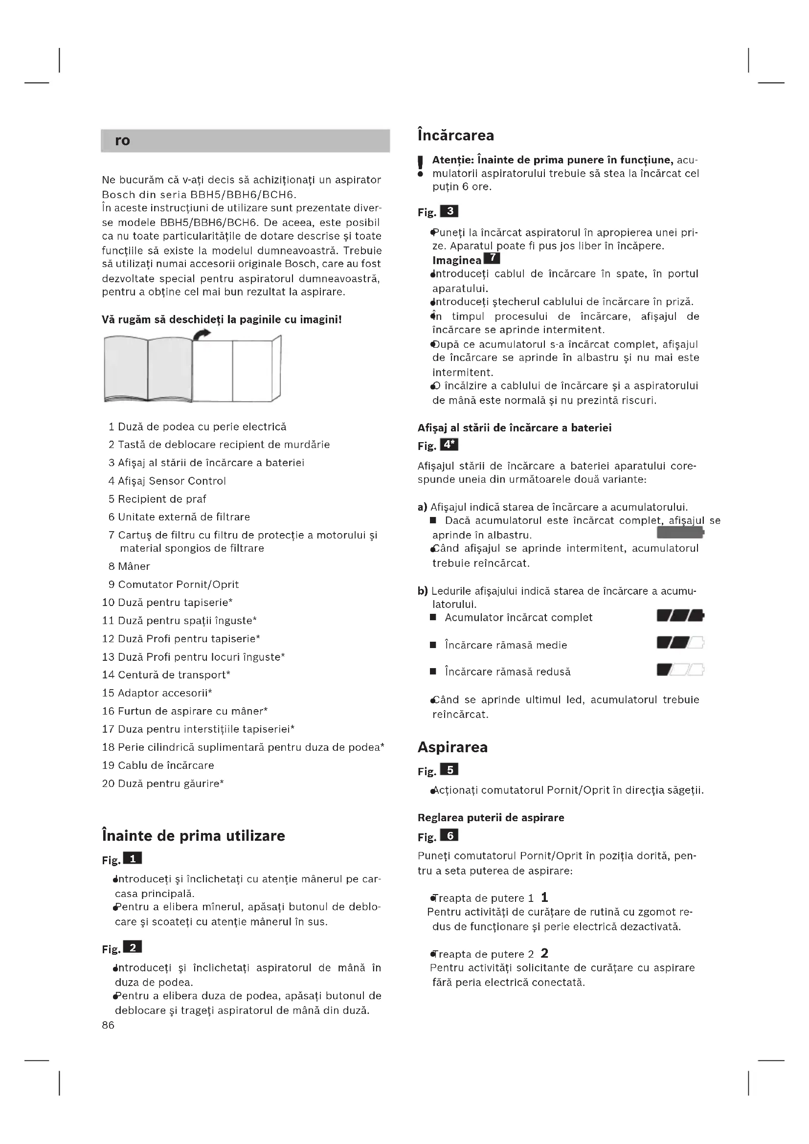 Treapta de putere 2 2 Pentru activităţi solicitante de curăţare cu aspirare fără peria electrică conectată. Ne bucurăm că v-aţi decis să achiziţionaţi un aspirator Bosch din seria BBH5/BBH6/BCH6. În aceste instrucţiuni de utilizare sunt prezentate diver- se modele BBH5/BBH6/BCH6. De aceea, este posibil ca nu toate particularităţile de dotare descrise şi toate funcţiile să existe la modelul dumneavoastră. Trebuie să utilizaţi numai accesorii originale Bosch, care au fost dezvoltate special pentru aspiratorul dumneavoastră, pentru a obţine cel mai bun rezultat la aspirare. Vă rugăm să deschideţi la paginile cu imagini! 1 Duză de podea cu perie electrică 2 Tastă de deblocare recipient de murdărie 3 Afişaj al stării de încărcare a bateriei 4 Afişaj Sensor Control 5 Recipient de praf 6 Unitate externă de filtrare 7 Cartuş de filtru cu filtru de protecţie a motorului şi material spongios de filtrare 8 Mâner 9 Comutator Pornit/Oprit 10 Duză pentru tapiserie* 11 Duză pentru spaţii înguste* 12 Duză Profi pentru tapiserie* 13 Duză Profi pentru locuri înguste* 14 Centură de transport* 15 Adaptor accesorii* 16 Furtun de aspirare cu mâner* 17 Duza pentru interstiţiile tapiseriei* 18 Perie cilindrică suplimentară pentru duza de podea* 19 Cablu de încărcare 20 Duză pentru găurire* Înainte de prima utilizare Fig.