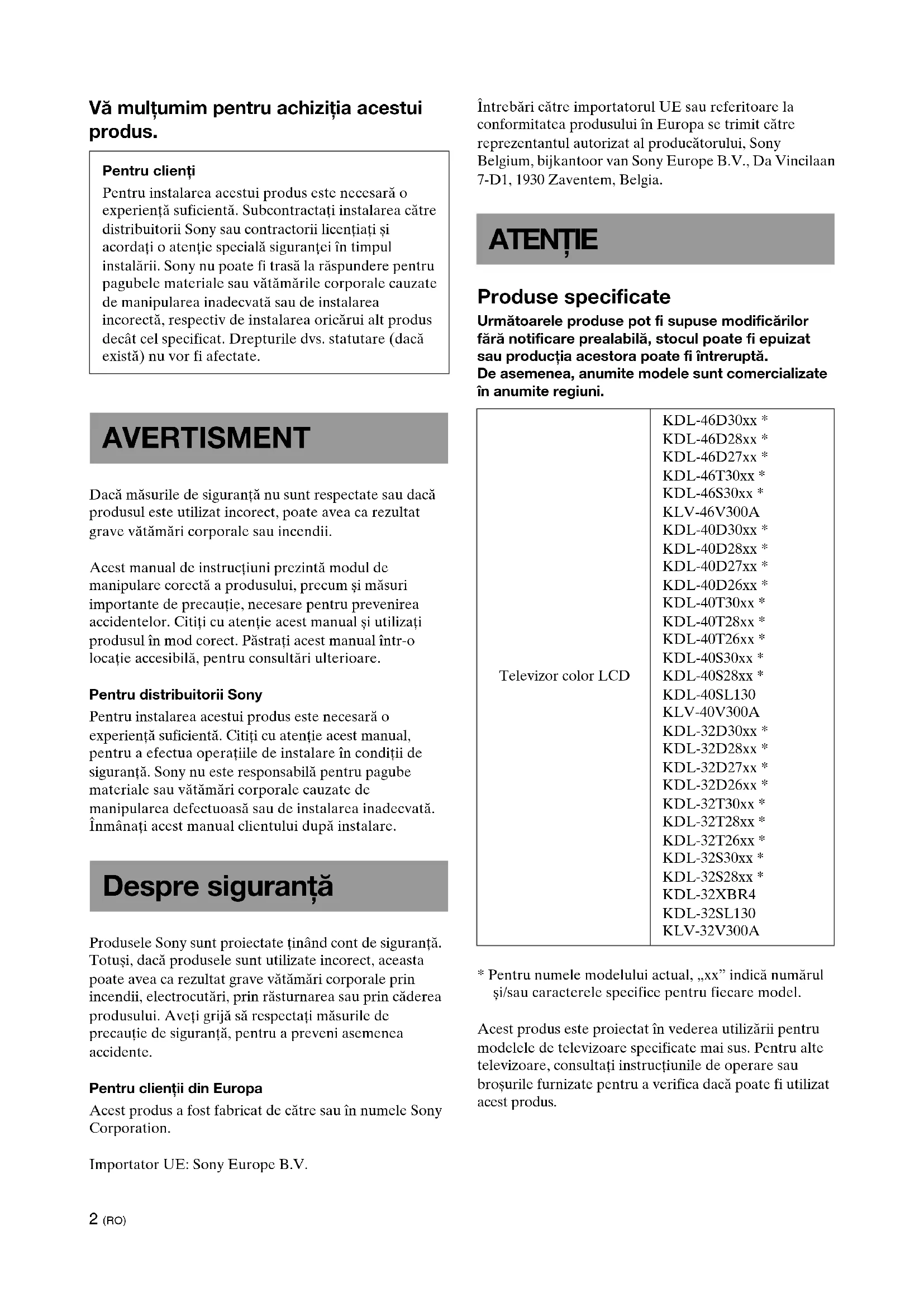 - Umiestnenie háka „a“ sa pri modeloch uvedených v predchádzajúcej tabuľke nedá použiť. c2 (RO) Vă mulţumim pentru achiziţia acestui produs. Dacă măsurile de siguranţă nu sunt respectate sau dacă produsul este utilizat incorect, poate avea ca rezultat grave vătămări corporale sau incendii. Acest manual de instrucţiuni prezintă modul de manipulare corectă a produsului, precum și măsuri importante de precauţie, necesare pentru prevenirea accidentelor. Citiţi cu atenţie acest manual și utilizaţi produsul în mod corect. Păstraţi acest manual într-o locaţie accesibilă, pentru consultări ulterioare. Pentru distribuitorii Sony Pentru instalarea acestui produs este necesară o experienţă suficientă. Citiţi cu atenţie acest manual, pentru a efectua operaţiile de instalare în condiţii de siguranţă. Sony nu este responsabilă pentru pagube materiale sau vătămări corporale cauzate de manipularea defectuoasă sau de instalarea inadecvată. Înmânaţi acest manual clientului după instalare. Produsele Sony sunt proiectate ţinând cont de siguranţă. Totuși, dacă produsele sunt utilizate incorect, aceasta poate avea ca rezultat grave vătămări corporale prin incendii, electrocutări, prin răsturnarea sau prin căderea produsului. Aveţi grijă să respectaţi măsurile de precauţie de siguranţă, pentru a preveni asemenea accidente. Pentru clienţii din Europa Acest produs a fost fabricat de către sau în numele Sony Corporation. Importator UE: Sony Europe B.V. Întrebări către importatorul UE sau referitoare la conformitatea produsului în Europa se trimit către reprezentantul autorizat al producătorului, Sony Belgium, bijkantoor van Sony Europe B.V., Da Vincilaan 7-D1, 1930 Zaventem, Belgia. Produse specificate Următoarele produse pot fi supuse modificărilor fără notificare prealabilă, stocul poate fi epuizat sau producţia acestora poate fi întreruptă. De asemenea, anumite modele sunt comercializate în anumite regiuni.