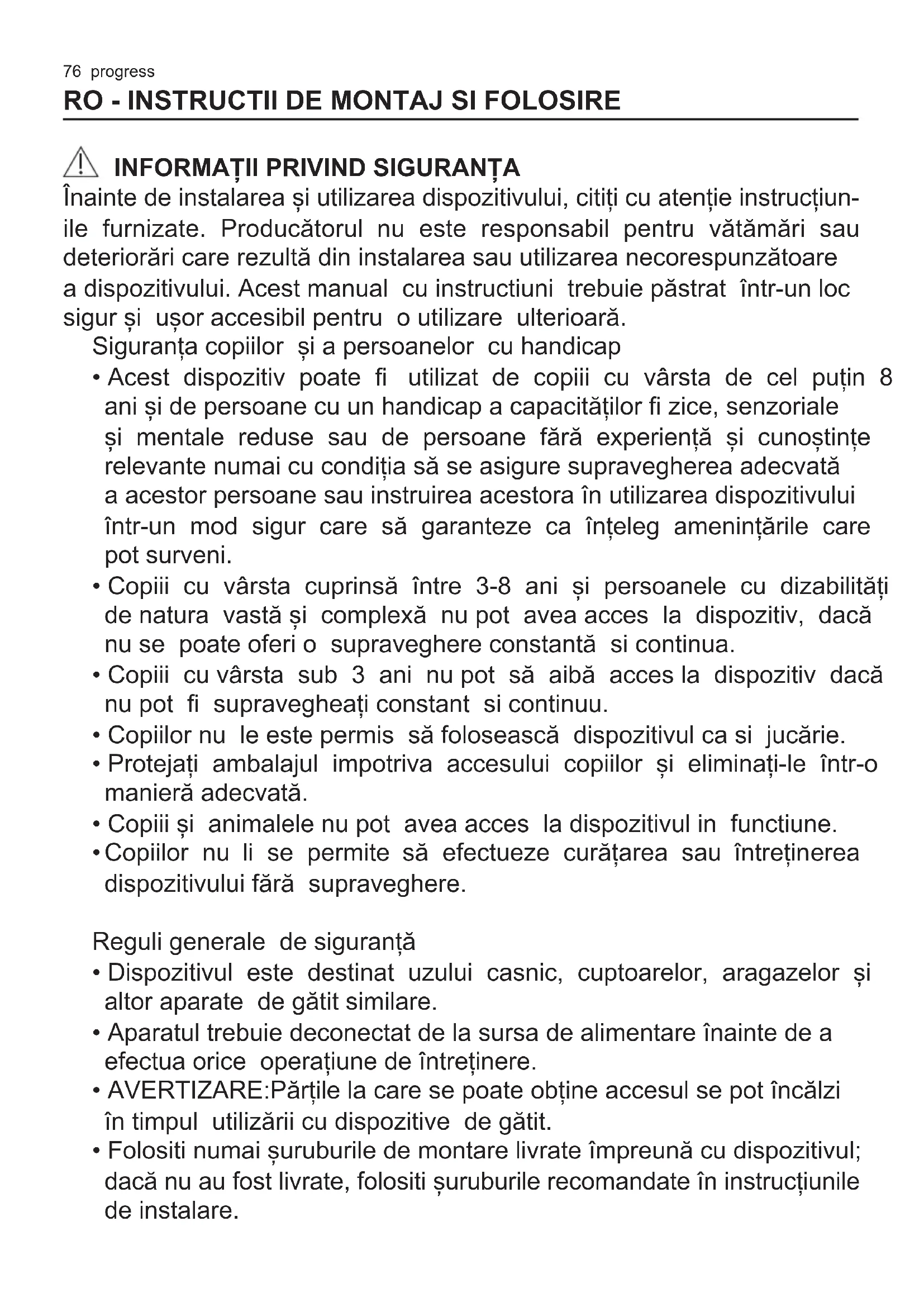 FILTRANTГ SAU ASPIRANTГ ? Hota poate fi utilizatг atвt оn versiune fi ltrantг cвt єi оn versiune aspirantг. Decideюi de la оnceput versiunea de instalare. Pentru o mai bunг efi cienюг, vг recomandгm sг instalaюi hota оn versiunea aspirantг (dacг este posibil). Versiune aspirantг Hota fi ltreazг aerul єi-l оmpinge оn exterior printr-o conductг de evacuare. Versiune fi ltrantг Hota fi ltreazг aerul єi-l reintroduce curat оn camerг. ÎNTREŢINEREA Curгюarea fi ltrelor anti-grгsime; curгюaюi cel puюin o datг la 2 luni pentru a evita riscul de incendiu, Оn ceea ce priveєte a folosi. Spгlaюi-le cu un deter- gent neutru, manual sau cu maєina de spгlat vase. Оn cazul оn care le spгlaюi cu maєina de spгlat vase, dacг se decoloreazг nu оnseamnг cг este afectatг єi funcюionarea acestora. Filtru de cărbune de lemn nu este potrivit pentru curățare și nu poate fi reînnoit și trebuie înlocuit aproximativ la fi ecare 4 luni de utilizare sau mai des în caz de utilizare deosebit de intensă. COMENZI - întrerupгtor pentru aprinderea ilumina tului. - Întrerupгtor ON/OFF pentru pornirea motorului în viteza I. - întrerupгtor pentru pornirea motorului în viteza a II-a. - întrerupгtor pentru pornirea motorului în viteza a III-a.80 progress ILUMINAT Deconectați hota de la sursa de alimentare. Avertizare! Înainte de atingerea becurilor, asigurați-vă că s-au răcit. Înlocuiți cu lămpi de același tip (CANDLE LED 4W, 220-240V, E14, ø37mm). ILCOS D code: DRBB/F-4-220-240-E14-37/100progress 81 HR - UPUTSTVA ZA MONTAŽU I ZA UPORABU