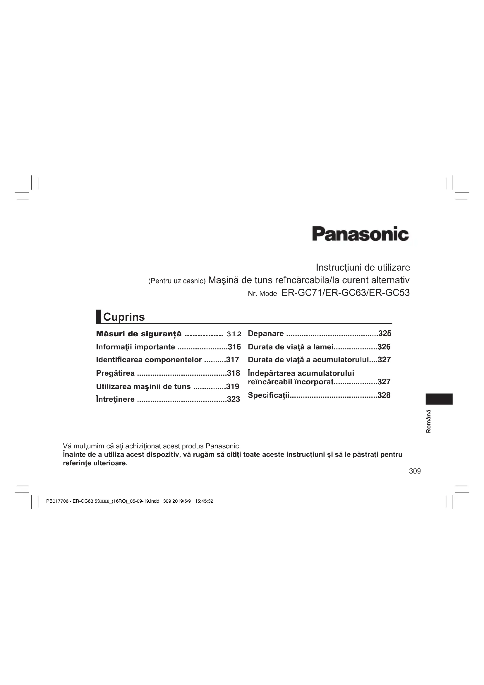 - Pentru protecţia mediului şi reciclarea materialelor Această maşină de tuns conţine un acumulator nichel-metal hidrid. Asiguraţi-vă că acumulatorul este eliminat la un centru desemnat ocial, dacă există unul în ţara dumneavoastră. PB017706 - ER-GC63 53_(16RO)_05-09-19.indd 327 2019/5/9 15:45:45328 Română Depunerea la deşeuri a echipamentelor şi a bateriilor vechi Doar pentru Uniunea Europeană şi pentru ţările cu sisteme de reciclare Aceste simboluri de pe produse, ambalaje şi/sau documentele însoţitoare indică faptul că produsele electrice şi electronice, precum şi bateriile uzate nu trebuie să e amestecate cu deşeurile menajere obişnuite. Pentru un tratament corespunzător, pentru recuperarea şi reciclarea produselor vechi şi a bateriilor uzate, vă rugăm să le depuneţi la punctele de colectare special amenajate, în conformitate cu legislaţia naţională. Prin depunerea corespunzătoare a acestora la deşeuri, veţi ajuta la economisirea unor resurse valoroase şi veţi preveni potenţiale efecte negative asupra sănătăţii umane şi asupra mediului înconjurător. Pentru mai multe informaţii despre colectare şi reciclare, vă rugăm să contactaţi autorităţile locale. Este posibil ca depunerea incorectă la deşeuri să e pedepsită în conformitate cu legile naţionale. Notă pentru simbolul de baterie (ultimele două exemple de simboluri) Acest simbol poate utilizat în combinaţie cu un simbol chimic. În acest caz, acesta este conform cu cerinţele stabilite de Directivă pentru elementul chimic în cauză. Specicaţii Sursa de alimentare Consultaţi plăcuţa de identicare de pe adaptorul de c.a. (conversie automată a tensiunii) Tensiunea motorului 1,2 V Timp de încărcare Aprox. 8 ore Zgomot acustic în aer 60 (dB (A) re 1 pW) Acest produs este destinat numai utilizării casnice. PB017706 - ER-GC63 53_(16RO)_05-09-19.indd 328 2019/5/9 15:45:45329 Türkçe Kullanım Talimatları (Ev kullanımı) AC/Şarjlı Saç Makasi Model No. ER-GC71/ER-GC63/ER-GC53 Bu Panasonic ürününü aldığınız için teşekkür ederiz. Bu üniteyi kullanmadan önce lütfen talimatları eksiksiz okuyun ve ileride kullanmak için saklayın. Güvenlik önlemleri p. 332