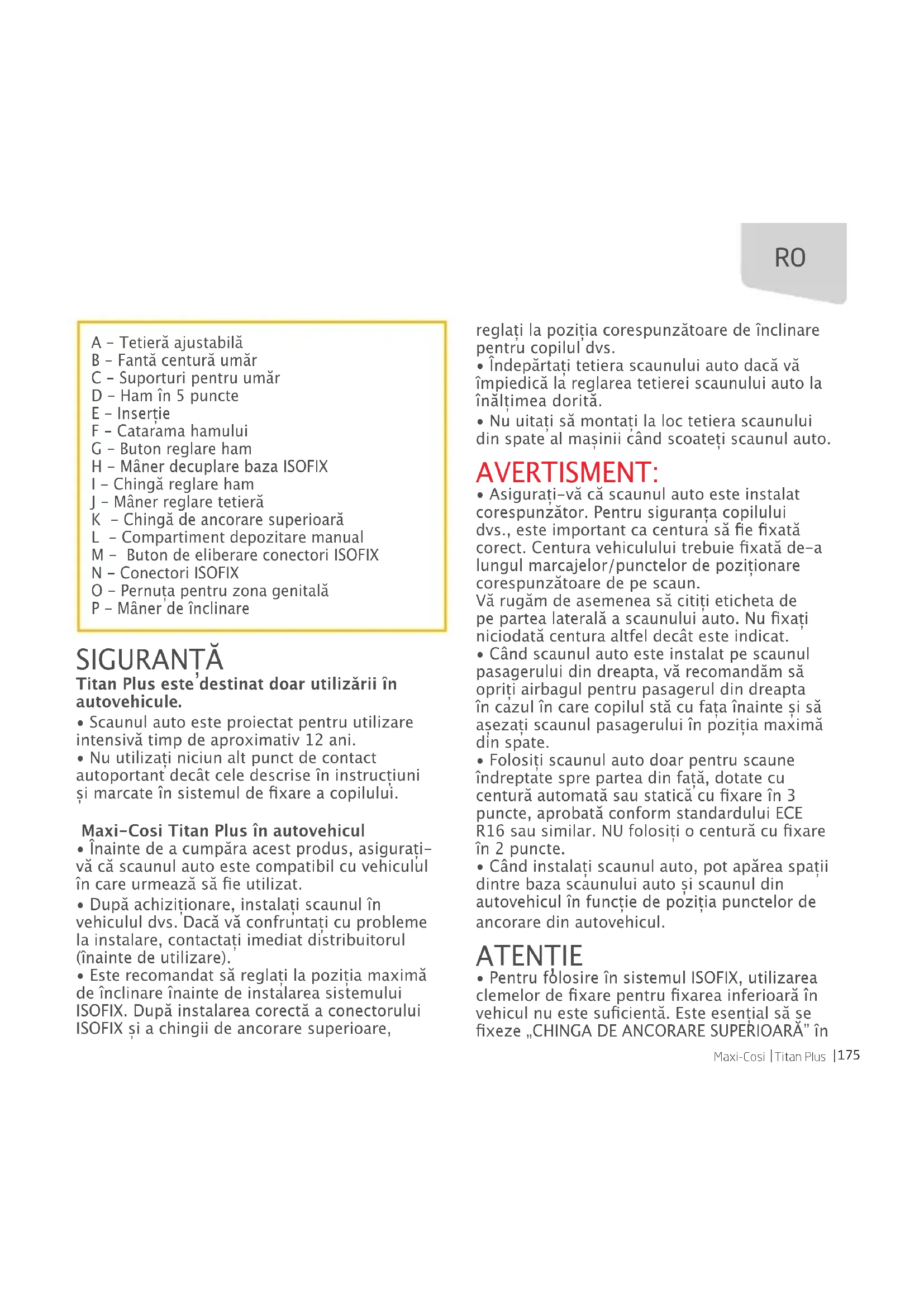 A - Tetieră ajustabilă B - Fantă centură umăr C - Suporturi pentru umăr D - Ham în 5 puncte E - Inserție F - Catarama hamului G - Buton reglare ham H - Mâner decuplare baza ISOFIX I - Chingă reglare ham J - Mâner reglare tetieră K - Chingă de ancorare superioară L - Compartiment depozitare manual M - Buton de eliberare conectori ISOFIX N - Conectori ISOFIX O - Pernuța pentru zona genitală P - Mâner de înclinare176