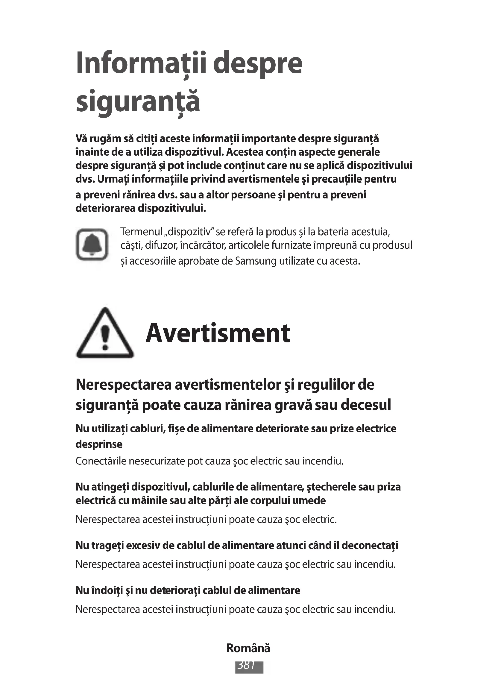 Informaţii despre siguranţă Vă rugăm să citiţi aceste informaţii importante despre siguranţă înainte de a utiliza dispozitivul. Acestea conţin aspecte generale despre siguranţă şi pot include conţinut care nu se aplică dispozitivului dvs. Urmaţi informaţiile privind avertismentele şi precauţiile pentru a preveni rănirea dvs. sau a altor persoane şi pentru a preveni deteriorarea dispozitivului. Termenul „dispozitiv” se referă la produs și la bateria acestuia, căşti, difuzor, încărcător, articolele furnizate împreună cu produsul și accesoriile aprobate de Samsung utilizate cu acesta. Avertisment Nerespectarea avertismentelor şi regulilor de siguranţă poate cauza rănirea gravă sau decesul Nu utilizaţi cabluri, fișe de alimentare deteriorate sau prize electrice desprinse Conectările nesecurizate pot cauza şoc electric sau incendiu. Nu atingeți dispozitivul, cablurile de alimentare, ştecherele sau priza electrică cu mâinile sau alte părți ale corpului umede Nerespectarea acestei instrucţiuni poate cauza şoc electric. Nu trageţi excesiv de cablul de alimentare atunci când îl deconectaţi Nerespectarea acestei instrucţiuni poate cauza şoc electric sau incendiu. Nu îndoiţi şi nu deterioraţi cablul de alimentare Nerespectarea acestei instrucţiuni poate cauza şoc electric sau incendiu.Română