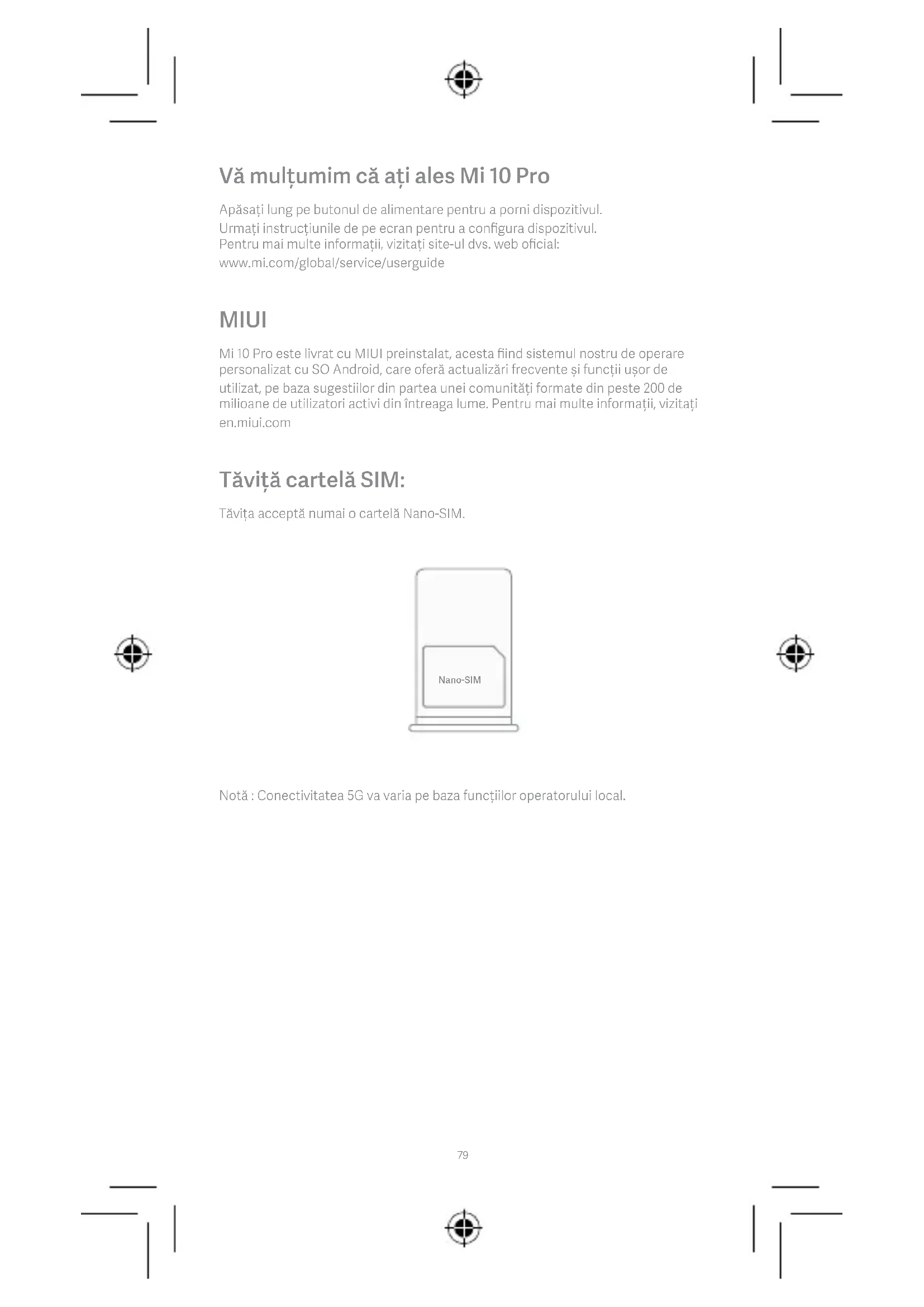 Butoane de volum Buton de alimentare SÂM. 16 AUG. Port USB Type-C RO79 Vă mulțumim că ați ales Mi 10 Pro Apăsați lung pe butonul de alimentare pentru a porni dispozitivul. Urmați instrucțiunile de pe ecran pentru a configura dispozitivul. Pentru mai multe informații, vizitați site-ul dvs. web oficial: www.mi.com/global/service/userguide MIUI Mi 10 Pro este livrat cu MIUI preinstalat, acesta fiind sistemul nostru de operare personalizat cu SO Android, care oferă actualizări frecvente și funcții ușor de utilizat, pe baza sugestiilor din partea unei comunități formate din peste 200 de milioane de utilizatori activi din întreaga lume. Pentru mai multe informații, vizitați en.miui.com Tăviță cartelă SIM: Tăvița acceptă numai o cartelă Nano-SIM. Notă : Conectivitatea 5G va varia pe baza funcțiilor operatorului local. Nano-SIM80 DEEE Trebuie luate măsuri speciale de precauție pentru scoaterea din uz în siguranță a acestui produs. Acest marcaj indică faptul că acest produs nu trebuie să fie aruncat împreună cu deșeuri menajere pe teritoriul statelor membre ale UE. Pentru a preveni efectele negative asupra mediului înconjurător sau sănătății oamenilor ca urmare a eliminării incorecte a deșeurilor și pentru a promova reutilizarea sustenabilă a resurselor materiale, reciclați în mod responsabil. Pentru a recicla în siguranță dispozitivul, folosiți sistemele de returnare și colectare sau contactați distribuitorul de la care ați achiziționat inițial dispozitivul. Pentru a vizualiza Declarația noastră privind protecția mediului, consultați următorul link: www.mi.com/en/about/environment ATENȚIE RISC DE EXPLOZIE DACĂ ÎNLOCUIȚI BATERIA CU UNA DE TIP INCORECT. ARUNCAȚI BATERIILE FOLOSITE ÎN CONFORMITATE CU INSTRUCȚIUNILE. Laserul din acest produs face parte din Clasa 1. Pentru a preveni posibilele vătămări ale auzului, nu ascultați la niveluri ridicate de volum pentru perioade lungi de timp. Informații privind siguranța și măsuri de precauție suplimentare pot fi accesate în următorul link: www.mi.com/en/certification Informații importante referitoare la siguranță Citiți toate informațiile de mai jos referitoare la siguranță înainte de a folosi dispozitivul: