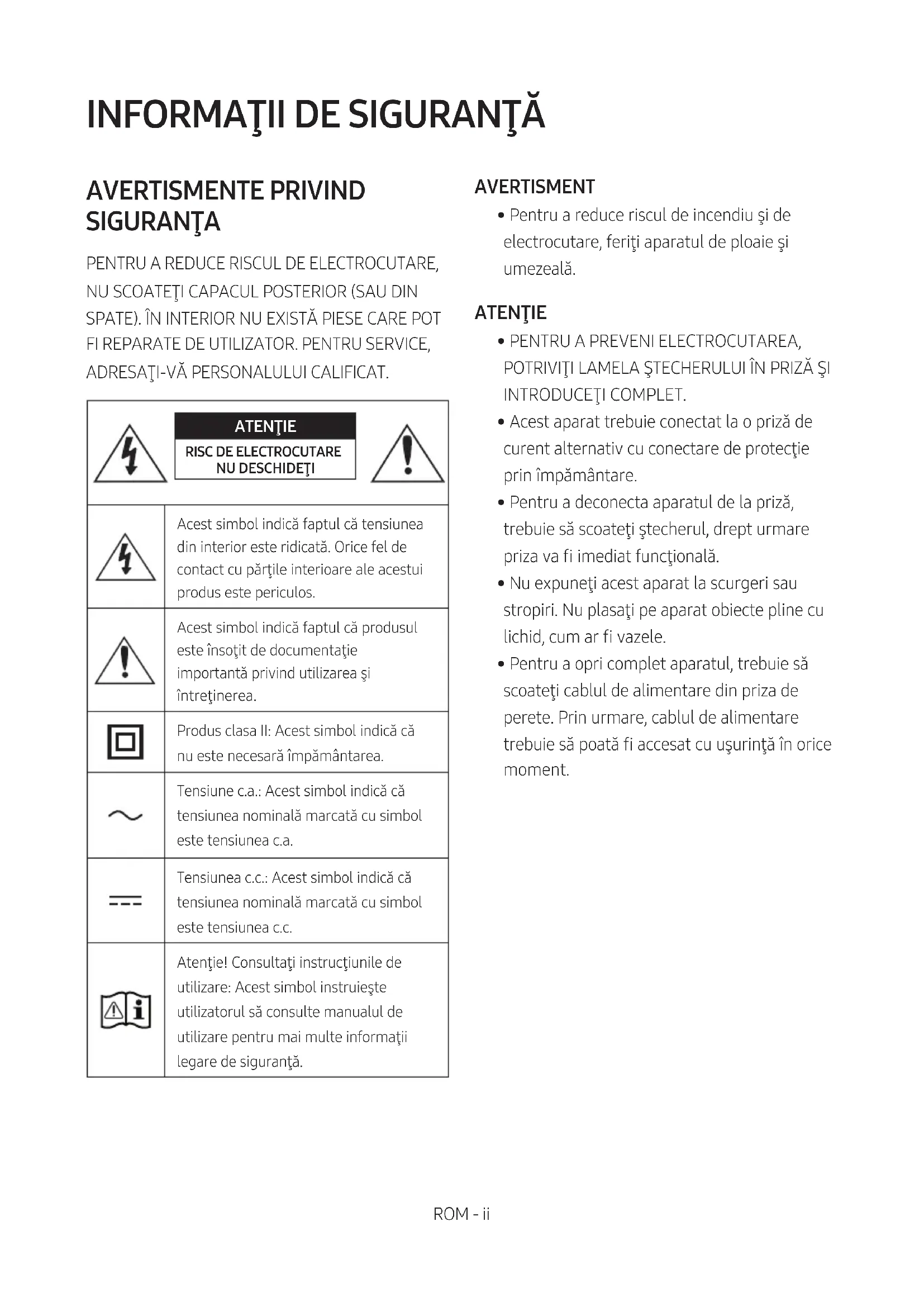 AVERTISMENTE PRIVIND SIGURANŢA PENTRU A REDUCE RISCUL DE ELECTROCUTARE, NU SCOATEŢI CAPACUL POSTERIOR (SAU DIN SPATE). ÎN INTERIOR NU EXISTĂ PIESE CARE POT FI REPARATE DE UTILIZATOR. PENTRU SERVICE, ADRESAŢI-VĂ PERSONALULUI CALIFICAT. ATENŢIE RISC DE ELECTROCUTARE NU DESCHIDEŢIAcest simbol indică faptul că tensiunea din interior este ridicată. Orice fel de contact cu părţile interioare ale acestui produs este periculos.Acest simbol indică faptul că produsul este însoţit de documentaţie importantă privind utilizarea şi întreţinerea.Produs clasa II: Acest simbol indică că nu este necesară împământarea.Tensiune c.a.: Acest simbol indică că tensiunea nominală marcată cu simbol este tensiunea c.a.Tensiunea c.c.: Acest simbol indică că tensiunea nominală marcată cu simbol este tensiunea c.c.Atenţie! Consultaţi instrucţiunile de utilizare: Acest simbol instruieşte utilizatorul să consulte manualul de utilizare pentru mai multe informaţii legare de siguranţă. AVERTISMENT