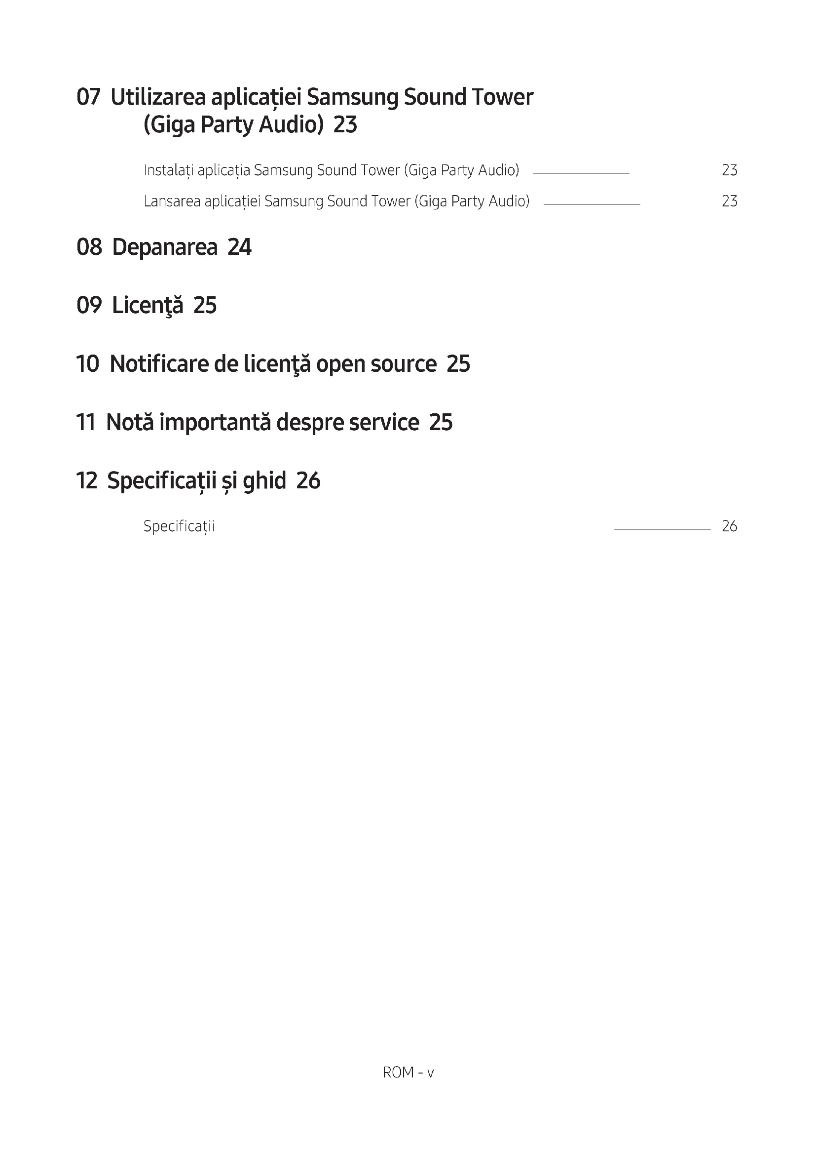 - Aplicația Samsung Sound Tower (Giga Party Audio) este compatibilă cu dispozitivele mobile Apple care rulează iOS 10.0 sau o versiune ulterioară. Cercetarea de piață: Samsung Sound Tower sau Samsung Giga Party Audio Lansarea aplicației Samsung Sound Tower (Giga Party Audio) Pentru a lansa și utiliza aplicația Samsung Sound Tower (Giga Party Audio), atingeți pictograma Samsung Sound Tower (Giga Party Audio) de pe dispozitivul dvs. inteligent, apoi urmați instrucțiunile de pe ecran. Samsung Multiroom Samsung Sou nd Tower sau Samsung Gig a Party Audio Samsung Sound Tower sau Samsung Giga Party AudioROM - 24 08 DEPANAREA Înainte de a solicita service, vericaţi următoarele. Unitatea nu pornește. Cablul de alimentare este conectat la priză? ; Conectați mufa de alimentare la priză. O funcție nu rulează atunci când se apasă pe buton. Există electricitate statică în aer? ; Deconectați mufa de alimentare și conectați-o din nou. Căderi de sunet apar în modul BT. ; Consultați capitolele dedicate conectării Bluetooth la pagina 14. Nu se produce sunet. Funcția Mute este activată? ; Apăsați pe butonul (Dezactivare sunet) pentru a anula funcția de dezactivare a sunetului. Volumul este setat la minim? ; Reglați volumul. Telecomanda nu funcționează. Bateriile sunt descărcate? ; Înlocuiți-le cu baterii noi. Distanța dintre telecomandă și unitatea principală Sound Tower este prea mare? ; Mutați telecomanda mai aproape de unitatea principală Sound Tower. Conexiunea Grupului Stereo nu funcționează. Sistemul este în modul wireless Group Play? ; Deconectați modul wireless Group Play și încercați conexiunea Grupului Stereo din nou. Nu poate realiza o conexiune Bluetooth. Sistemul este conectat la alt sistem în modul wireless Group Play sau în modul de Grup Stereo? ; Încercați din nou conexiunea Bluetooth după deconectarea conexiunii wireless a Group Play sau a Grupului Stereo. Cele două dispozitive Bluetooth sunt deja conectate? ; Încercați din nou conexiunea Bluetooth după deconectarea altor conexiuni Bluetooth. Butonul PAIRING nu funcționează. Sistemul este în modul wireless Group Play sau în modul de Grup Stereo? ; Încercați din nou după deconectarea conexiunii wireless Group Play sau a Grupului Stereo. Vreau să înlocuiesc sistemul HOST (MAIN) cu celălalt în conexiunea wireless Group Play sau Grupul Stereo. ; Deconectați modul Group Play, apăsați difuzorul pe care doriți să îl conectați prima dată la HOST, iar după așarea mesajului „HOST”, conectați-le pe celelalte, unul câte unul. ; În modul Grupului Stereo, MAIN este xat. Nu le puteți modica pe celelalte sub formă de MAIN. Doresc să redau AUX1 sau AUX2 mai mult de 8 ore fără introducerea comenzii. ; Apăsați și mențineți apăsat butonul mai mult de 5 secunde în modul AUX1 sau AUX2 pentru a dezactiva funcția Oprire automată. Schimbați de la ON-AUTO POWER DOWN la OFF-AUTO POWER