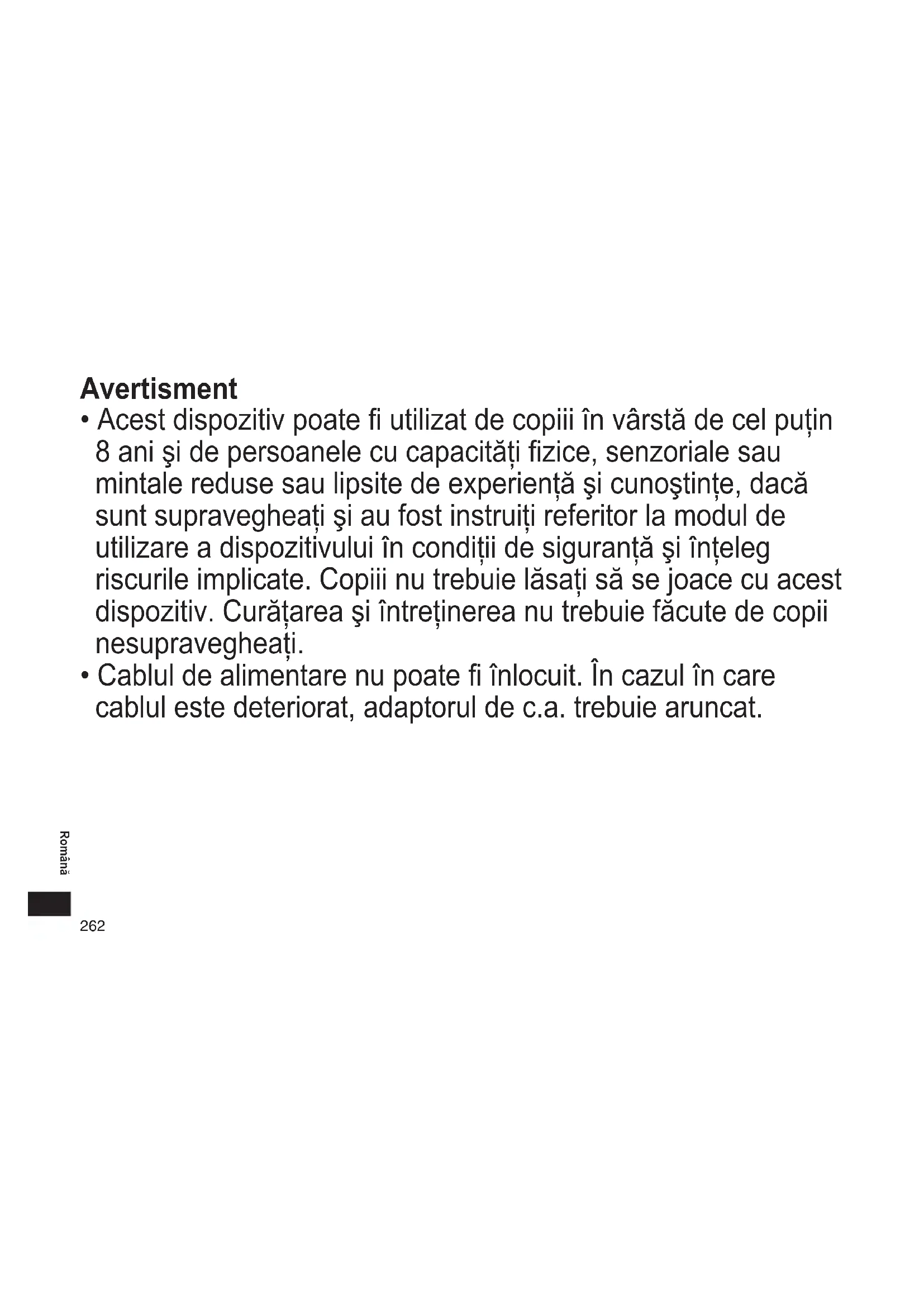 - Acestdispozitivpoateutilizatdecopiiiînvârstădecelpuţin 8anişidepersoanelecucapacităţizice,senzorialesau mintaleredusesaulipsitedeexperienţăşicunoştinţe,dacă suntsupravegheaţişiaufostinstruiţireferitorlamodulde utilizareadispozitivuluiîncondiţiidesiguranţăşiînţeleg riscurileimplicate.Copiiinutrebuielăsaţisăsejoacecuacest dispozitiv.Curăţareaşiîntreţinereanutrebuiefăcutedecopii nesupravegheaţi.