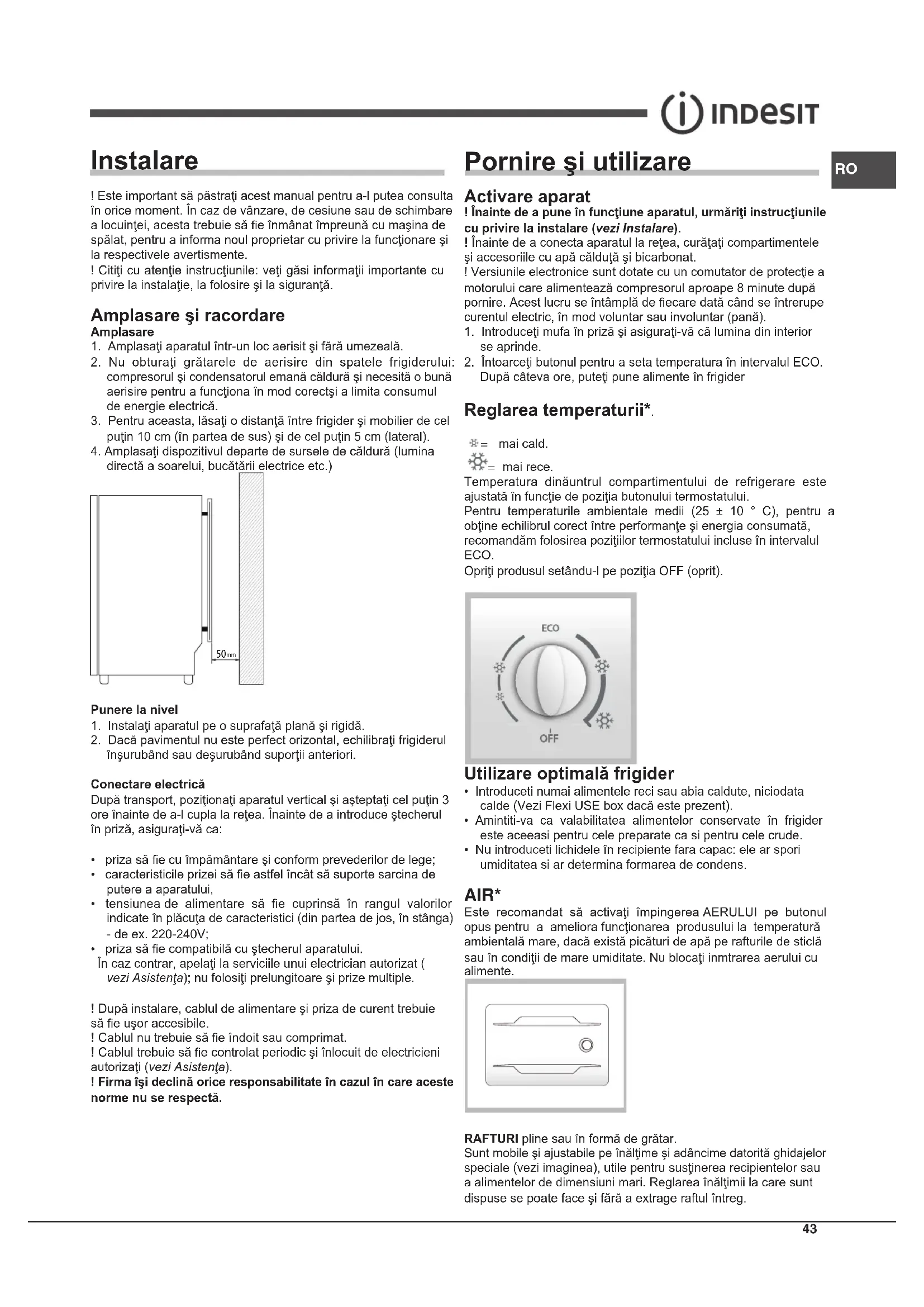 - priza să e compatibilă cu ştecherul aparatului. În caz contrar, apelaţi la serviciile unui electrician autorizat ( vezi Asistenţa); nu folosiţi prelungitoare şi prize multiple. ! După instalare, cablul de alimentare şi priza de curent trebuie să e uşor accesibile. ! Cablul nu trebuie să e îndoit sau comprimat. ! Cablul trebuie să e controlat periodic şi înlocuit de electricieni autorizaţi (vezi Asistenţa). ! Firma îşi declină orice responsabilitate în cazul în care aceste norme nu se respectă. Pornire şi utilizare Activare aparat ! Înainte de a pune în funcţiune aparatul, urmăriţi instrucţiunile cu privire la instalare (vezi Instalare). ! Înainte de a conecta aparatul la reţea, curăţaţi compartimentele şi accesoriile cu apă călduţă şi bicarbonat. ! Versiunile electronice sunt dotate cu un comutator de protecţie a motorului care alimentează compresorul aproape 8 minute după pornire. Acest lucru se întâmplă de ecare dată când se întrerupe curentul electric, în mod voluntar sau involuntar (pană).