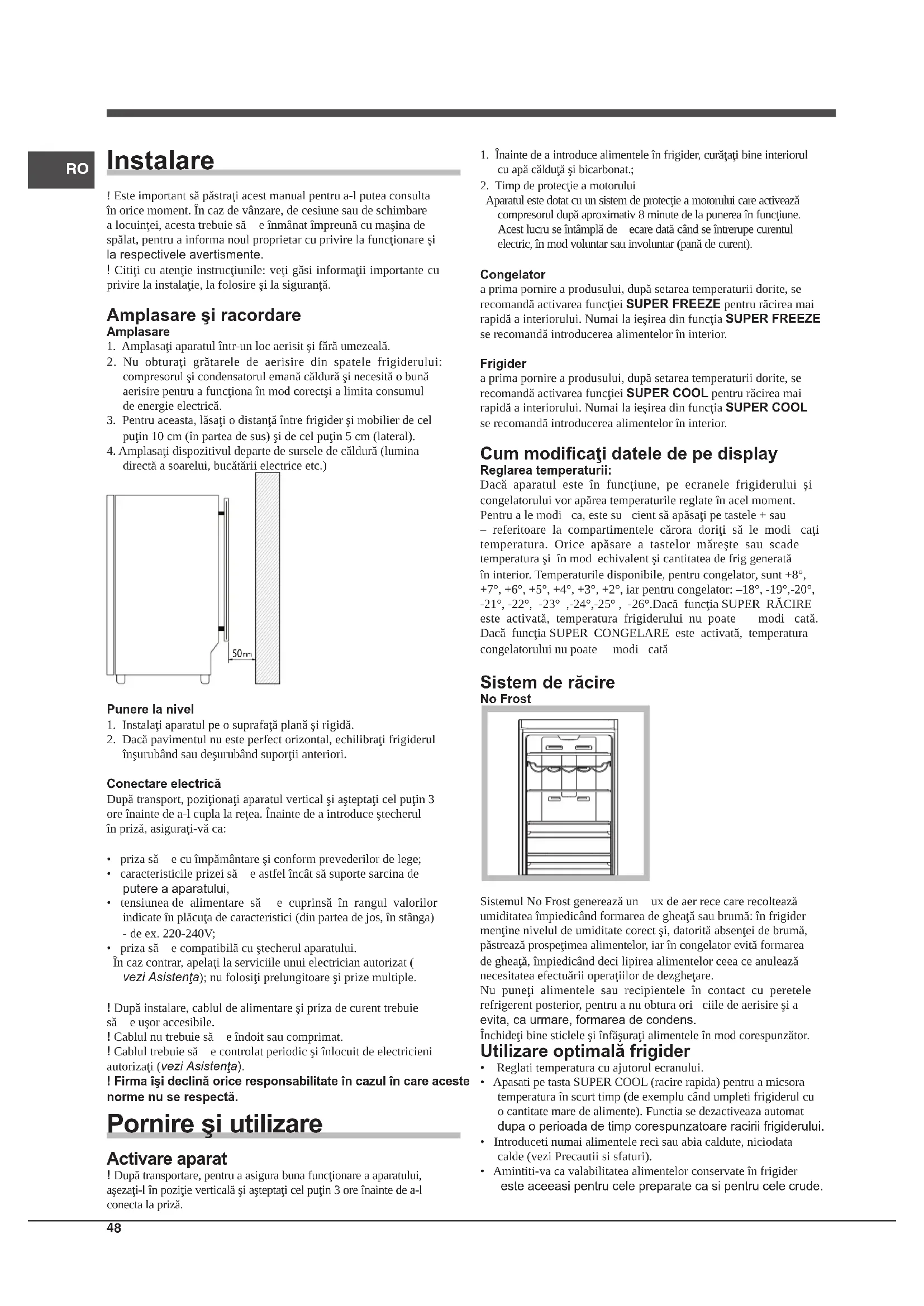 Aparatul este dotat cu un sistem de protecţie a motorului care activează compresorul după aproximativ 8 minute de la punerea în funcţiune. Acest lucru se întâmplă de ecare dată când se întrerupe curentul electric, în mod voluntar sau involuntar (pană de curent). Congelator a prima pornire a produsului, după setarea temperaturii dorite, se recomandă activarea funcţiei SUPER FREEZE pentru răcirea mai rapidă a interiorului. Numai la ieşirea din funcţia SUPER FREEZE se recomandă introducerea alimentelor în interior. Frigider a prima pornire a produsului, după setarea temperaturii dorite, se recomandă activarea funcţiei SUPER COOL pentru răcirea mai rapidă a interiorului. Numai la ieşirea din funcţia SUPER COOL se recomandă introducerea alimentelor în interior. Cum modicaţi datele de pe display Reglarea temperaturii: Dacă aparatul este în funcţiune, pe ecranele frigiderului şi congelatorului vor apărea temperaturile reglate în acel moment. Pentru a le modica, este sucient să apăsaţi pe tastele + sau – referitoare la compartimentele cărora doriţi să le modicaţi temperatura. Orice apăsare a tastelor măreşte sau scade temperatura şi în mod echivalent şi cantitatea de frig generată în interior. Temperaturile disponibile, pentru congelator, sunt +8°, +7°, +6°, +5°, +4°, +3°, +2°, iar pentru congelator: –18°, -19°,-20°, -21°, -22°, -23° ,-24°,-25° , -26°.Dacă funcţia SUPER RĂCIRE este activată, temperatura frigiderului nu poate modicată. Dacă funcţia SUPER CONGELARE este activată, temperatura congelatorului nu poate modicată Sistem de răcire No Frost Sistemul No Frost generează un ux de aer rece care recoltează umiditatea împiedicând formarea de gheaţă sau brumă: în frigider menţine nivelul de umiditate corect şi, datorită absenţei de brumă, păstrează prospeţimea alimentelor, iar în congelator evită formarea de gheaţă, împiedicând deci lipirea alimentelor ceea ce anulează necesitatea efectuării operaţiilor de dezgheţare. Nu puneţi alimentele sau recipientele în contact cu peretele refrigerent posterior, pentru a nu obtura oriciile de aerisire şi a evita, ca urmare, formarea de condens. Închideţi bine sticlele şi înfăşuraţi alimentele în mod corespunzător. Utilizare optimală frigider