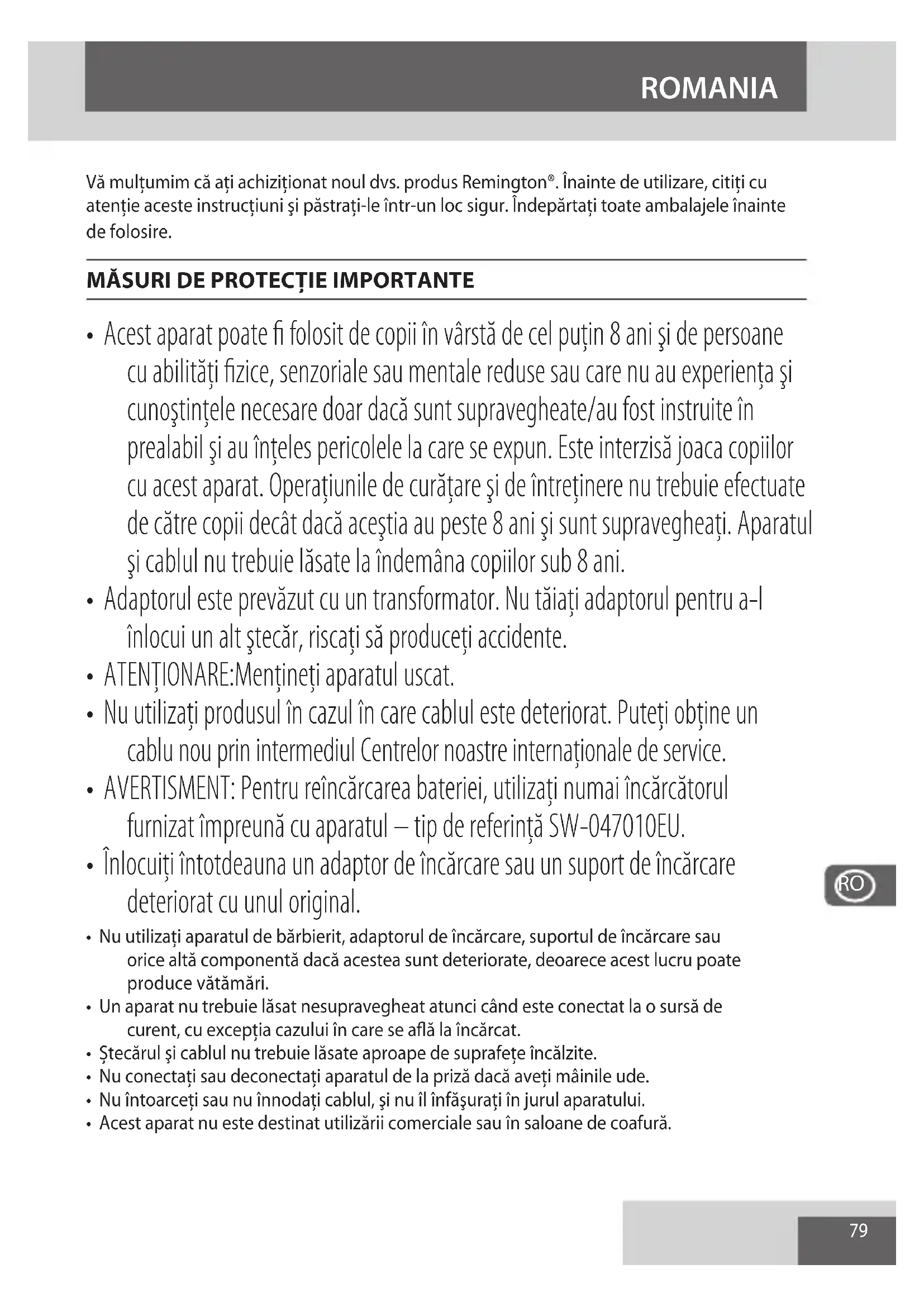 - AVERTISMENT: Pentru reîncărcarea bateriei, utilizaţi numai încărcătorul furnizat împreună cu aparatul – tip de referinţă SW-047010EU.