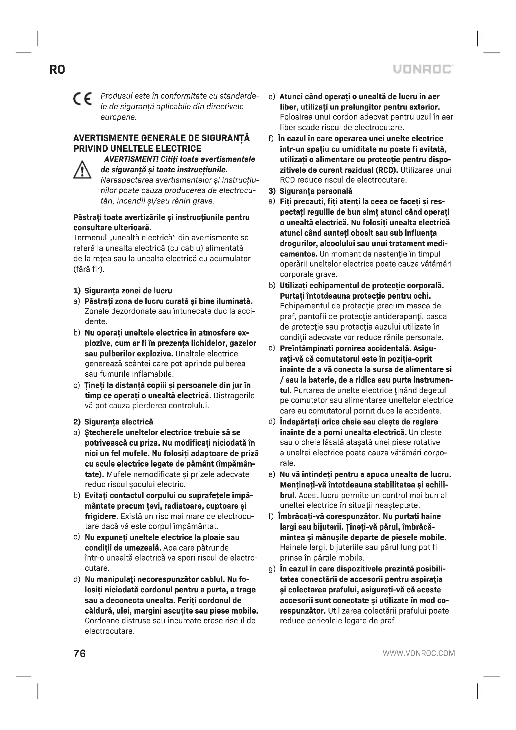 Înainte de curăţare şi întreţinere, opriţi alimentarea electrică amaşinii şi scoateţi acumulatorul din maşină. Curăţaţi regulat carcasa cu ocârpă moale, de preferat după fiecare utilizare. Curăţaţi fantele de aerisire de praf şi murdărie. Îndepărtaţi murdăria persistentă cu ocârpă moale înmuiată în clăbuci de săpun. Nu folosiţi solvenţi precum benzină, alcool, amoniac, etc. Astfel de substanţe chimice vor dete- riora componentele sintetice. MEDIU Aparatele electrice sau electronice deteriorate şi/sau defecte trebuie colectate în locurile de reciclare corespunzătoare. Numai pentru ţările din CE Nu aruncaţi echipamentele acţionate electric împreună cu gunoiul menajer. Conform Indicaţiei europene 2012/19/CE pentru echipamente electrice şi electronice uzate şi aimplementării sale la nivel naţional, echipamentele acţionate electric scoase din uz trebuie colectate separat şi evacuate într-omani- eră ecologică. GARANŢIE Produsele VONROC sunt realizate la cele mai înalte standarde de calitate şi sunt garantate în privinţa materialelor şi amanoperei pentru întreaga perioadă de utilizare în garanţie, începând cu data achiziţiei. În cazul în care produsul prezintă defecţiuni în perioada de garanţie din cauza materialului defect şi/sau amanoperei, contactaţi direct VONROC. Următoarele circumstanţe sunt excluse de la această garanţie: