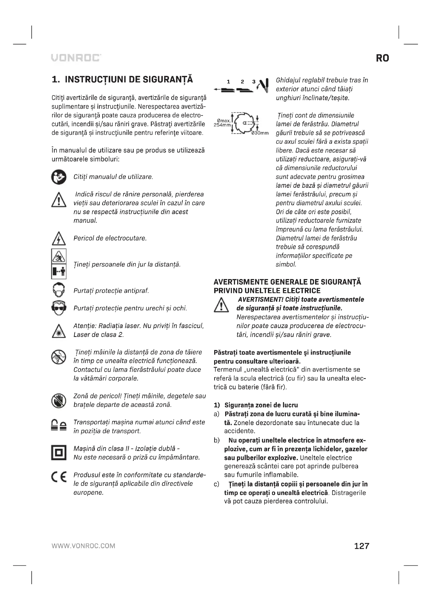 - Folosirea unor piese de schimbe neoriginale. Aceasta acoperă garanţia companiei, explicită sau implicită. Nu există alte garanţii explicite sau impli- cite care să se extindă dincolo de cele indicate aici, incluzând garanţiile, vandabilitatea sau adecvarea pentru un anumit scop. În nicio situaţie, VONROC nu este responsabil pentru daunele incidentale sau consecvenţiale. Reparaţiile efectuate de repre- zentant trebuie să fie limitate la reparaţiile sau la înlocuirea unităţilor sau apieselor neconforme. Produsul şi manualul de utilizare pot suferi modi- ficări. Specificaţiile se pot modifica fără notificare prealabilă.PT