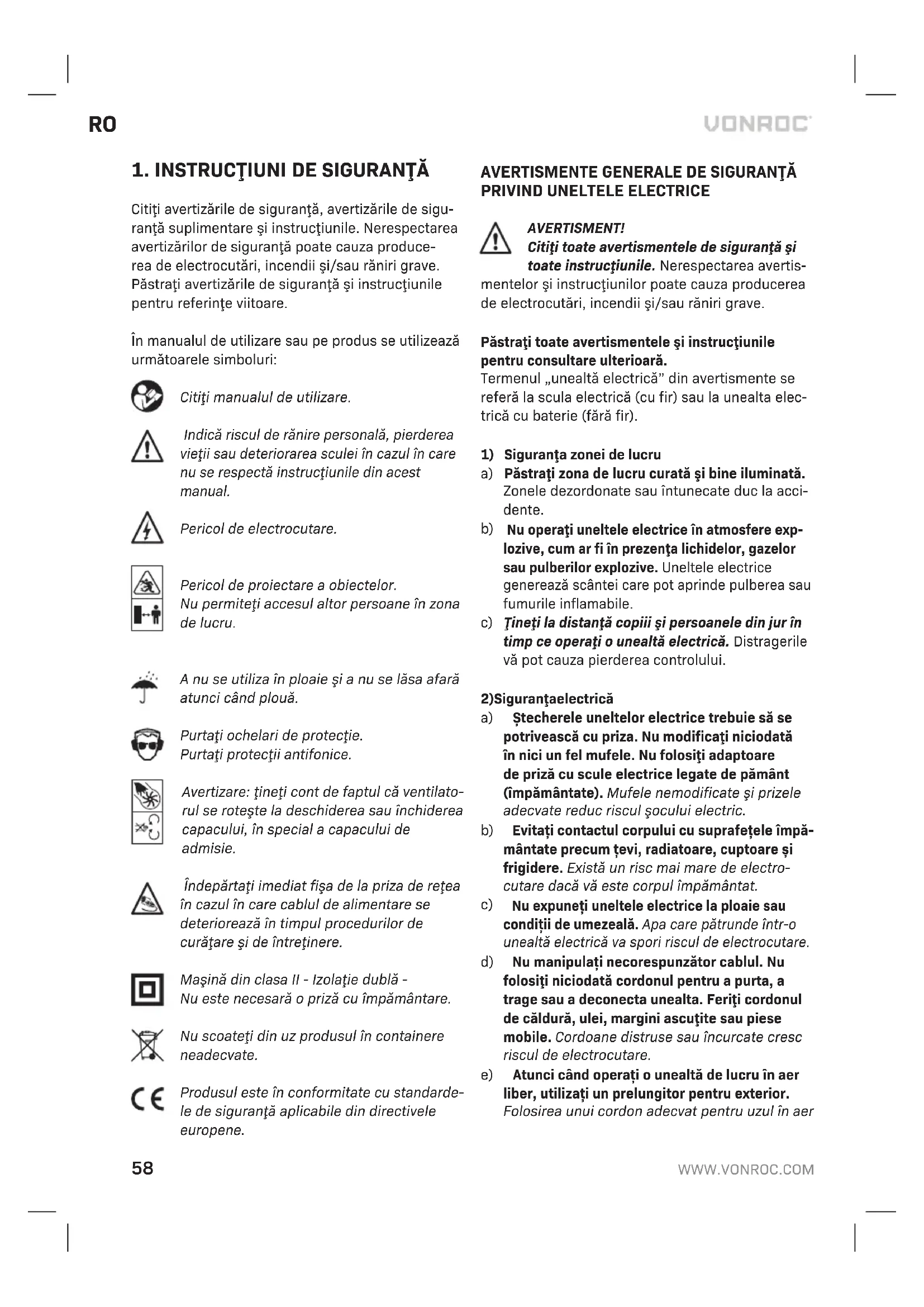 Citiţi avertizările de siguranţă, avertizările de sigu- ranţă suplimentare şi instrucţiunile. Nerespectarea avertizărilor de siguranţă poate cauza produce- rea de electrocutări, incendii şi/sau răniri grave. Păstraţi avertizările de siguranţă şi instrucţiunile pentru referinţe viitoare. În manualul de utilizare sau pe produs se utilizează următoarele simboluri: Citiţi manualul de utilizare. Indică riscul de rănire personală, pierderea vieţii sau deteriorarea sculei în cazul în care nu se respectă instrucţiunile din acest manual. Pericol de electrocutare. Pericol de proiectare a obiectelor. Nu permiteţi accesul altor persoane în zona de lucru. A nu se utiliza în ploaie şi a nu se lăsa afară atunci când plouă. Purtaţi ochelari de protecţie. Purtaţi protecţii antifonice. Avertizare: ţineţi cont de faptul că ventilato- rul se roteşte la deschiderea sau închiderea capacului, în special a capacului de admisie. Îndepărtaţi imediat fişa de la priza de reţea în cazul în care cablul de alimentare se deteriorează în timpul procedurilor de curăţare şi de întreţinere. Maşină din clasa II - Izolaţie dublă - Nu este necesară o priză cu împământare. Nu scoateţi din uz produsul în containere neadecvate. Produsul este în conformitate cu standarde- le de siguranţă aplicabile din directivele europene.