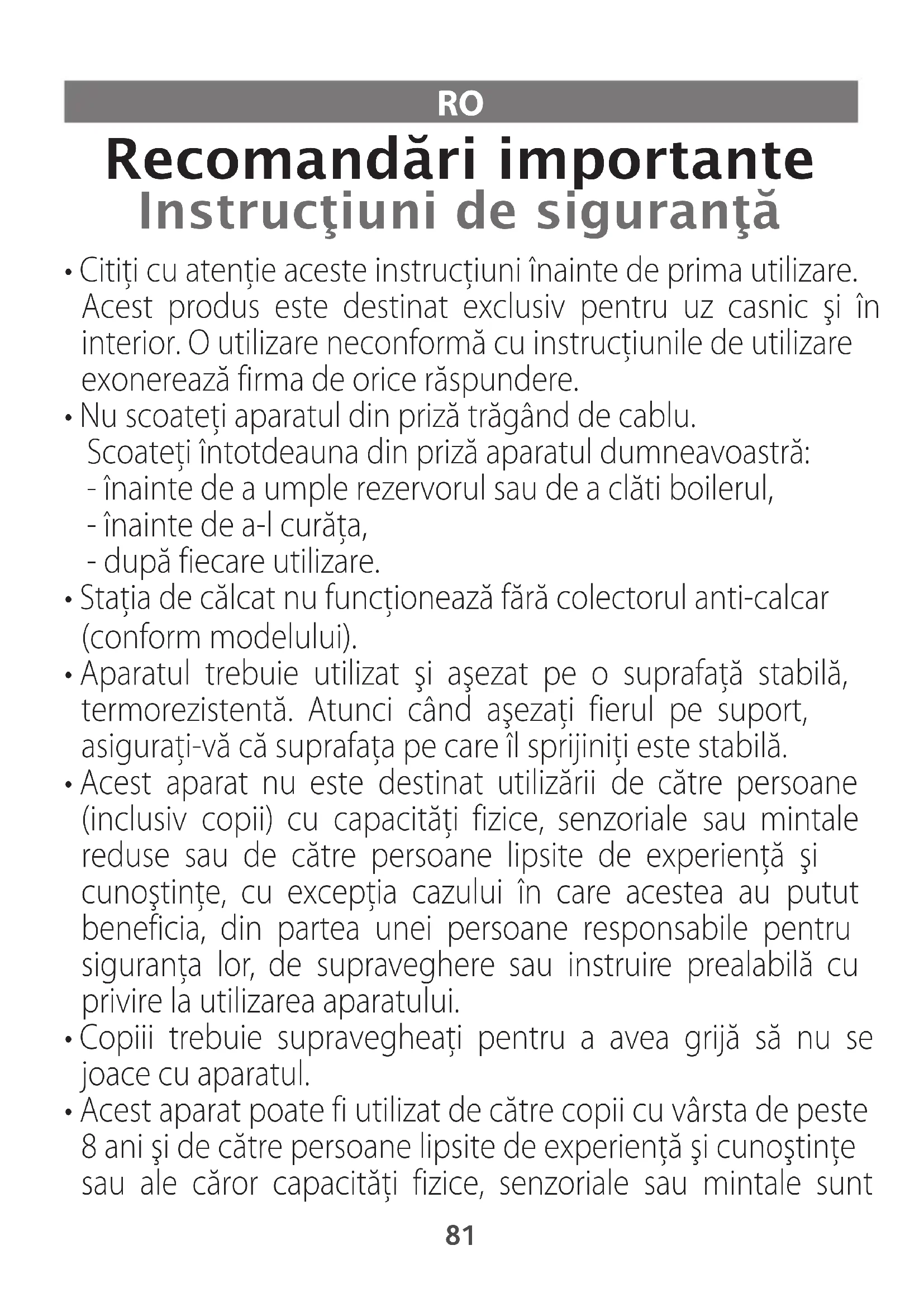 1800139811-STEAM-STATIONS-SAFETIES-V6.qxp_110x154 01/06/2016 15:21 Page81reduse, dacă acestea au fost instruite şi pregătite în ceea ce priveşte utilizarea aparatului într-o manieră sigură şi cunoscând riscurile implicate. Copiilor nu le este permis să se joace cu aparatul. Curăţarea şi întreţinerea de către utilizator nu pot fi realizate de copii nesupravegheaţi. Nu lăsaţi fierul de călcat şi cablul său de alimentare la îndemâna copiilor cu vârste mai mici de 8 ani atunci când se află sub tensiune sau în curs de răcire.