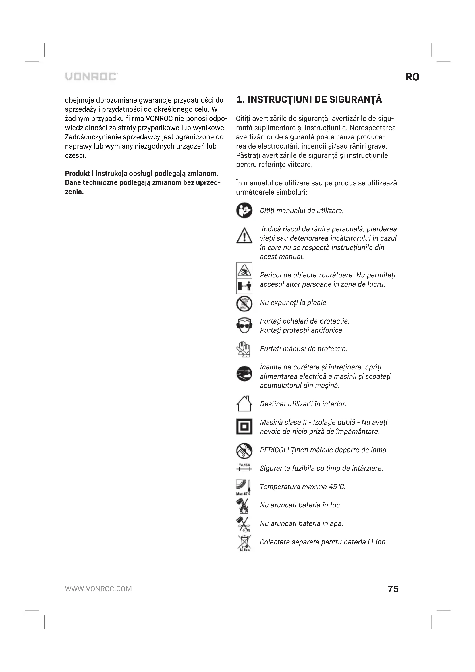 Aparatele electrice sau electronice deteriorate si/sau defecte trebuie colectate în locurile de reciclare corespunzatoare. Numai pentru tarile din CE Nu aruncati echipamentele actionate electric împreuna cu gunoiul menajer. Conform Indicatiei europene 2012/19/EU pentru echipamente electrice si electronice uzate si a implementarii sale la nivel national, echipamentele actionate electric scoase din uz trebuie colectate separat si evacuate într-o maniera ecologica. GARANȚIE Produsele VONROC sunt realizate la cele mai înalte standarde de calitate și sunt garantate în privința materialelor și a manoperei pentru întreaga perioadă de utilizare în garanție, începând cu data achiziției.PT