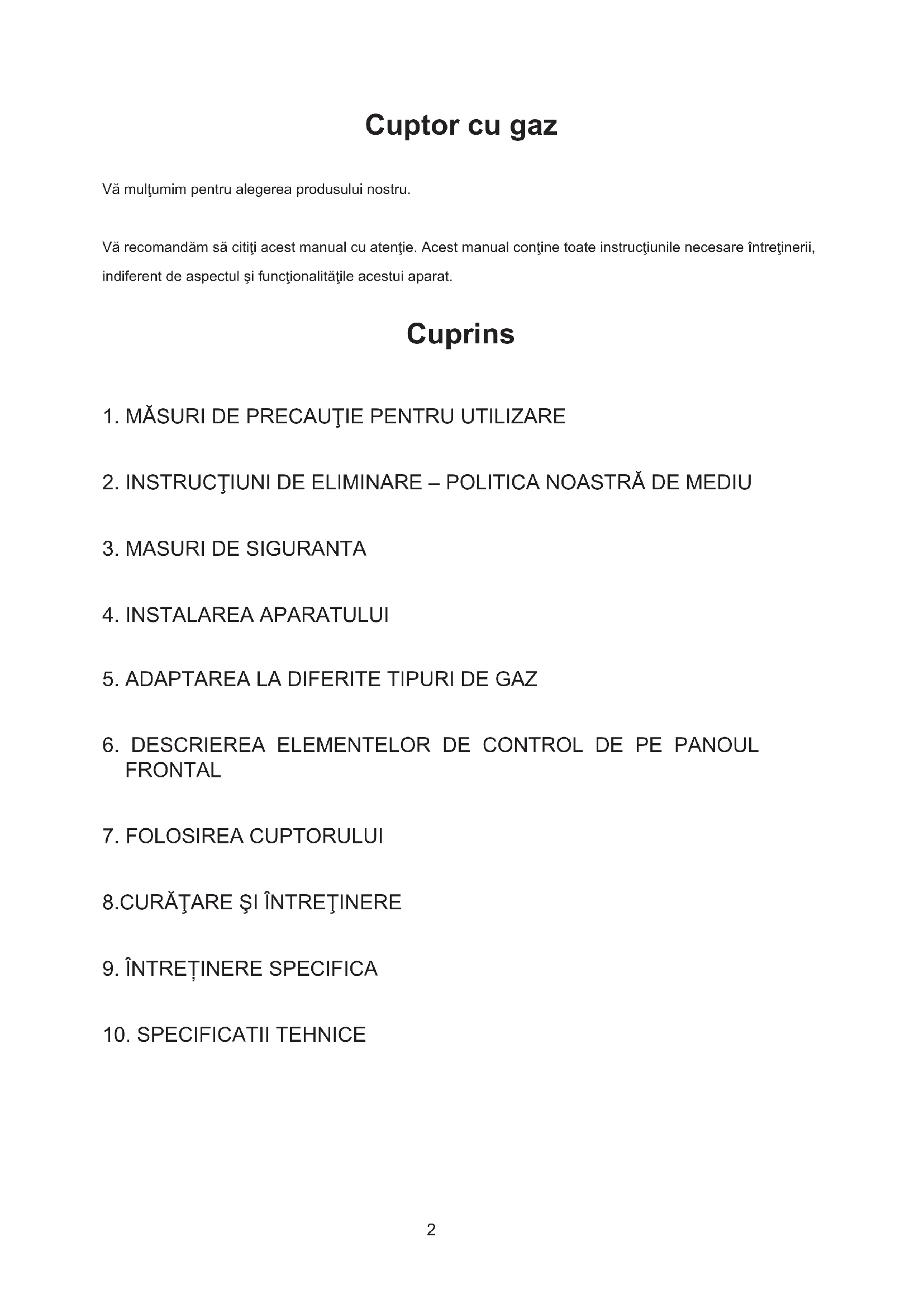 RoO2 Cuptor cu gaz Vă mulţumim pentru alegerea produsului nostru. Vă recomandăm să citiţi acest manual cu atenţie. Acest manual conţine toate instrucţiunile necesare întreţinerii, indiferent de aspectul şi funcţionalităţile acestui aparat. Cuprins