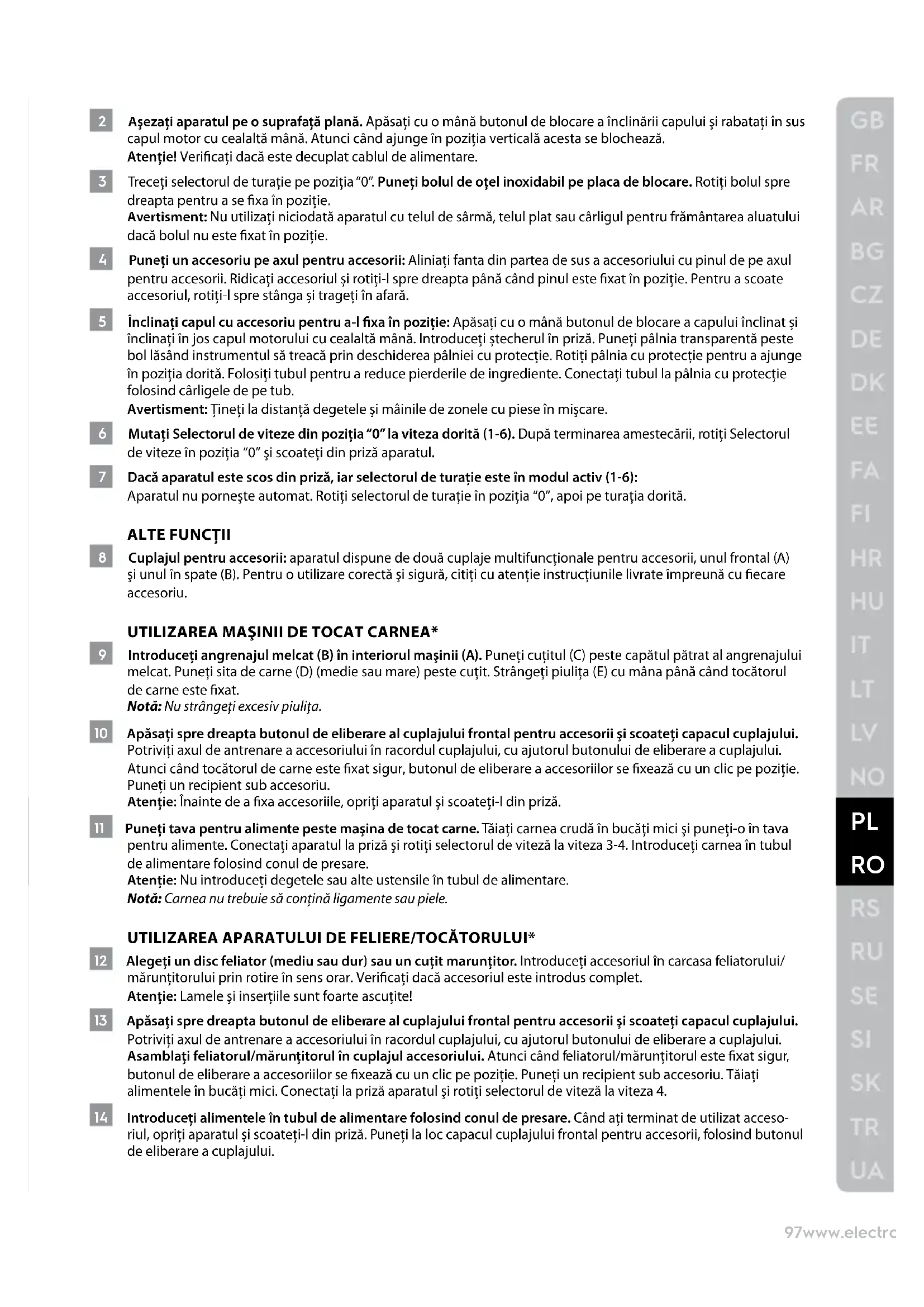 2 Aşezaţi aparatul pe o suprafaţă plană. Apăsaţi cu o mână butonul de blocare a înclinării capului şi rabataţi în sus capul motor cu cealaltă mână. Atunci când ajunge în poziţia verticală acesta se blochează. Atenţie! Vericaţi dacă este decuplat cablul de alimentare. 3 Treceţi selectorul de turaţie pe poziţia “0”. Puneţi bolul de oţel inoxidabil pe placa de blocare. Rotiţi bolul spre dreapta pentru a se xa în poziţie. Avertisment: Nu utilizaţi niciodată aparatul cu telul de sârmă, telul plat sau cârligul pentru frământarea aluatului dacă bolul nu este xat în poziţie. 4 Puneți un accesoriu pe axul pentru accesorii: Aliniați fanta din partea de sus a accesoriului cu pinul de pe axul pentru accesorii. Ridicați accesoriul și rotiți-l spre dreapta până când pinul este xat în poziție. Pentru a scoate accesoriul, rotiți-l spre stânga și trageți în afară. 5 Înclinați capul cu accesoriu pentru a-l xa în poziție: Apăsați cu o mână butonul de blocare a capului înclinat și înclinați în jos capul motorului cu cealaltă mână. Introduceți ștecherul în priză. Puneți pâlnia transparentă peste bol lăsând instrumentul să treacă prin deschiderea pâlniei cu protecție. Rotiți pâlnia cu protecție pentru a ajunge în poziția dorită. Folosiți tubul pentru a reduce pierderile de ingrediente. Conectați tubul la pâlnia cu protecție folosind cârligele de pe tub. Avertisment: Ţineţi la distanţă degetele şi mâinile de zonele cu piese în mişcare. 6 Mutaţi Selectorul de viteze din poziţia “0” la viteza dorită (1-6). După terminarea amestecării, rotiţi Selectorul de viteze în poziţia “0” şi scoateţi din priză aparatul. 7 Dacă aparatul este scos din priză, iar selectorul de turaţie este în modul activ (1-6): Aparatul nu porneşte automat. Rotiţi selectorul de turaţie în poziţia “0”, apoi pe turaţia dorită.