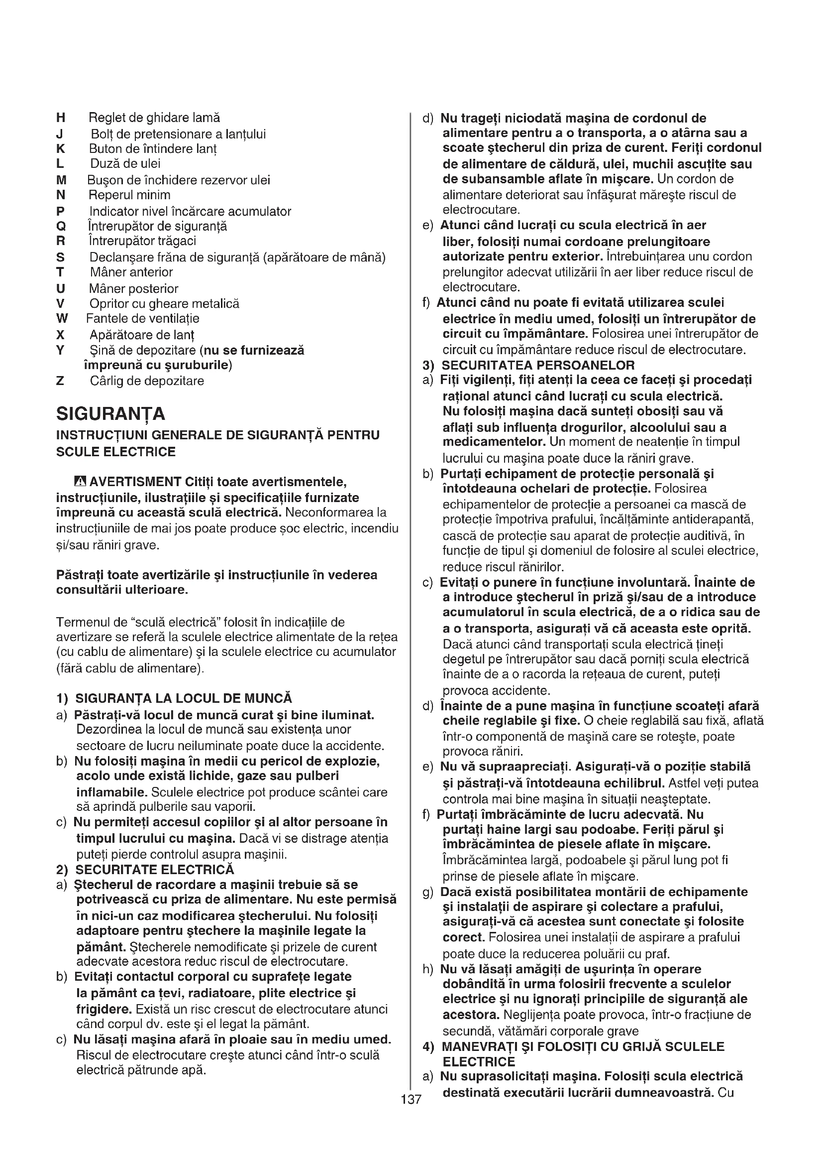 ELECTRICE a) Nu suprasolicitaţi maşina. Folosiţi scula electrică destinată executării lucrării dumneavoastră. Cu H Reglet de ghidare lamă J Bolţ de pretensionare a lanţului K Buton de întindere lanţ L Duză de ulei M Buşon de închidere rezervor ulei N Reperul minim P Indicator nivel încărcare acumulator Q Întrerupător de siguranţă R Întrerupător trăgaci S Declanşare frăna de siguranţă (apărătoare de mână) T Mâner anterior U Mâner posterior V Opritor cu gheare metalică W Fantele de ventilaţie X Apărătoare de lanţ Y Şină de depozitare (nu se furnizează împreună cu şuruburile) Z Cârlig de depozitare SIGURANŢA