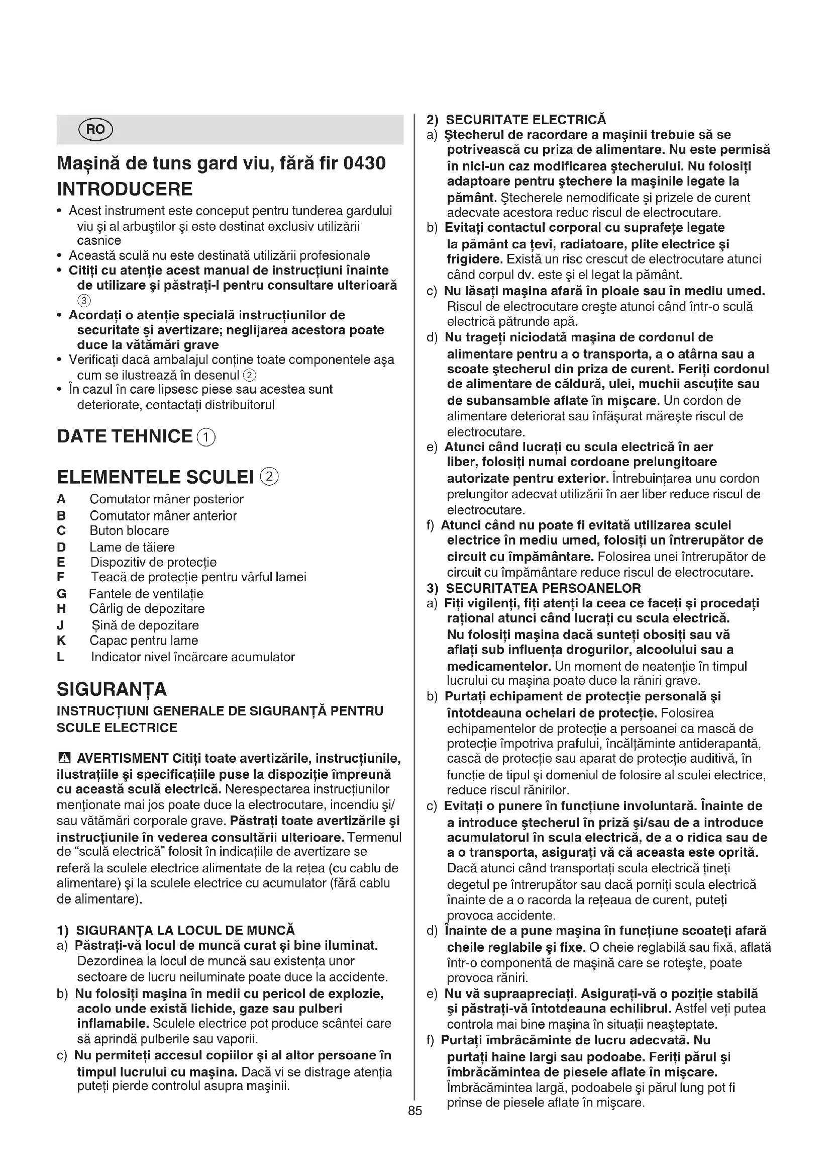 A Comutator mâner posterior B Comutator mâner anterior C Buton blocare D Lame de tăiere E Dispozitiv de protecţie F Teacă de protecţie pentru vârful lamei G Fantele de ventilaţie H Cârlig de depozitare J Șină de depozitare K Capac pentru lame L Indicator nivel încărcare acumulator SIGURANŢA