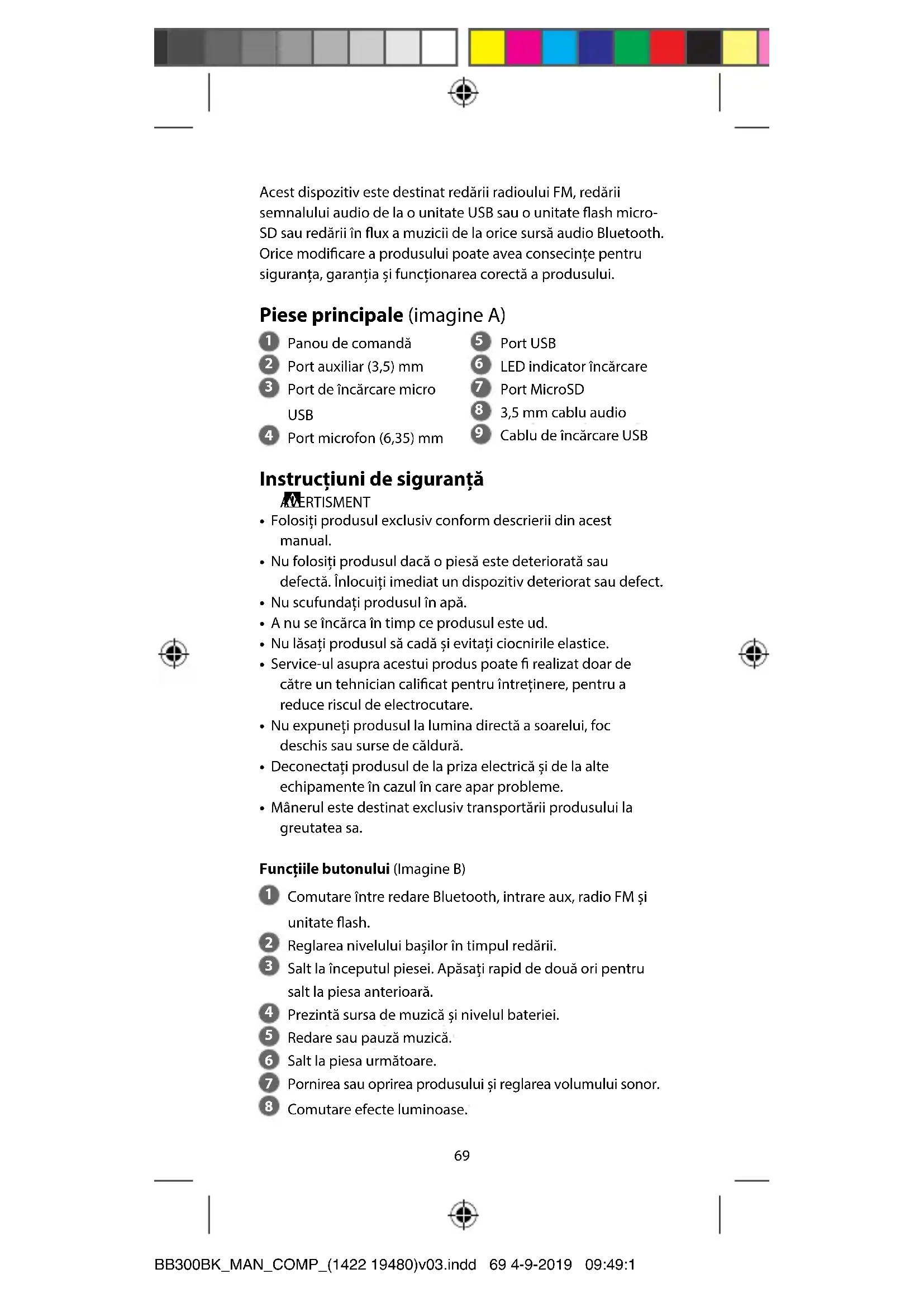 Ghid rapid de inițiere Difuzor Party Boombox SPBB300BK Pentru informații suplimentare, consultați manualul extins, disponibil online: ned.is/spbb300bk Utilizare preconizată Nedis SPBB300BK este un difuzor Party boombox cu radio FM încorporat, care poate reda audio de la dispozitivul media prin intermediul Bluetooth sau de la o unitate USB sau o unitate ash micro-SD. SPBB300BK_MAN_COMP_(1422 19480)v03.indd 68 4-9-2019 09:49:1469 Acest dispozitiv este destinat redării radioului FM, redării semnalului audio de la o unitate USB sau o unitate ash micro- SD sau redării în ux a muzicii de la orice sursă audio Bluetooth. Orice modicare a produsului poate avea consecințe pentru siguranța, garanția și funcționarea corectă a produsului. Piese principale (imagine A)