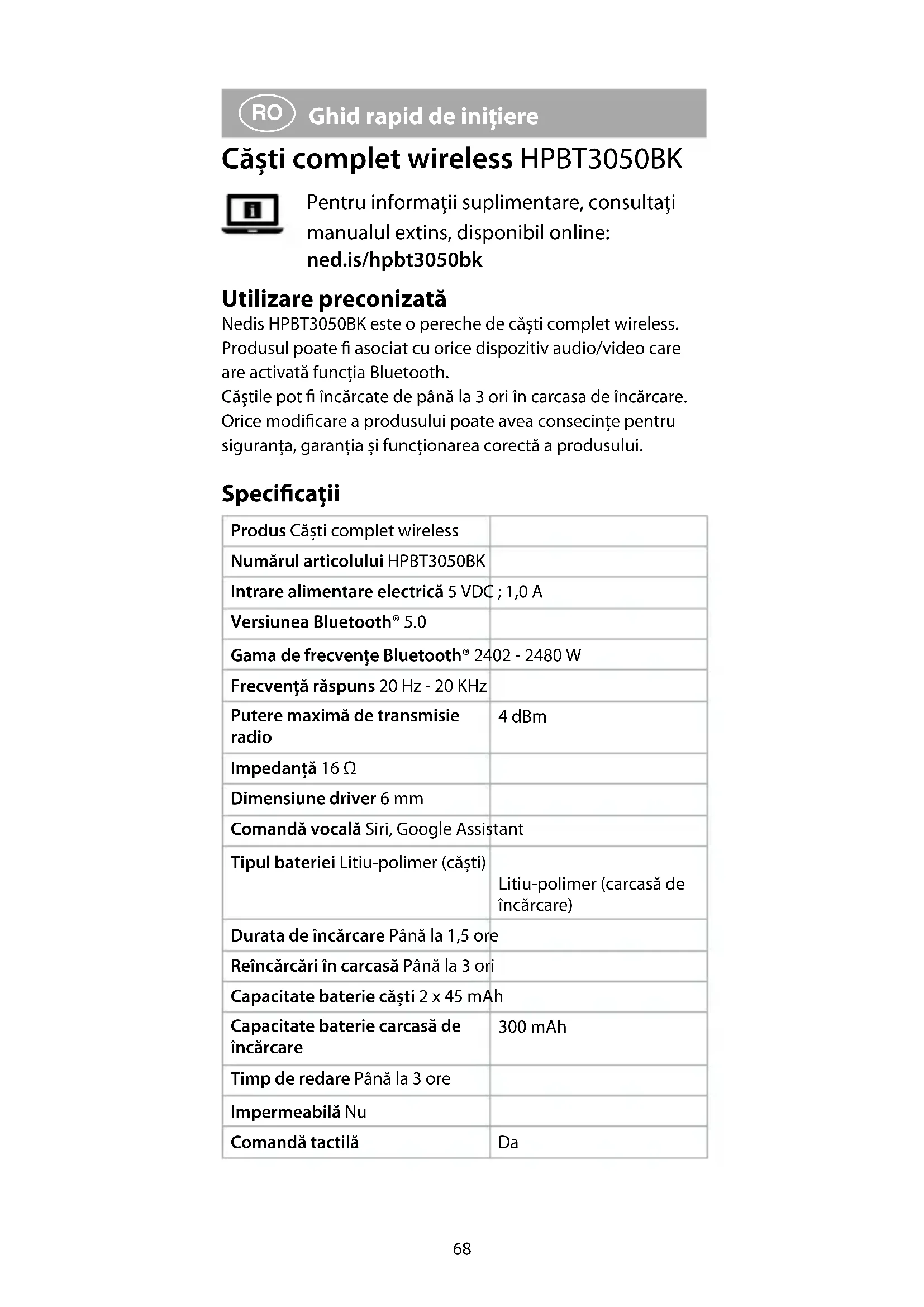 Ghid rapid de inițiere Căști complet wireless HPBT3050BK Pentru informații suplimentare, consultați manualul extins, disponibil online: ned.is/hpbt3050bk Utilizare preconizată Nedis HPBT3050BK este o pereche de căști complet wireless. Produsul poate asociat cu orice dispozitiv audio/video care are activată funcția Bluetooth. Căștile pot încărcate de până la 3 ori în carcasa de încărcare. Orice modicare a produsului poate avea consecințe pentru siguranța, garanția și funcționarea corectă a produsului. Specicaţii Produs Căști complet wireless Numărul articolului HPBT3050BK Intrare alimentare electrică 5 VDC ; 1,0 A Versiunea Bluetooth® 5.0 Gama de frecvențe Bluetooth® 2402 - 2480 W Frecvență răspuns 20 Hz - 20 KHz Putere maximă de transmisie radio 4 dBm Impedanță 16 Ω Dimensiune driver 6 mm Comandă vocală Siri, Google Assistant Tipul bateriei Litiu-polimer (căști) Litiu-polimer (carcasă de încărcare) Durata de încărcare Până la 1,5 ore Reîncărcări în carcasă Până la 3 ori Capacitate baterie căști 2 x 45 mAh Capacitate baterie carcasă de încărcare 300 mAh Timp de redare Până la 3 ore Impermeabilă Nu Comandă tactilă Da69 Piese principale (imagine A)
