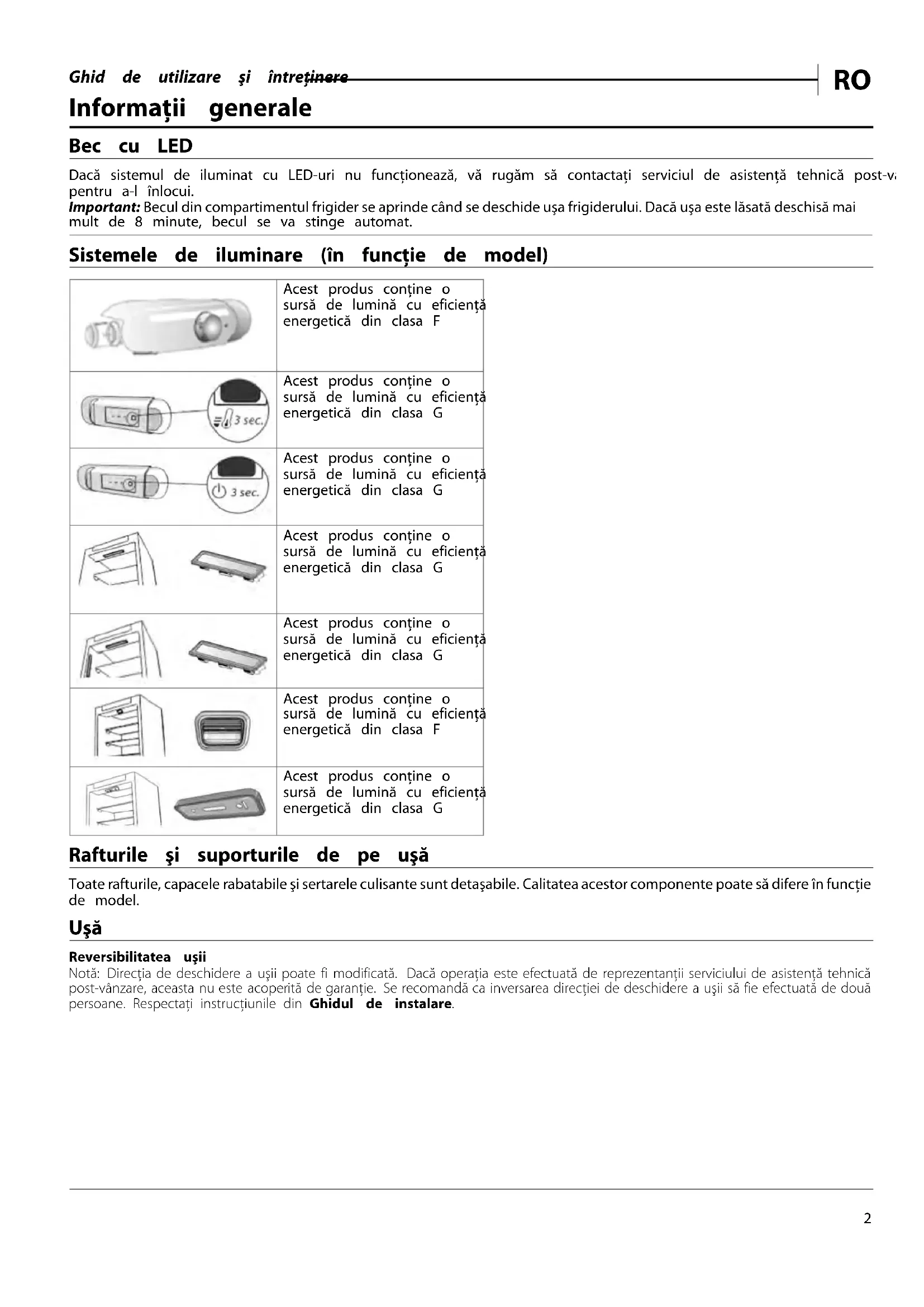 Informaţii generale Bec cu LED Dacă sistemul de iluminat cu LED-uri nu funcţionează, vă rugăm să contactaţi serviciul de asistenţă tehnică post-vânzare pentru a-l înlocui. Important: Becul din compartimentul frigider se aprinde când se deschide uşa frigiderului. Dacă uşa este lăsată deschisă mai mult de 8 minute, becul se va stinge automat. Sistemele de iluminare (în funcţie de model) Acest produs conţine o sursă de lumină cu eficienţă energetică din clasa F Acest produs conţine o sursă de lumină cu eficienţă energetică din clasa G Acest produs conţine o sursă de lumină cu eficienţă energetică din clasa G Acest produs conţine o sursă de lumină cu eficienţă energetică din clasa G Acest produs conţine o sursă de lumină cu eficienţă energetică din clasa G Acest produs conţine o sursă de lumină cu eficienţă energetică din clasa F Acest produs conţine o sursă de lumină cu eficienţă energetică din clasa G Rafturile şi suporturile de pe uşă Toate rafturile, capacele rabatabile şi sertarele culisante sunt detaşabile. Calitatea acestor componente poate să difere în funcţie de model. Uşă Reversibilitatea uşii Notă: Direcţia de deschidere a uşii poate fi modificată. Dacă operaţia este efectuată de reprezentanţii serviciului de asistenţă tehnică post-vânzare, aceasta nu este acoperită de garanţie. Se recomandă ca inversarea direcţiei de deschidere a uşii să fie efectuată de două persoane. Respectaţi instrucţiunile din Ghidul de instalare.Ghid de utilizare şi întreţinere