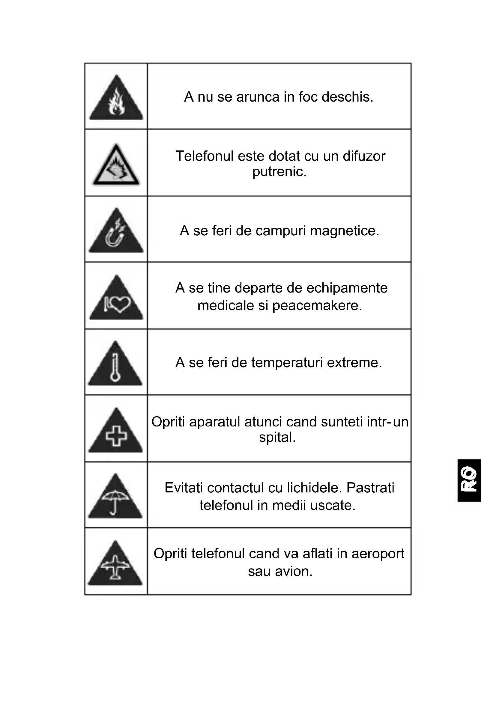 Opriti telefonul cand va aflati in aeroport sau avion. RONu dezasamblati telefonul. Opriti telefonul cand va aflati in apropierea unor materiale sau lichide explozibile.