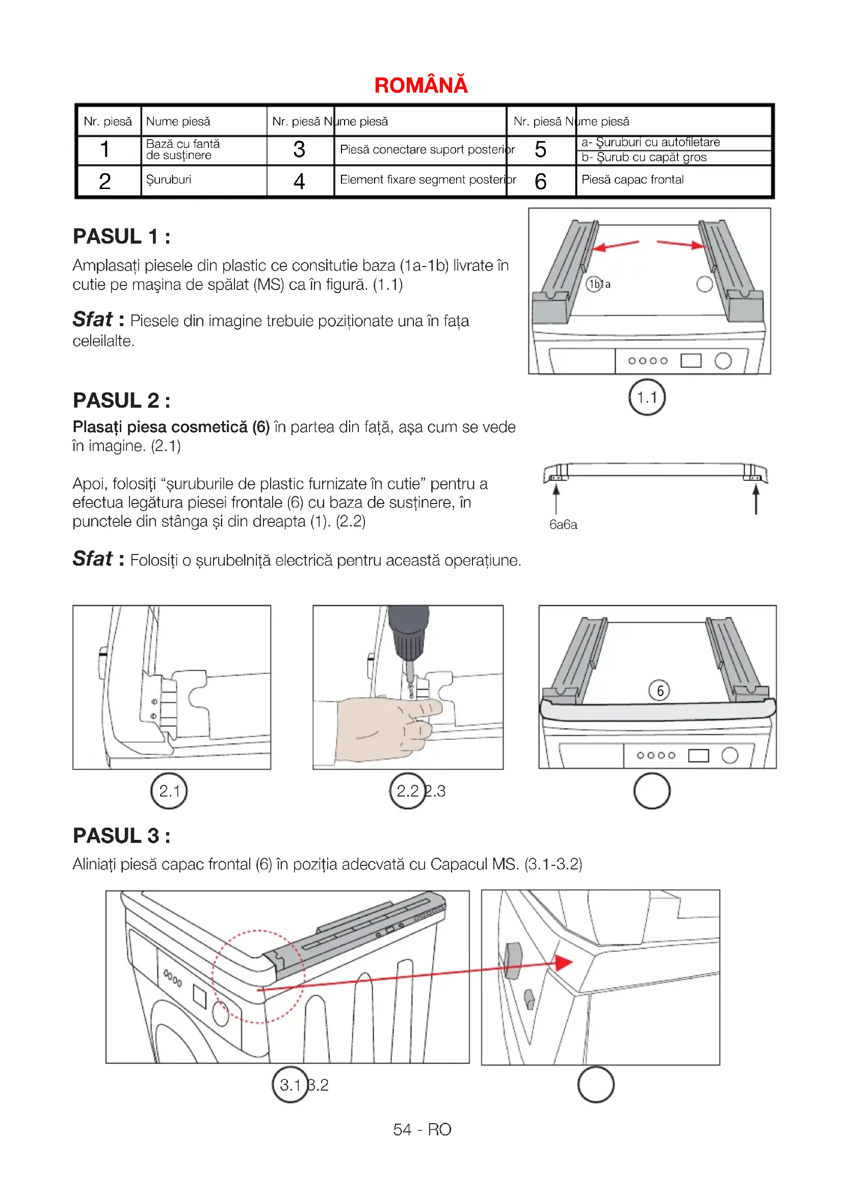 Śrubokrętów elektrycznych używaj tylko do połączeń śrubowych. 4a54 - RO PASUL 1 : Amplasaţi piesele din plastic ce consitutie baza (1a-1b) livrate în cutie pe maşina de spălat (MS) ca în figură. (1.1) Sfat : Piesele din imagine trebuie poziţionate una în faţa celeilalte. PASUL 2 : Plasaţi piesa cosmetică (6) în partea din faţă, aşa cum se vede în imagine. (2.1) Apoi, folosiţi “şuruburile de plastic furnizate în cutie” pentru a efectua legătura piesei frontale (6) cu baza de susţinere, în punctele din stânga şi din dreapta (1). (2.2) Sfat : Folosiţi o şurubelniţă electrică pentru această operaţiune. PASUL 3 : Aliniaţi piesă capac frontal (6) în poziţia adecvată cu Capacul MS. (3.1-3.2) Nr. piesăNume piesă Bază cu fantă de susţinere ŞuruburiNr. piesă Nume piesă Piesă conectare suport posterior Element fixare segment posteriorNr. piesă Nume piesă a- Şuruburi cu autofiletareb- Şurub cu capăt gros Piesă capac frontal1b 1a 6a 6a