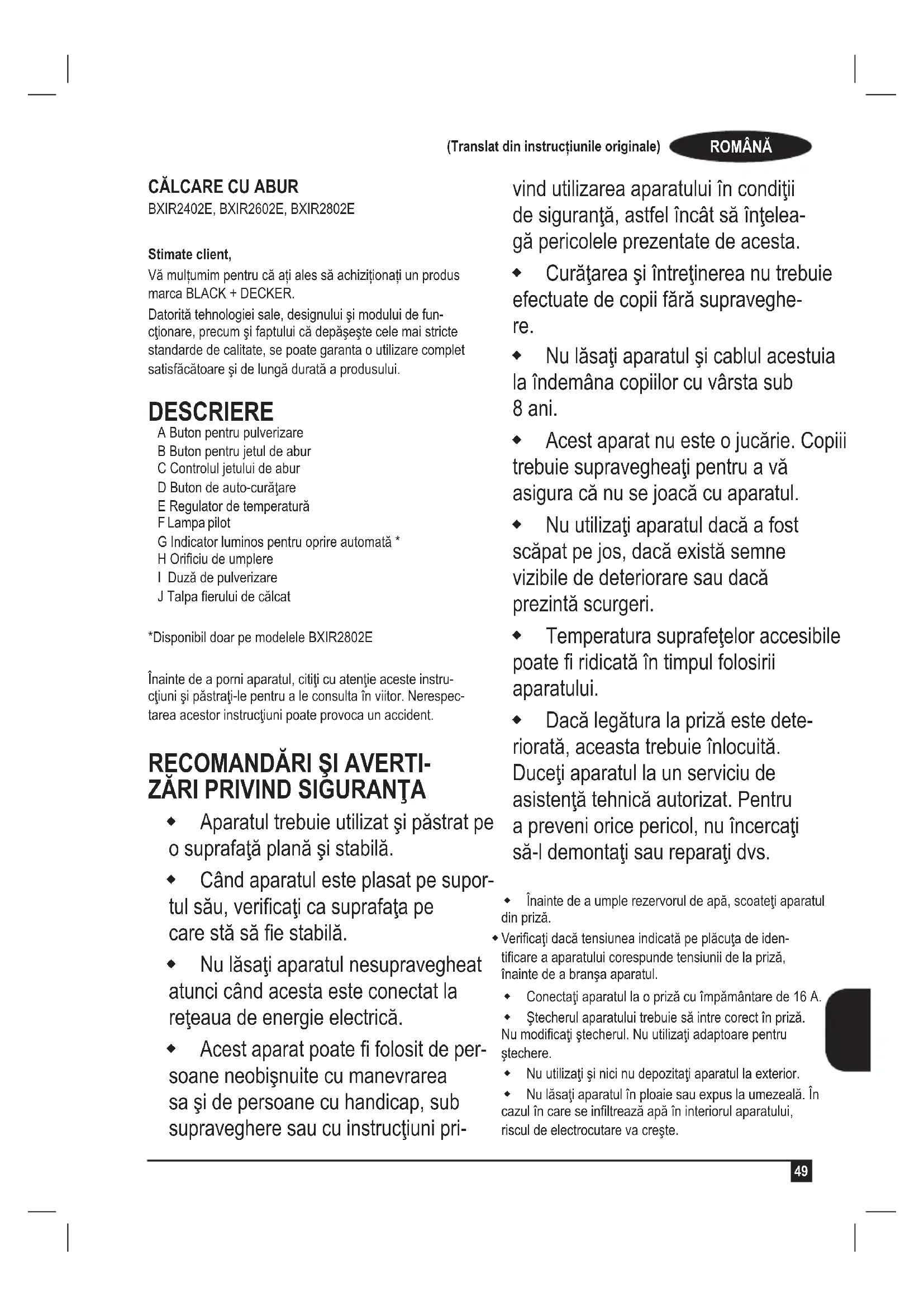 Stimate client, Vă mulțumim pentru că ați ales să achiziționați un produs marca BLACK + DECKER. Datorită tehnologiei sale, designului şi modului de fun- cţionare, precum şi faptului că depăşeşte cele mai stricte standarde de calitate, se poate garanta o utilizare complet satisfăcătoare şi de lungă durată a produsului. DESCRIERE A Buton pentru pulverizare B Buton pentru jetul de abur C Controlul jetului de abur D Buton de auto-curăţare E Regulator de temperatură F Lampa pilot G Indicator luminos pentru oprire automată * H Oriciu de umplere I Duză de pulverizare J Talpa erului de călcat *Disponibil doar pe modelele BXIR2802E Înainte de a porni aparatul, citiţi cu atenţie aceste instru- cţiuni şi păstraţi-le pentru a le consulta în viitor. Nerespec- tarea acestor instrucţiuni poate provoca un accident.
