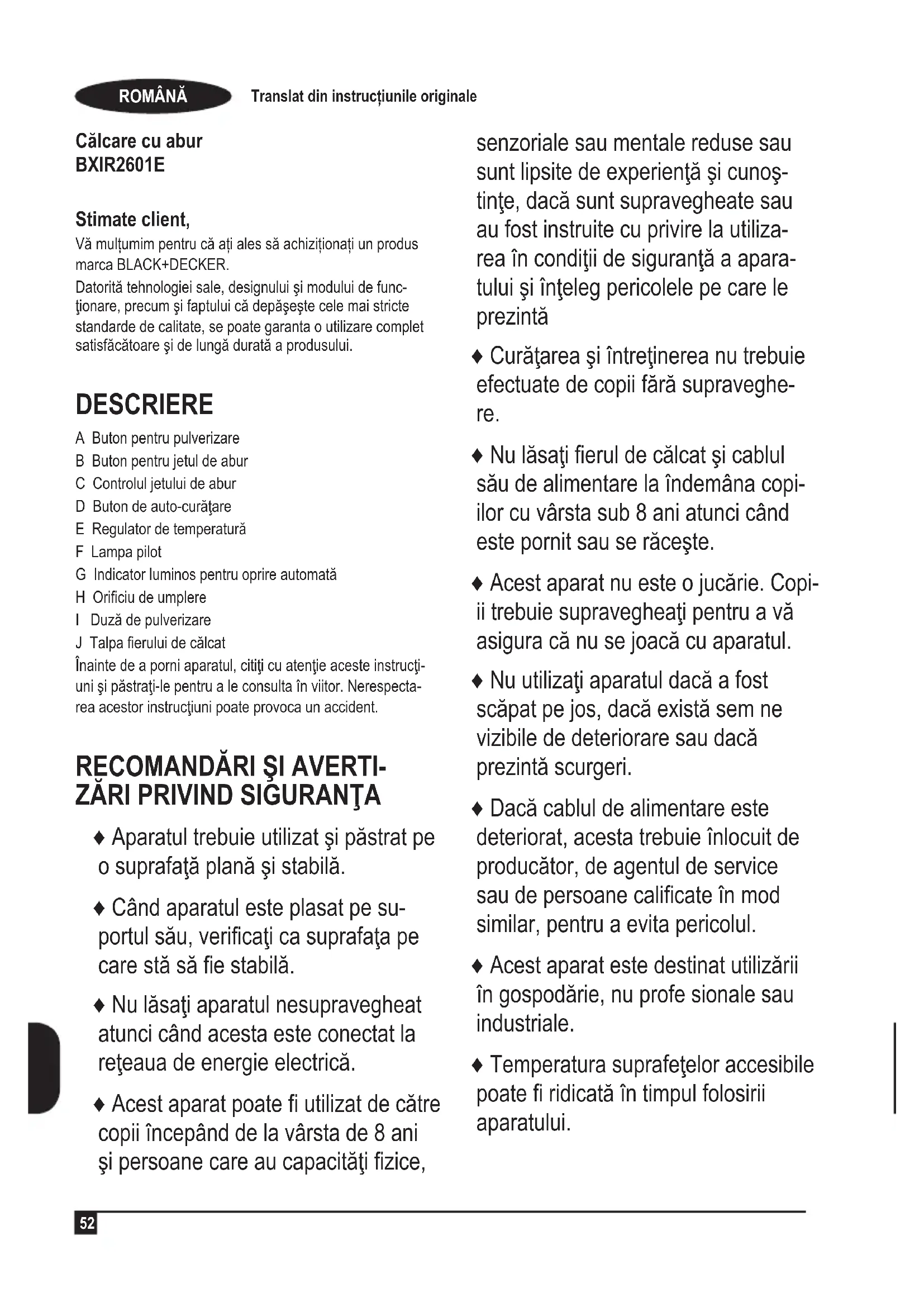 Călcare cu abur BXIR2601E Stimate client, Vă mulțumim pentru că ați ales să achiziționați un produs marca BLACK+DECKER. Datorită tehnologiei sale, designului şi modului de func- ţionare, precum şi faptului că depăşeşte cele mai stricte standarde de calitate, se poate garanta o utilizare complet satisfăcătoare şi de lungă durată a produsului. DESCRIERE A Buton pentru pulverizare B Buton pentru jetul de abur C Controlul jetului de abur D Buton de auto-curăţare E Regulator de temperatură F Lampa pilot G Indicator luminos pentru oprire automată H Oriciu de umplere I Duză de pulverizare J Talpa erului de călcat Înainte de a porni aparatul, citiţi cu atenţie aceste instrucţi- uni şi păstraţi-le pentru a le consulta în viitor. Nerespecta- rea acestor instrucţiuni poate provoca un accident.