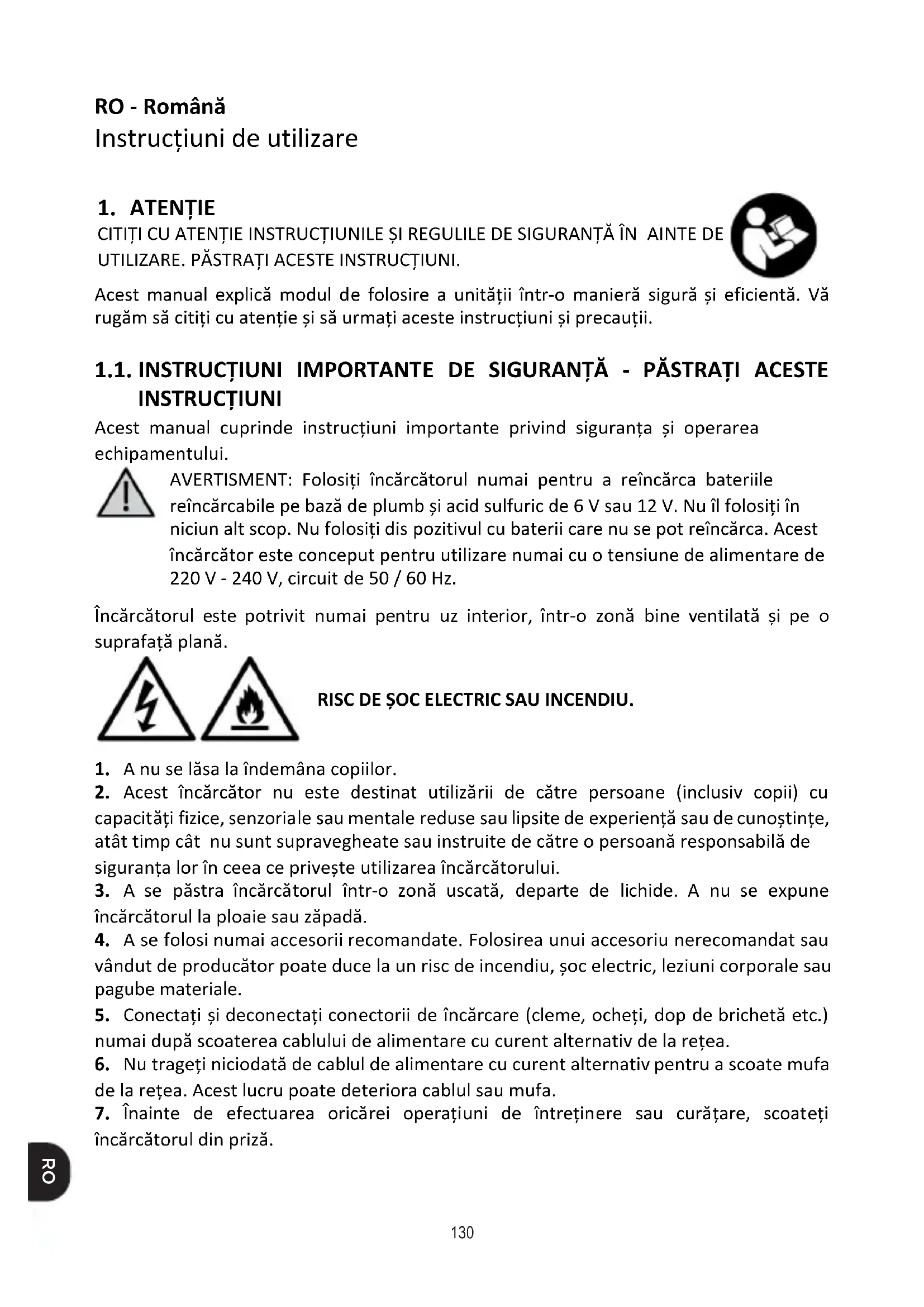 Acest manual explică modul de folosire a unității într-o manieră sigură și eficientă. Vă rugăm să citiți cu atenție și să urmați aceste instrucțiuni și precauții. 1.1. INSTRUCȚIUNI IMPORTANTE DE SIGURANȚĂ - PĂSTRAȚI ACESTE INSTRUCȚIUNI Acest manual cuprinde instrucțiuni importante privind siguranța și operarea echipamentului. AVERTISMENT: Folosiți încărcătorul numai pentru a reîncărca bateriile reîncărcabile pe bază de plumb și acid sulfuric de 6 V sau 12 V. Nu îl folosiți în niciun alt scop. Nu folosiți dis pozitivul cu baterii care nu se pot reîncărca. Acest încărcător este conceput pentru utilizare numai cu o tensiune de alimentare d