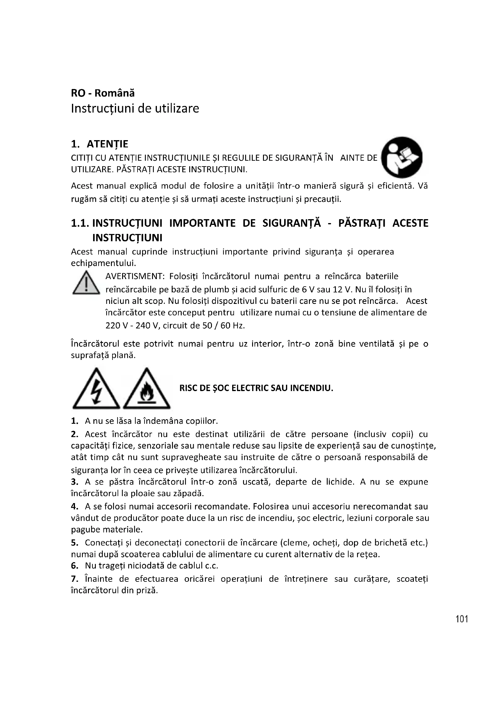 Acest manual explică modul de folosire a unității într-o manieră sigură și eficientă. Vă rugăm să citiți cu atenție și să urmați aceste instrucțiuni și precauții. 1.1. INSTRUCȚIUNI IMPORTANTE DE SIGURANȚĂ - PĂSTRAȚI ACESTE INSTRUCȚIUNI Acest manual cuprinde instrucțiuni importante privind siguranța și operarea echipamentului. AVERTISMENT: Folosiți încărcătorul numai pentru a reîncărca bateriile reîncărcabile pe bază de plumb și acid sulfuric de 6 V sau 12 V. Nu îl folosiți în niciun alt scop. Nu folosiți dispozitivul cu baterii care nu se pot reîncărca. Acest încărcător este conceput pentru utilizare numai cu o tensiune de alimentare de 220 V - 240 V, circuit de 50 / 60 Hz.