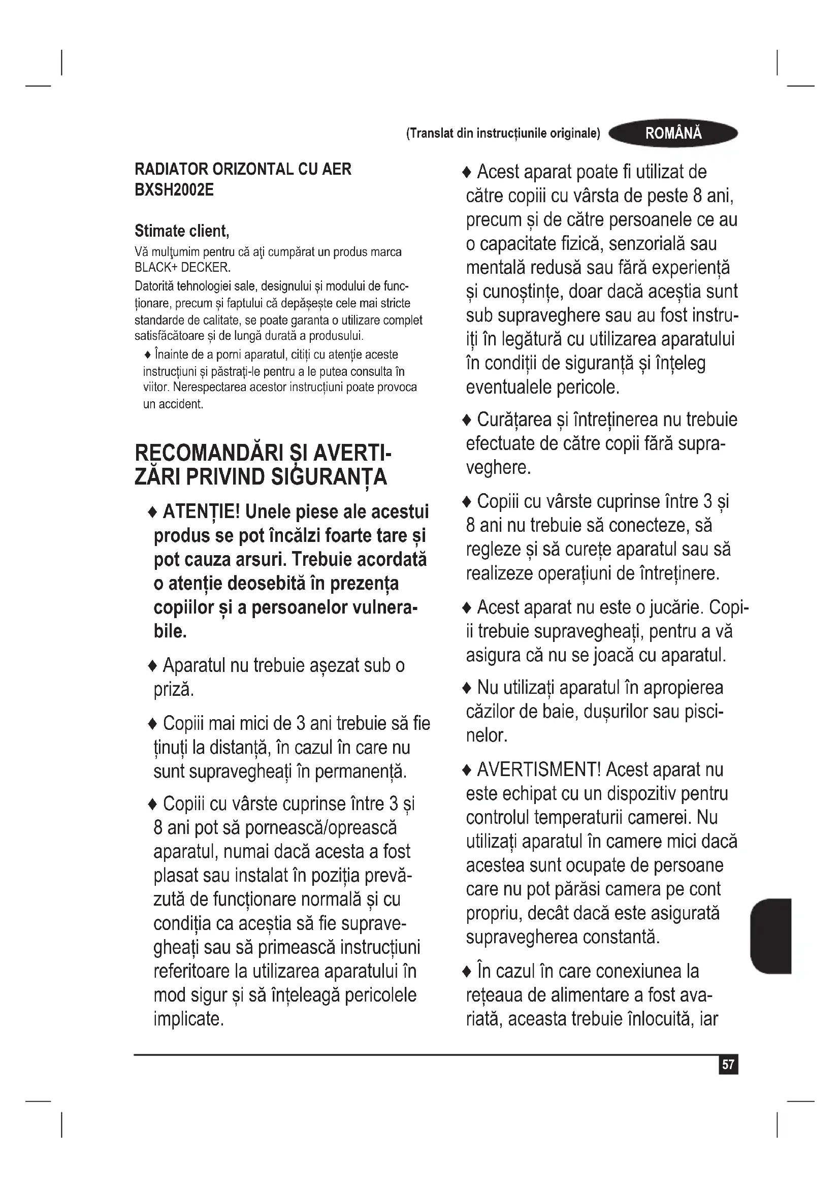BXSH2002E Stimate client, Vă mulţumim pentru că aţi cumpărat un produs marca BLACK+ DECKER. Datorită tehnologiei sale, designului și modului de func- ționare, precum și faptului că depășește cele mai stricte standarde de calitate, se poate garanta o utilizare complet satisfăcătoare și de lungă durată a produsului. ♦ Înainte de a porni aparatul, citiți cu atenție aceste instrucțiuni și păstrați-le pentru a le putea consulta în viitor. Nerespectarea acestor instrucțiuni poate provoca un accident.