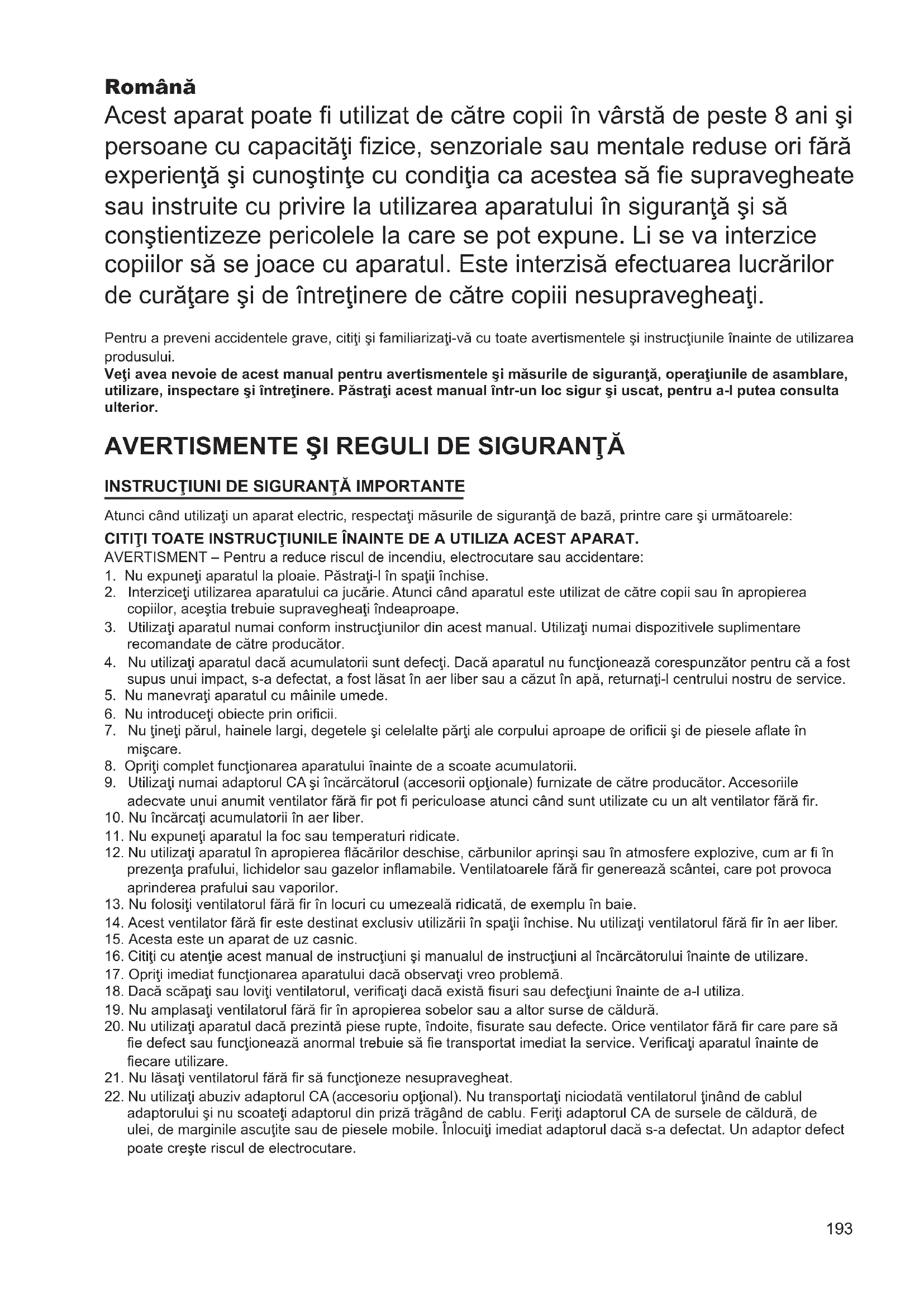 adaptorului şi nu scoateţi adaptorul din priză trăgând de cablu. Feriţi adaptorul CA de sursele de căldură, de ulei, de marginile ascuţite sau de piesele mobile. Înlocuiţi imediat adaptorul dacă s-a defectat. Un adaptor defect poate creşte riscul de electrocutare.194 UTILIZAREA ŞI ÎNTREŢINEREA VENTILATORULUI FĂRĂ FIR
