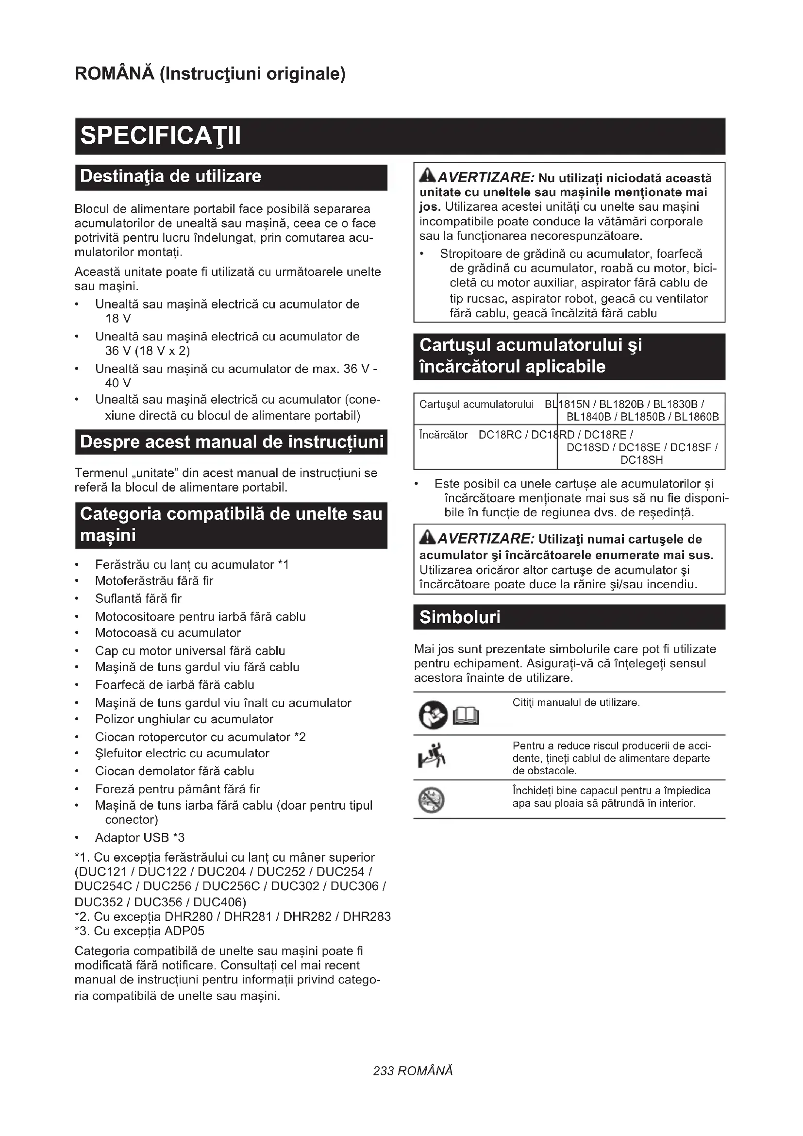 DUC254C/DUC256/DUC256C/DUC302/DUC306/ DUC352/DUC356/DUC406) *2.CuexcepțiaDHR280/DHR281/DHR282/DHR283 *3.CuexcepțiaADP05 Categoriacompatibilădeuneltesaumașinipoate modicatăfărănoticare.Consultațicelmairecent manualdeinstrucțiunipentruinformațiiprivindcatego- riacompatibilădeuneltesaumașini. AVERTIZARE: Nu utilizați niciodată această unitate cu uneltele sau mașinile menționate mai jos.Utilizareaacesteiunitățicuuneltesaumașini incompatibilepoateconducelavătămăricorporale saulafuncționareanecorespunzătoare.
