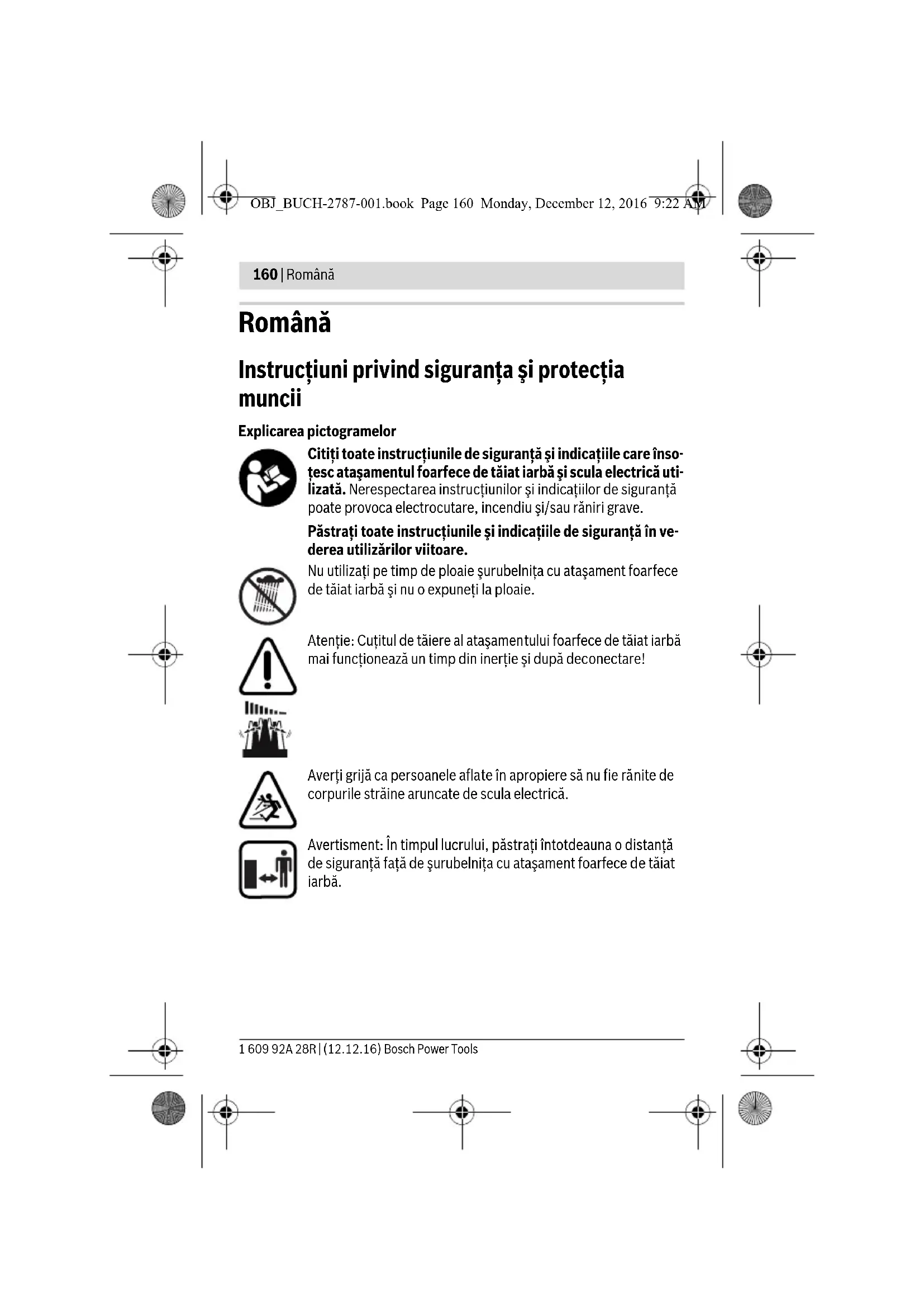 Муратбаев к., 180 үй “Гермес” БО, 7 қабат Тел.: +7 (727) 331 31 00 Факс: +7 (727) 233 07 87 E-Mail: ptka@bosch.com Сервистік қызмет көрсету орталықтары мен қабылдау пунктерінің мекен-жайы туралы толық және өзекті ақпаратты Сіз: www.bosch- professional.kz ресми сайттан ала аласыз Кәдеге жарату Шөп кесу қондырмасын, оның жабдықтары мен орамасын қоршаған ортаны қорғайтын кәдеге жарату орнына тапсыру қажет. Шөп кесу қондырмаларын үй қоқысына тастамаңыз! Техникалық өзгерістер енгізу құқығы сақталады. OBJ_BUCH-2787-001.book Page 159 Monday, December 12, 2016 9:22 AM1 609 92A 28R | (12.12.16) Bosch Power Tools 160 | Română Română Instrucţiuni privind siguranţa şi protecţia muncii Explicarea pictogramelor Citiţi toate instrucţiunile de siguranţă şi indicaţiile care înso- ţesc ataşamentul foarfece de tăiat iarbă şi scula electrică uti- lizată. Nerespectarea instrucţiunilor şi indicaţiilor de siguranţă poate provoca electrocutare, incendiu şi/sau răniri grave. Păstraţi toate instrucţiunile şi indicaţiile de siguranţă în ve- derea utilizărilor viitoare. Nu utilizaţi pe timp de ploaie şurubelniţa cu ataşament foarfece de tăiat iarbă şi nu o expuneţi la ploaie. Atenţie: Cuţitul de tăiere al ataşamentului foarfece de tăiat iarbă mai funcţionează un timp din inerţie şi după deconectare! Averţi grijă ca persoanele aflate în apropiere să nu fie rănite de corpurile străine aruncate de scula electrică. Avertisment: În timpul lucrului, păstraţi întotdeauna o distanţă de siguranţă faţă de şurubelniţa cu ataşament foarfece de tăiat iarbă. OBJ_BUCH-2787-001.book Page 160 Monday, December 12, 2016 9:22 AMRomână | 161 Bosch Power Tools 1 609 92A 28R | (12.12.16) Instrucţiuni de siguranţă pentru şurubelniţe cu ataşament foarfece de tăiat iarbă Această şurubelniţă cu ataşament foarfece de tăiat iarbă nu este destinată utilizării de către copii şi de către persoane cu capacităţi fizice, senzoriale sau intelectuale limitate sau lipsite de experienţă şi cunoştinţe. Nu folosiţi ataşamentul foarfece de tăiat iar- bă sau şurubelniţa cu ataşament foarfece de tăiat iarbă cât timp în apropiere se află per- soane sau animale de casă. Supravegheaţi copiii pentru ca aceştia să nu se joace cu ataşamentul foarfece de tăiat iarbă sau cu şurubelniţa cu ataşament foar- fece de tăiat iarbă. În caz de neutilizare, demontaţi ataşamentul foarfece de tăiat iarbă de pe şurubelniţă. Aveţi grijă ca atunci când nu-l folosiţi, cuţitul de tăiere să fie acoperit cu protecţia cuţitului. Verificaţi dacă apărătoarea de protecţie a ataşamentului foarfece de tăiat iarbă este în perfectă stare. Apărătoarea de protecţie trebuie să protejeze operatorul împotriva atingerii accidentale a cuţitului de tăiere. Menţineţi cuţitul de tăiere bine ascuţit şi curat. Un cuţit de tăiere bine întreţinut, cu tăişuri ascuţite, se blochează în mai mică măsură şi poate fi condus mai uşor. Nu tăiaţi lemn, beton sau cabluri. Cuţitul de tăiere se toceşte şi se poate bloca. Purtaţi întotdeauna ochelari de protecţie, încălţăminte solidă şi pan- taloni lungi, atunci când lucraţi cu şurubelniţa cu ataşament foarfece de tăiat iarbă. OBJ_BUCH-2787-001.book Page 161 Monday, December 12, 2016 9:22 AM1 609 92A 28R | (12.12.16) Bosch Power Tools 162 | Română Evitaţi o postură corporală anormală şi asiguraţi-vă o poziţie stabilă. Menţineţi-vă în orice moment echilibrul, mai ales în pantă sau pe po- vârnişuri. O poziţie stabilă şi o postură corporală corectă vă permit să controlaţi mai bine în situaţii neaşteptate şurubelniţa cu ataşament foar- fece de tăiat iarbă. Nu alergaţi în timp ce folosiţi sau transportaţi ataşamentul foarfece de tăiat iarbă. În caz de alunecare sau cădere există pericol de rănire. Aduceţi întrerupătorul pornit-oprit în poziţia oprit, comutatorul de schimbare a direcţiei de rotaţie în poziţie mediană şi împingeţi în jos comutatorul de blocare: – înaintea oricăror intervenţii asupra şurubelniţei cu ataşament foarfece de tăiat iarbă (de exemplu schimbarea ataşamentului) cât şi în timpul transportului şi depozitării acesteia, – întotdeauna când vă îndepărtaţi de şurubelniţa cu ataşament forfece de tăiat iarbă, – înaintea eliminării unui blocaj, –când controlaţi, curăţaţi sau lucraţi la şurubelniţa cu ataşament forfece de tăiat iarbă, – după o coliziune cu un corp străin. Controlaţi dacă şurubelniţa cu ata- şament foarfece de tăiat iarbă nu prezintă defecţiuni şi daţi-o la reparat în cazul în care este necesar, – atunci când şurubelniţa cu ataşament foarfece de tăiat iarbă începe să vibreze în mod neobişnuit. Controlaţi imediat şurubelniţa cu ataşa- ment foarfece de tăiat iarbă. Porniţi şurubelniţa cu ataşament foarfece de tăiat iarbă numai după ce mâinile şi picioarele dumneavoastră se vor afla suficient de depar- te de cuţitul de tăiere. Întreţineţi cu grijă şurubelniţa cu ataşament foarfece de tăiat iarbă. Controlaţi dacă componentele mobile funcţionează impecabil şi dacă nu se blochează, sau dacă există piese rupte sau deteriorate astfel în- cât să afecteze funcţionarea şurubelniţei cu ataşament foarfece de tăiat iarbă. Înainte de utilizarea şurubelniţei cu ataşament foarfece de tăiat iarbă, daţi la reparat piesele deteriorate. Cauza multor acci- dente a fost întreţinerea necorespunzătoare a sculelor electrice şi ale ata- şament