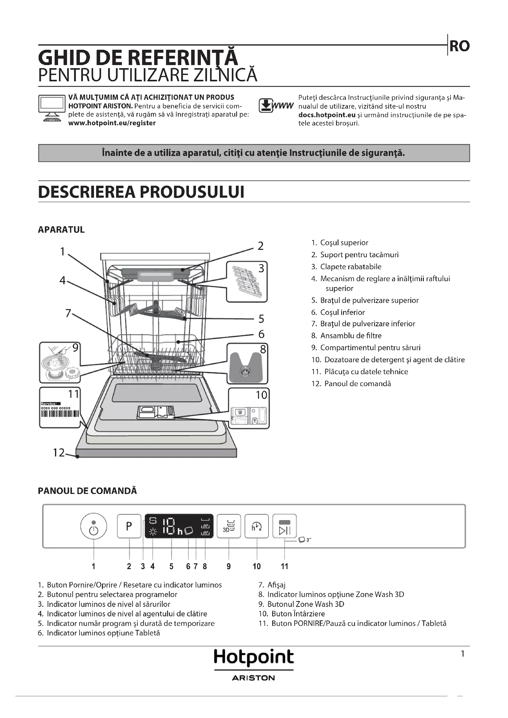 Înainte de a utiliza aparatul, citiţi cu atenţie Instrucţiunile de siguranţă.APARATUL DESCRIEREA PRODUSULUI PANOUL DE COMANDĂVĂ MULŢUMIM CĂ AŢI ACHIZIŢIONAT UN PRODUS HOTPOINT ARISTON. Pentru a beneficia de servicii com-plete de asistenă, vă rugăm să vă înregistrai aparatul pe: www.hotpoint.eu/registerPutei descărca Instruciunile privind sigurana şi Ma-nualul de utilizare, vizitând site-ul nostru docs.hotpoint.eu şi urmând instruciunile de pe spa-tele acestei broşuri.1. Coşul superior2. Suport pentru tacâmuri3. Clapete rabatabile4. Mecanism de reglare a înălimii raftului superior5. Braul de pulverizare superior6. Coşul inferior7. Braul de pulverizare inferior8. Ansamblu de ltre9. Compartimentul pentru săruri10. Dozatoare de detergent şi agent de clătire11. Plăcua cu datele tehnice12. Panoul de comandă1. Buton Pornire/Oprire / Resetare cu indicator luminos2. Butonul pentru selectarea programelor3. Indicator luminos de nivel al sărurilor4. Indicator luminos de nivel al agentului de clătire5. Indicator număr program și durată de temporizare6. Indicator luminos opiune Tabletă7. Aşaj8. Indicator luminos opiune Zone Wash 3D9. Butonul Zone Wash 3D10. Buton Întârziere11. Buton PORNIRE/Pauză cu indicator luminos / Tabletă0000 000 00000 Service:
