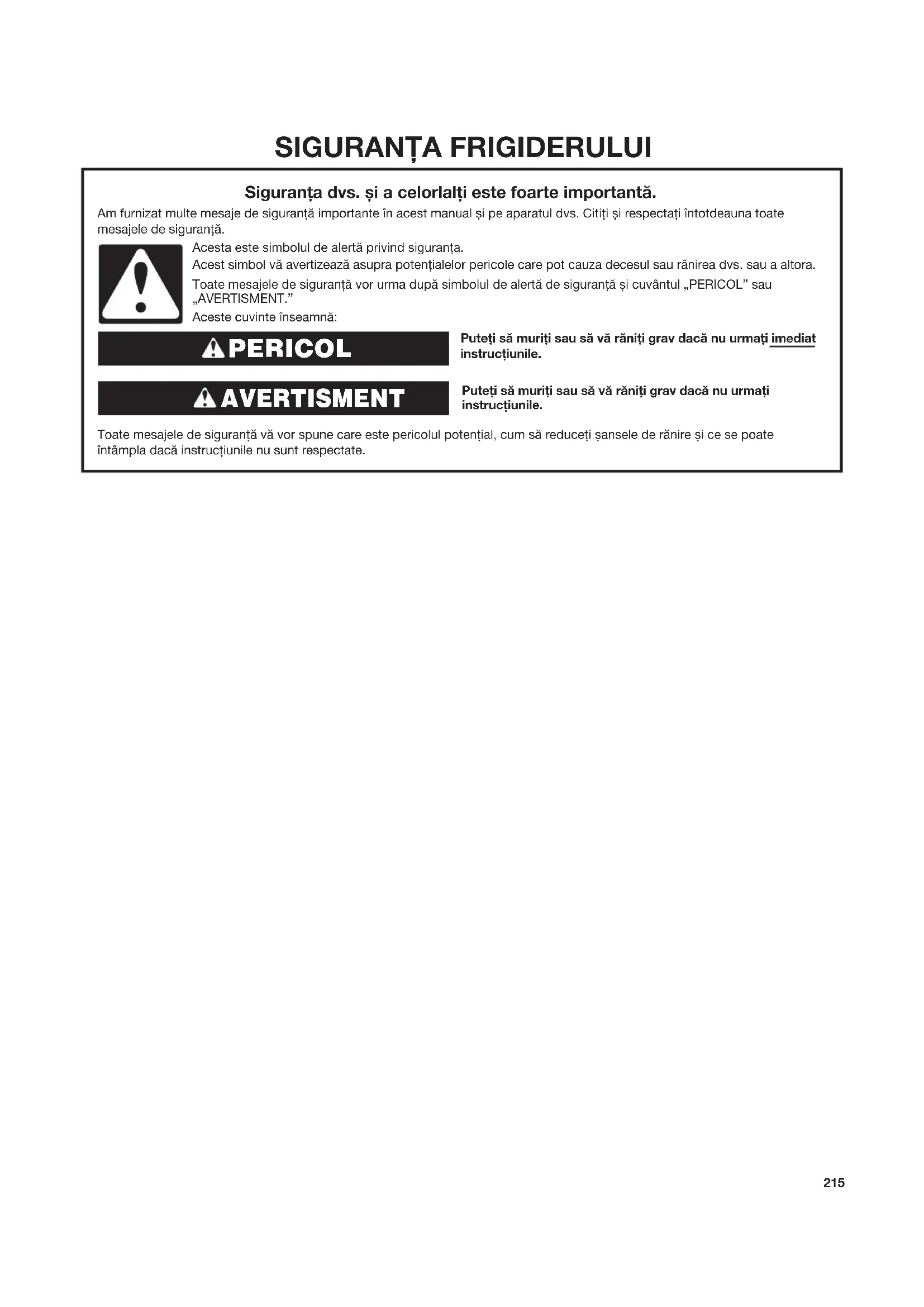 Puteți să muriți sau să vă răniți grav dacă nu urmați imediat instrucțiunile. Puteți să muriți sau să vă răniți grav dacă nu urmați instrucțiunile. Toate mesajele de siguranță vă vor spune care este pericolul potențial, cum să reduceți șansele de rănire și ce se poate întâmpla dacă instrucțiunile nu sunt respectate. Siguranța dvs. și a celorlalți este foarte importantă. Am furnizat multe mesaje de siguranță importante în acest manual și pe aparatul dvs. Citiți și respectați întotdeauna toate mesajele de siguranță. Acesta este simbolul de alertă privind siguranța. Acest simbol vă avertizează asupra potențialelor pericole care pot cauza decesul sau rănirea dvs. sau a altora. Toate mesajele de siguranță vor urma după simbolul de alertă de siguranță și cuvântul „PERICOL” sau „AVERTISMENT.” Aceste cuvinte înseamnă: PERICOL AVERTISMENT216
