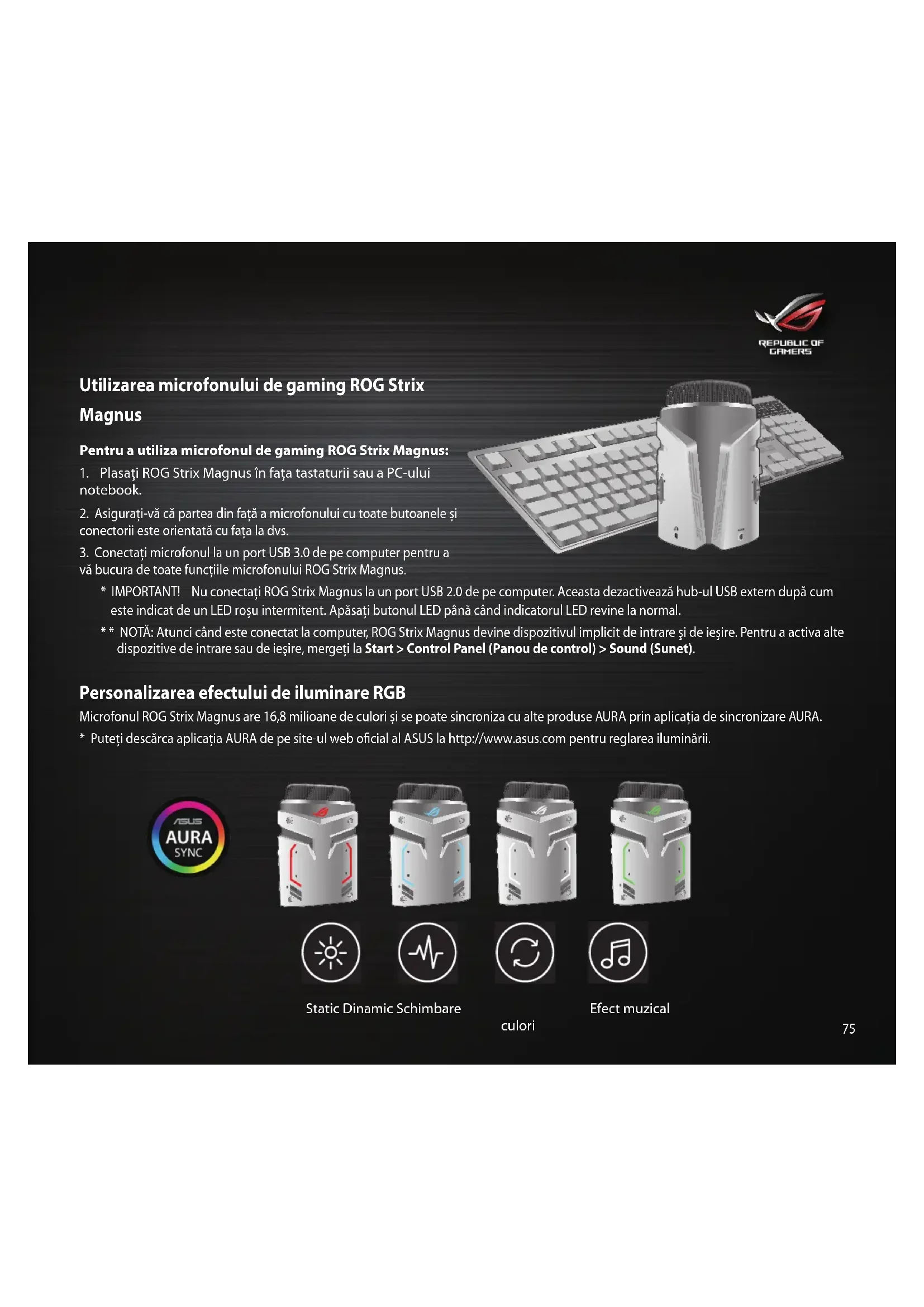 - * NOTĂ: Atunci când este conectat la computer, ROG Strix Magnus devine dispozitivul implicit de intrare şi de ieşire. Pentru a activa alte dispozitive de intrare sau de ieşire, mergeți la Start > Control Panel (Panou de control) > Sound (Sunet). Personalizarea efectului de iluminare RGB Microfonul ROG Strix Magnus are 16,8 milioane de culori și se poate sincroniza cu alte produse AURA prin aplicația de sincronizare AURA.