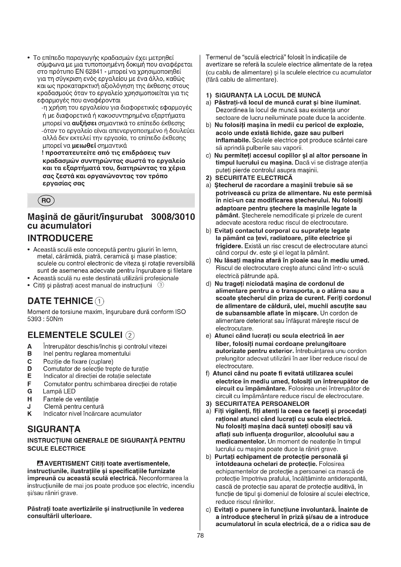 SCULE ELECTRICE - AVERTISMENT Citiţi toate avertismentele, instrucţiunile, ilustraţiile și specicaţiile furnizate împreună cu această sculă electrică. Neconformarea la instrucţiuniile de mai jos poate produce șoc electric, incendiu și/sau răniri grave. Păstraţi toate avertizările şi instrucţiunile în vederea consultării ulterioare.79 trebuie executată. Întrebuinţarea unor scule electrice destinate altor utilizări decât cele preconizate, poate duce la situaţii periculoase. h) Menţineţi mânerele şi zonele de prindere uscate, curate şi feriţi-le de ulei şi unsoare. Mânerele şi zonele de prindere alunecoase nu permit manevrarea şi controlul sigur al sculei electrice în situaţii neaşteptate.