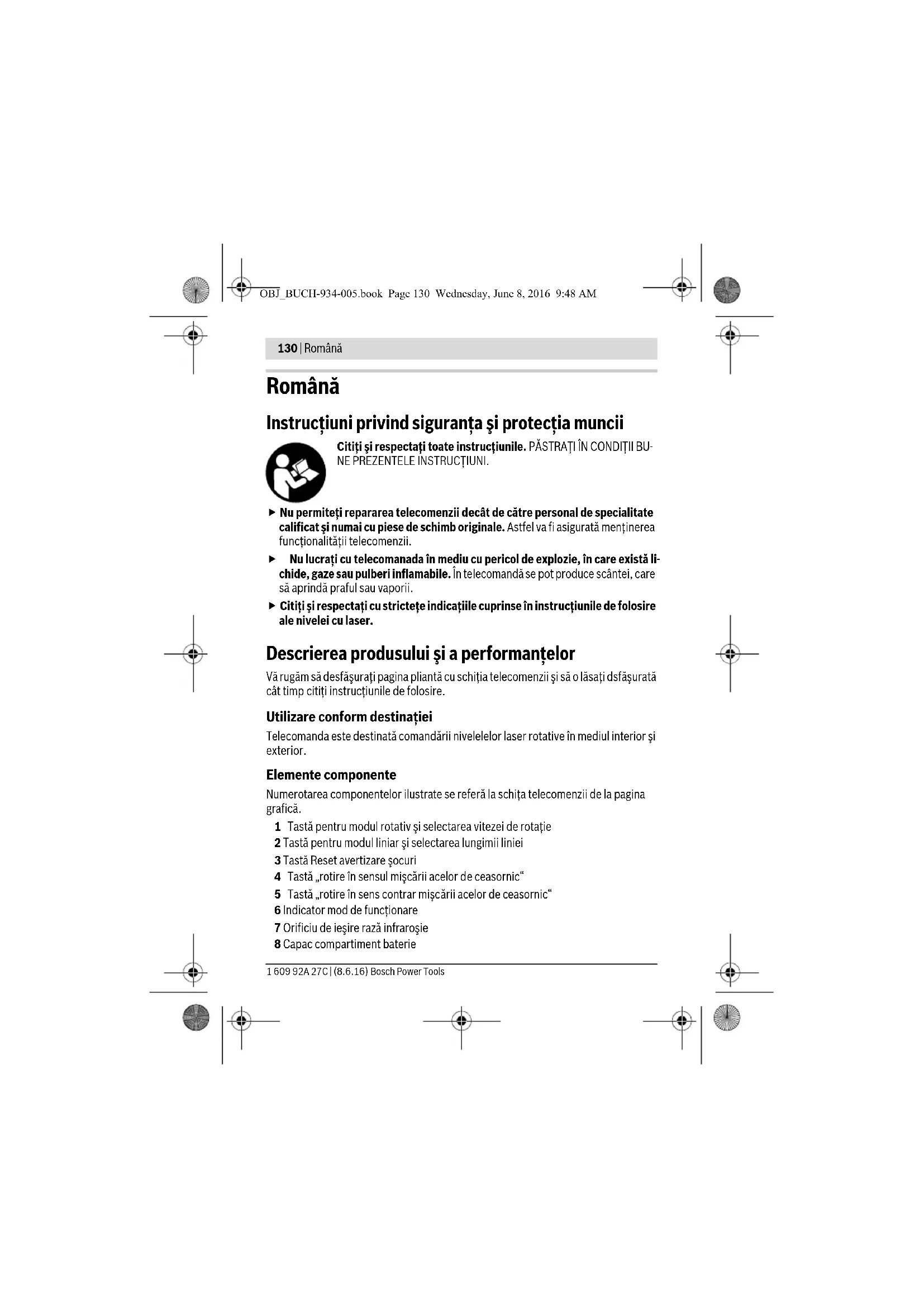 Райымбек данғылы Коммунальная көшесінің бұрышы, 169/1 Тел.: +7 (727) 232 37 07 Факс: +7 (727) 233 07 87 E-Mail: info.powertools.ka@bosch.com Ресми сайты: www.bosch.kz; www.bosch-pt.kz Кәдеге жарату Басқару құрылғысын, оның жабдықтары мен орамасын қоршаған ортаны қорғайтын кәдеге жарату орнына тапсыру қажет. Басқару құрылғысы мен аккумуляторлар/батареяларды үй қоқысына тастамаңыз! Тек қана ЕО елдері үшін: Еуропа 2012/19/EU ережесі бойынша жарамсыз электр құралдары және Еуропа 2006/66/EC ережесі бойынша зақымдалған немесе ескі аккумулятор/батареялар бөлек жиналып, кәдеге жаратылуы қажет. Техникалық өзгерістер енгізу құқығы сақталады. OBJ_BUCH-934-005.book Page 129 Wednesday, June 8, 2016 9:48 AM130 | Română 1 609 92A 27C | (8.6.16) Bosch Power Tools Română Instrucţiuni privind siguranţa şi protecţia muncii Citiţi şi respectaţi toate instrucţiunile. PĂSTRAŢI ÎN CONDIŢII BU- NE PREZENTELE INSTRUCŢIUNI. Nu permiteţi repararea telecomenzii decât de către personal de specialitate calificat şi numai cu piese de schimb originale. Astfel va fi asigurată menţinerea funcţionalităţii telecomenzii. Nu lucraţi cu telecomanada în mediu cu pericol de explozie, în care există li- chide, gaze sau pulberi inflamabile. În telecomandă se pot produce scântei, care să aprindă praful sau vaporii. Citiţi şi respectaţi cu stricteţe indicaţiile cuprinse în instrucţiunile de folosire ale nivelei cu laser. Descrierea produsului şi a performanţelor Vă rugăm să desfăşuraţi pagina pliantă cu schiţia telecomenzii şi să o lăsaţi dsfăşurată cât timp citiţi instrucţiunile de folosire. Utilizare conform destinaţiei Telecomanda este destinată comandării nivelelelor laser rotative în mediul interior şi exterior. Elemente componente Numerotarea componentelor ilustrate se referă la schiţa telecomenzii de la pagina grafică. 1 Tastă pentru modul rotativ şi selectarea vitezei de rotaţie 2 Tastă pentru modul liniar şi selectarea lungimii liniei 3 Tastă Reset avertizare şocuri 4 Tastă „rotire în sensul mişcării acelor de ceasornic“ 5 Tastă „rotire în sens contrar mişcării acelor de ceasornic“ 6 Indicator mod de funcţionare 7 Orificiu de ieşire rază infraroşie 8 Capac compartiment baterie OBJ_BUCH-934-005.book Page 130 Wednesday, June 8, 2016 9:48 AMRomână | 131 Bosch Power Tools 1 609 92A 27C | (8.6.16) 9 Dispozitiv de blocare compartiment baterie 10 Număr de serie Accesoriile ilustrate sau descrise nu sunt incluse în setul de livrare standard. Date tehnice Montare Montarea/schimbarea bateriei Pentru buna funcţionare a telecomenzii se recomandă utilizarea de baterii alcaline cu mangan. Pentru a deschide capacul compartimentului bateriei 8 apăsaţi dispozitivul de bloca- re 9 în direcţia săgeţii şi scoateţi afară capacul compartimentului bateriei. Respectaţi polaritatea corectă, conform schiţei din compartimentul bateriei. Dacă nu veţi folosi telecomanda un timp mai îndelungat, extrageţi bateria din aceasta. Bateria se poate coroda sau autodescărca, în cazul unei depozitări mai în- delungate. Funcţionare Punere în funcţiune Protejaţi telecomanda de umezeală şi radiaţii solare directe. Nu expuneţi telecomanda unor temperaturi extreme sau unor variaţii foarte mari de temperatură. De ex. nu o lăsaţi un timp mai îndelungat în autovehicul. În cazul unor variaţii mai mari de temperatură, lăsaţi telecomanda mai întâi să aclima- tizeze, înainte de a o pune în funcţiune. Telecomandă RC 1 Număr de identificare 3 601 K69 900 Domeniu de lucru