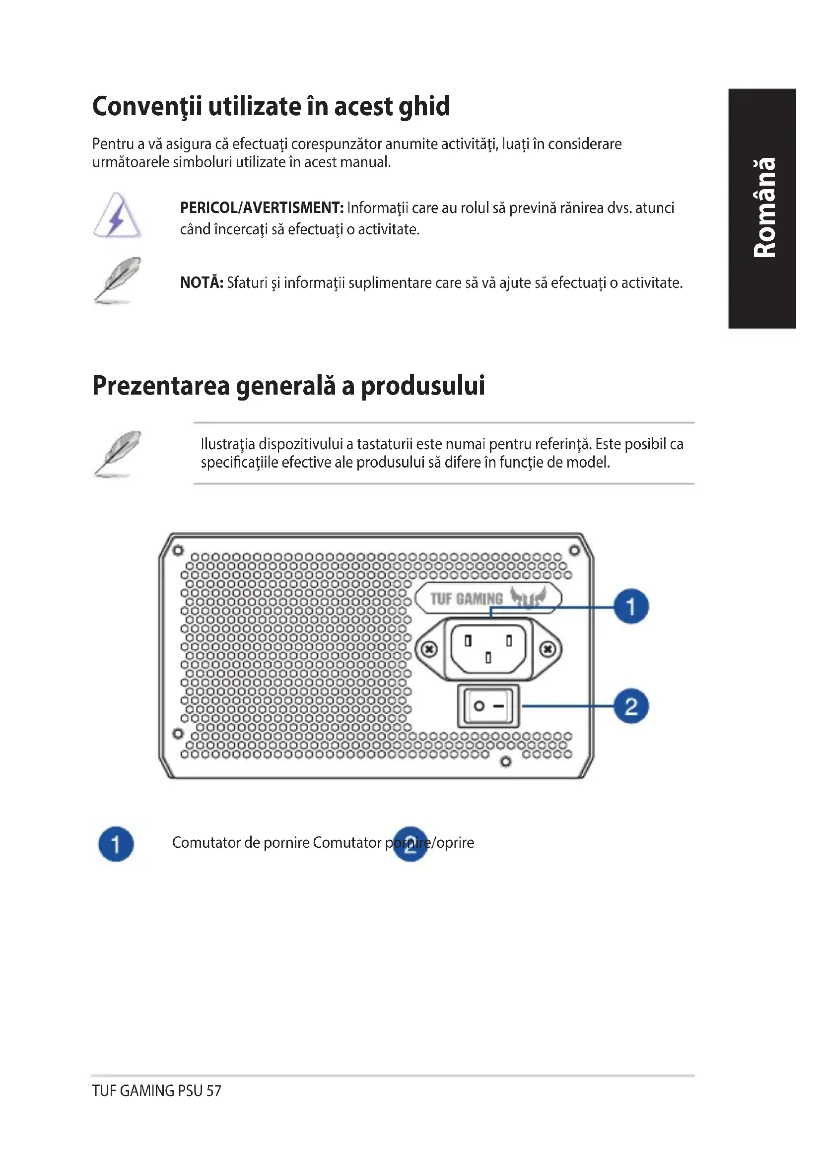 - Nieprzestrzeganie któregokolwiek z zaleceń producenta oraz jakiejkolwiek instrukcji bezpieczeństwa spowoduje natychmiastowe unieważnienie wszystkich gwarancji i rękojmi. R45625 RoHSTUF GAMING PSU 57 Română Convenţii utilizate în acest ghid Pentru a vă asigura că efectuaţi corespunzător anumite activităţi, luaţi în considerare următoarele simboluri utilizate în acest manual. PERICOL/AVERTISMENT: Informaţii care au rolul să prevină rănirea dvs. atunci când încercaţi să efectuaţi o activitate. NOTĂ: Sfaturi şi informaţii suplimentare care să vă ajute să efectuaţi o activitate. Prezentarea generală a produsului Ilustraţia dispozitivului a tastaturii este numai pentru referinţă. Este posibil ca specicaţiile efective ale produsului să difere în funcţie de model. Română Comutator de pornire Comutator pornire/oprireTUF GAMING PSU58 Română Înainte de a instala sau de a scoate cablurile, asiguraţi-vă că sistemul este oprit şi că toate cablurile de alimentare pentru sistem şi toate dispozitivele ataşate sunt deconectate.