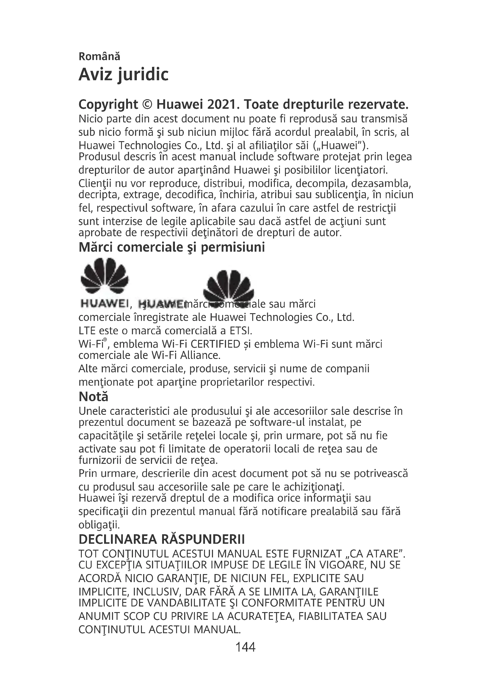 , emblema Wi-Fi CERTIFIED și emblema Wi-Fi sunt mărci comerciale ale Wi-Fi Alliance. Alte mărci comerciale, produse, servicii şi nume de companii menţionate pot aparţine proprietarilor respectivi. Notă Unele caracteristici ale produsului şi ale accesoriilor sale descrise în prezentul document se bazează pe software-ul instalat, pe capacităţile şi setările reţelei locale şi, prin urmare, pot să nu e activate sau pot limitate de operatorii locali de reţea sau de furnizorii de servicii de reţea. Prin urmare, descrierile din acest document pot să nu se potrivească cu produsul sau accesoriile sale pe care le achiziţionaţi. Huawei îşi rezervă dreptul de a modica orice informaţii sau specicaţii din prezentul manual fără noticare prealabilă sau fără obligaţii.