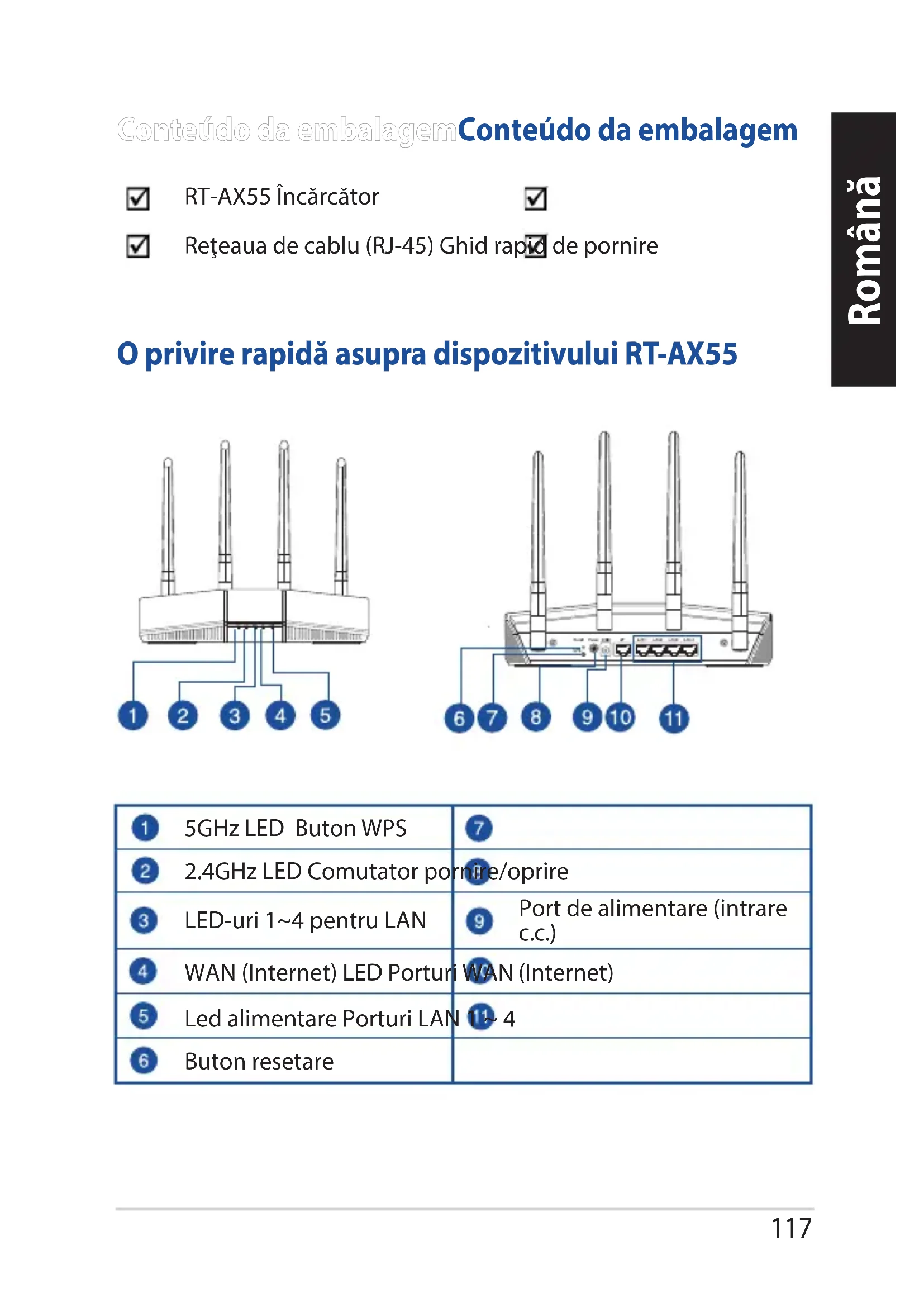 - Руководство пользователя можно скачать со страницы https://www.asus.com/support117 Română O privire rapidă asupra dispozitivului RT-AX55O privire rapidă asupra dispozitivului RT-AX55 Conteúdo da embalagemConteúdo da embalagem RT-AX55 Încărcător Reţeaua de cablu (RJ-45) Ghid rapid de pornire 5GHz LED Buton WPS 2.4GHz LED Comutator pornire/oprire LED-uri 1~4 pentru LAN Port de alimentare (intrare c.c.) WAN (Internet) LED Porturi WAN (Internet) Led alimentare Porturi LAN 1 ~ 4 Buton resetare Română118 Română Poziţionarea ruteruluiPoziţionarea ruterului Pentru transmisia optimă a semnalului fără r între ruterul fără r şi dispozitivele de reţea conectate la acesta, asiguraţi-vă că:
