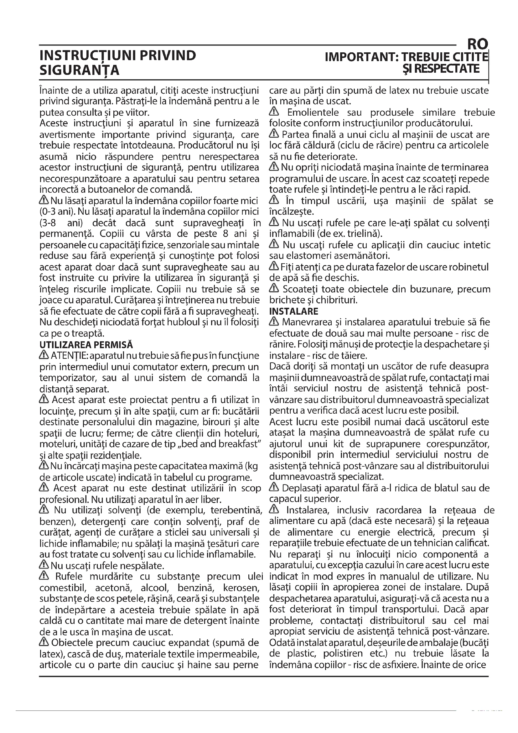 ŞI RESPECTATE Înainte de a utiliza aparatul, citii aceste instruciuni privind sigurana. Păstrai-le la îndemână pentru a le putea consulta i pe viitor. Aceste instruciuni i aparatul în sine furnizează avertismente importante privind sigurana, care trebuie respectate întotdeauna. Producătorul nu îi asumă nicio răspundere pentru nerespectarea acestor instruciuni de sigurană, pentru utilizarea necorespunzătoare a aparatului sau pentru setarea incorectă a butoanelor de comandă. Nu lăsai aparatul la îndemâna copiilor foarte mici (0-3ani). Nu lăsai aparatul la îndemâna copiilor mici (3-8 ani) decât dacă sunt supravegheai în permanenă. Copiii cu vârsta de peste 8 ani i persoanele cu capacităi zice, senzoriale sau mintale reduse sau fără experienă i cunotine pot folosi acest aparat doar dacă sunt supravegheate sau au fost instruite cu privire la utilizarea în sigurană i îneleg riscurile implicate. Copiii nu trebuie să se joace cu aparatul. Curăarea i întreinerea nu trebuie să e efectuate de către copii fără a supravegheai. Nu deschidei niciodată forat hubloul i nu îl folosii ca pe o treaptă. UTILIZAREA PERMISĂ ATENIE: aparatul nu trebuie să e pus în funciune prin intermediul unui comutator extern, precum un temporizator, sau al unui sistem de comandă la distană separat. Acest aparat este proiectat pentru a utilizat în locuine, precum i în alte spaii, cum ar : bucătării destinate personalului din magazine, birouri i alte spaii de lucru; ferme; de către clienii din hoteluri, moteluri, unităi de cazare de tip „bed and breakfast” i alte spaii rezideniale. Nu încărcai maina peste capacitatea maximă (kg de articole uscate) indicată în tabelul cu programe. Acest aparat nu este destinat utilizării în scop profesional. Nu utilizai aparatul în aer liber. Nu utilizai solveni (de exemplu, terebentină, benzen), detergeni care conin solveni, praf de curăat, ageni de curăare a sticlei sau universali i lichide inamabile; nu spălai la maină esături care au fost tratate cu solveni sau cu lichide inamabile. Nu uscai rufele nespălate. Rufele murdărite cu substane precum ulei comestibil, acetonă, alcool, benzină, kerosen, substane de scos petele, răină, ceară i substanele de îndepărtare a acesteia trebuie spălate în apă caldă cu o cantitate mai mare de detergent înainte de a le usca în maina de uscat. Obiectele precum cauciuc expandat (spumă de latex), cască de du, materiale textile impermeabile, articole cu o parte din cauciuc i haine sau perne care au pări din spumă de latex nu trebuie uscate în maina de uscat. Emolientele sau produsele similare trebuie folosite conform instruciunilor producătorului. Partea nală a unui ciclu al mainii de uscat are loc fără căldură (ciclu de răcire) pentru ca articolele să nu e deteriorate. Nu oprii niciodată maina înainte de terminarea programului de uscare. În acest caz scoatei repede toate rufele i întindei-le pentru a le răci rapid. În timpul uscării, ua mainii de spălat se încălzete. Nu uscai rufele pe care le-ai spălat cu solveni inamabili (de ex. trielină). Nu uscai rufele cu aplicaii din cauciuc intetic sau elastomeri asemănători. Fii ateni ca pe durata fazelor de uscare robinetul de apă să e deschis. Scoatei toate obiectele din buzunare, precum brichete i chibrituri. INSTALARE Manevrarea i instalarea aparatului trebuie să e efectuate de două sau mai multe persoane - risc de rănire. Folosii mănui de protecie la despachetare i instalare - risc de tăiere. Dacă dorii să montai un uscător de rufe deasupra mainii dumneavoastră de spălat rufe, contactai mai întâi serviciul nostru de asistenă tehnică post- vânzare sau distribuitorul dumneavoastră specializat pentru a verica dacă acest lucru este posibil. Acest lucru este posibil numai dacă uscătorul este ataat la maina dumneavoastră de spălat rufe cu ajutorul unui kit de suprapunere corespunzător, disponibil prin intermediul serviciului nostru de asistenă tehnică post-vânzare sau al distribuitorului dumneavoastră specializat. Deplasai aparatul fără a-l ridica de blatul sau de capacul superior. Instalarea, inclusiv racordarea la reeaua de alimentare cu apă (dacă este necesară) i la reeaua de alimentare cu energie electrică, precum i reparaiile trebuie efectuate de un tehnician calicat. Nu reparai i nu înlocuii nicio componentă a aparatului, cu excepia cazului în care acest lucru este indicat în mod expres în manualul de utilizare. Nu lăsai copiii în apropierea zonei de instalare. După despachetarea aparatului, asigurai-vă că acesta nu a fost deteriorat în timpul transportului. Dacă apar probleme, contactai distribuitorul sau cel mai apropiat serviciu de asistenă tehnică post-vânzare. Odată instalat aparatul, deeurile de ambalaje (bucăi de plastic, polistiren etc.) nu trebuie lăsate la îndemâna copiilor - risc de asxiere. Înainte de oriceoperaţie de instalare, aparatul trebuie să e deconectat de la reţeaua de alimentare cu energie electrică - risc de electrocutare. În timpul instalării, aveţi grijă ca aparatul să nu deterioreze cablul de alimentare - risc de incendiu sau de electrocutare. Activaţi aparatul numai atunci când instalarea a fost nalizată. Nu instalaţi aparatul într-un loc expus unor condiţii extreme, precum: ventilaţie insucientă, temperaturi sub 5°C sau peste 35°C. La instalarea aparatului, asiguraţi-vă că cele patru picioruşe sunt stabile şi se sprijină pe planşeu, reglându-le după cum este necesar, şi asiguraţi-vă că aparatul este perfect orizontal, folosind o nivelă cu bulă de aer. În cazul în care aparatul este instalat pe podele din lemn sau „otante” (anumite tipuri de parchet şi materiale laminate), xaţi o foaie de placaj de 60 x 60 x 3 cm (cel puţin) pe podea, apoi aşezaţi aparatul peste aceasta. Racordaţi furtunul (furtunurile) de alimentare cu apă la sursa de alimentare cu apă, în conformitate 