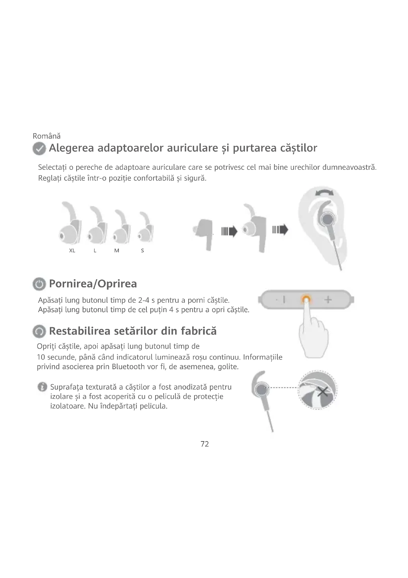 Apăsați butonul pentru a încheia apelul sau apăsați lung butonul timp de 2-4 s pentru a comuta între telefon și căști. În timpul unui apelRedare muzică După încărcare, asigurați-vă că este închis capacul portului Micro-USB, pentru a preveni pătrunderea lichidelor în port și cauzarea unui scurtcircuit. În cazul în care căștile se opresc automat din cauza nivelului scăzut al bateriei și nu sunt încărcate în decurs de 30 de zile, este posibil ca acestea să nu se încarce normal. Notă În timpul încărcării, indicatorul va fi roșu continuu. După ce căștile sunt încărcate complet, indicatorul va fi albastru continuu. Încărcarea Apăsați butonul pentru redare/pauză în timpul redării muzicii. Apăsați lung butonul +/- timp de cel puțin 2 s pentru a comuta melodiile. 75Рельефная поверхность наушников покрыта анодированным слоем и защитной изоляционной пленкой. Не снимайте пленку. Выключите наушники, нажмите и удерживайте кнопку в течение 10 секунд, пока индикатор не загорится красным. Данные о сопряжении по Bluetooth также будут удалены. Восстановление заводских настроек Нажмите и удерживайте кнопку 2–4 секунды, чтобы включить наушники. Нажмите и удерживайте кнопку дольше 4 секунд, чтобы выключить наушники. Включение и выключение Наденьте наушники. Наушники должны плотно сидеть в ушах и не должны доставлять дискомфорт. Выберите подходящие по размеру насадки. Выбор насадок
