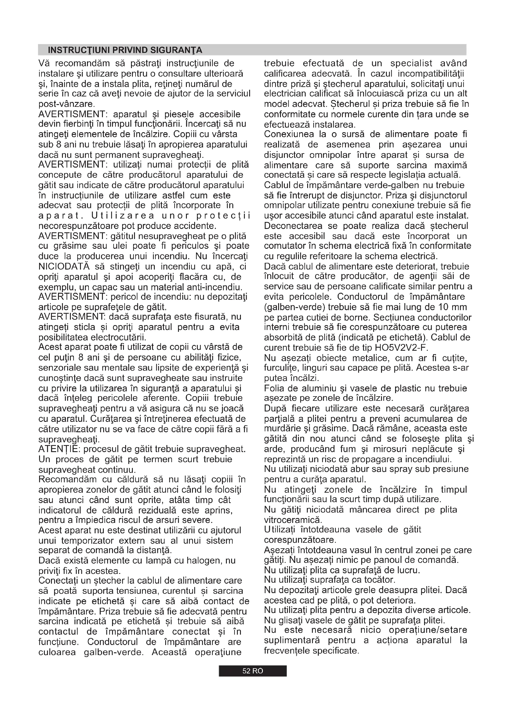 8,7 kW(NG) 8,3 kW(LPG) 829 l/h 604 g/h 220-240 V/ 50-60 Hz52 RO Vă recomandăm să păstraţi instrucţiunile de instalare şi utilizare pentru o consultare ulterioară şi, înainte de a instala plita, reţineţi numărul de serie în caz că aveţi nevoie de ajutor de la serviciul post-vânzare. AVERTISMENT: aparatul şi piesele accesibile devin fierbinţi în timpul funcţionării. Încercaţi să nu atingeţi elementele de încălzire. Copiii cu vârsta sub 8 ani nu trebuie lăsaţi în apropierea aparatului dacă nu sunt permanent supravegheaţi. AVERTISMENT: utilizați numai protecții de plită concepute de către producătorul aparatului de gătit sau indicate de către producătorul aparatului în instrucțiunile de utilizare astfel cum este adecvat sau protecții de plită încorporate în a p a r a t . U t i l i z a r e a u n o r p r o t e c ț i i necorespunzătoare pot produce accidente. AVERTISMENT: gătitul nesupravegheat pe o plită cu grăsime sau ulei poate fi periculos şi poate duce la producerea unui incendiu. Nu încercaţi NICIODATĂ să stingeţi un incendiu cu apă, ci opriţi aparatul şi apoi acoperiţi flacăra cu, de exemplu, un capac sau un material anti-incendiu. AVERTISMENT: pericol de incendiu: nu depozitaţi articole pe suprafeţele de gătit. AVERTISMENT: dacă suprafaţa este fisurată, nu atingeți sticla și opriţi aparatul pentru a evita posibilitatea electrocutării. Acest aparat poate fi utilizat de copii cu vârstă de cel puţin 8 ani şi de persoane cu abilităţi fizice, senzoriale sau mentale sau lipsite de experienţă şi cunoştinţe dacă sunt supravegheate sau instruite cu privire la utilizarea în siguranţă a aparatului şi dacă înţeleg pericolele aferente. Copiii trebuie supravegheaţi pentru a vă asigura că nu se joacă cu aparatul. Curăţarea şi întreţinerea efectuată de către utilizator nu se va face de către copii fără a fi supravegheaţi. ATENȚIE: procesul de gătit trebuie supravegheat. Un proces de gătit pe termen scurt trebuie supravegheat continuu. Recomandăm cu căldură să nu lăsaţi copiii în apropierea zonelor de gătit atunci când le folosiţi sau atunci când sunt oprite, atâta timp cât indicatorul de căldură reziduală este aprins, pentru a împiedica riscul de arsuri severe. Acest aparat nu este destinat utilizării cu ajutorul unui temporizator extern sau al unui sistem separat de comandă la distanţă. Dacă există elemente cu lampă cu halogen, nu priviţi fix în acestea. Conectați un ștecher la cablul de alimentare care să poată suporta tensiunea, curentul și sarcina indicate pe etichetă și care să aibă contact de împământare. Priza trebuie să fie adecvată pentru sarcina indicată pe etichetă și trebuie să aibă contactul de împământare conectat și în funcțiune. Conductorul de împământare are culoarea galben-verde. Această operaţiune